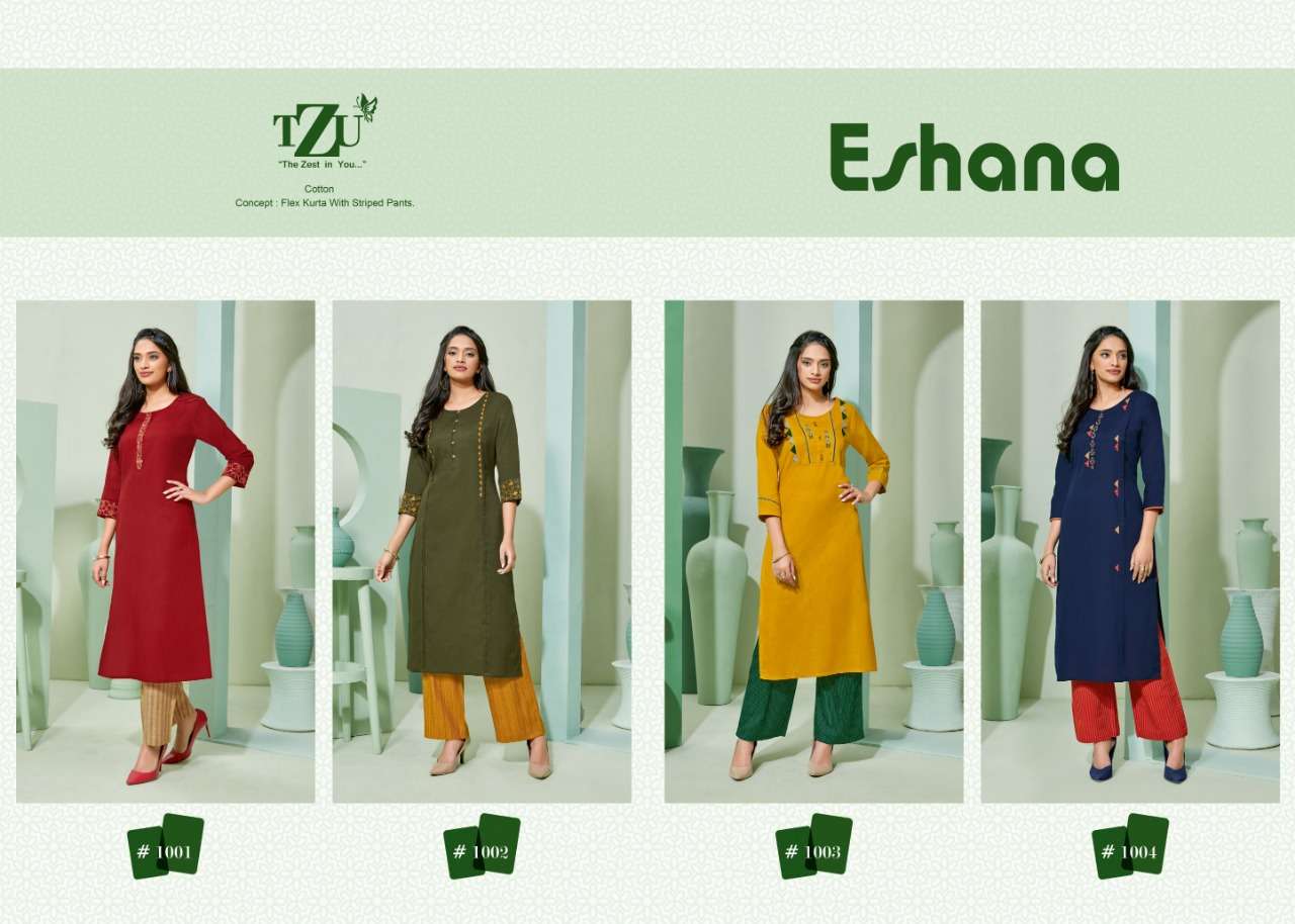 TZU           INTRODUCING   THE NEW KURTI CATLOG         ESHANA       FABRIC :- COTTON PATTERN :-FLEX TOP WITH           STRIPED PANT  SPEC. :- STRAIGHT CUT.         WITH PANTS LENGTH :- 46 INCH. DESIGNS :-1001 TO 1004 SIZES :-M,L,XL,2XL        40,42,44,46 RATE :- 791/- Set to set GST :-  5% |