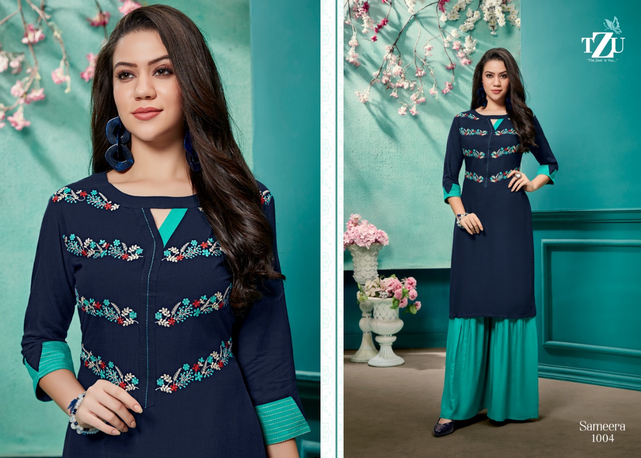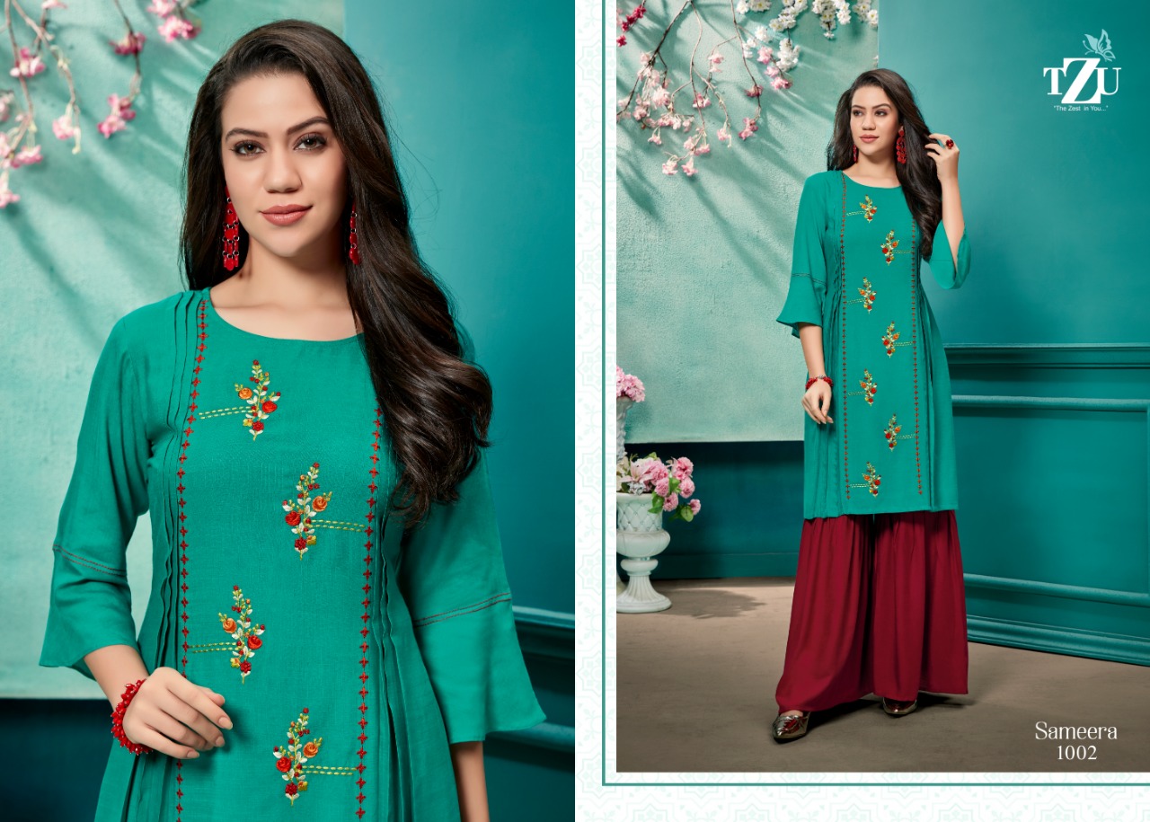 Tzu Lifestyle Presenting Sameera Rayon Embroidery Work Kurti With Sharara Pattern
