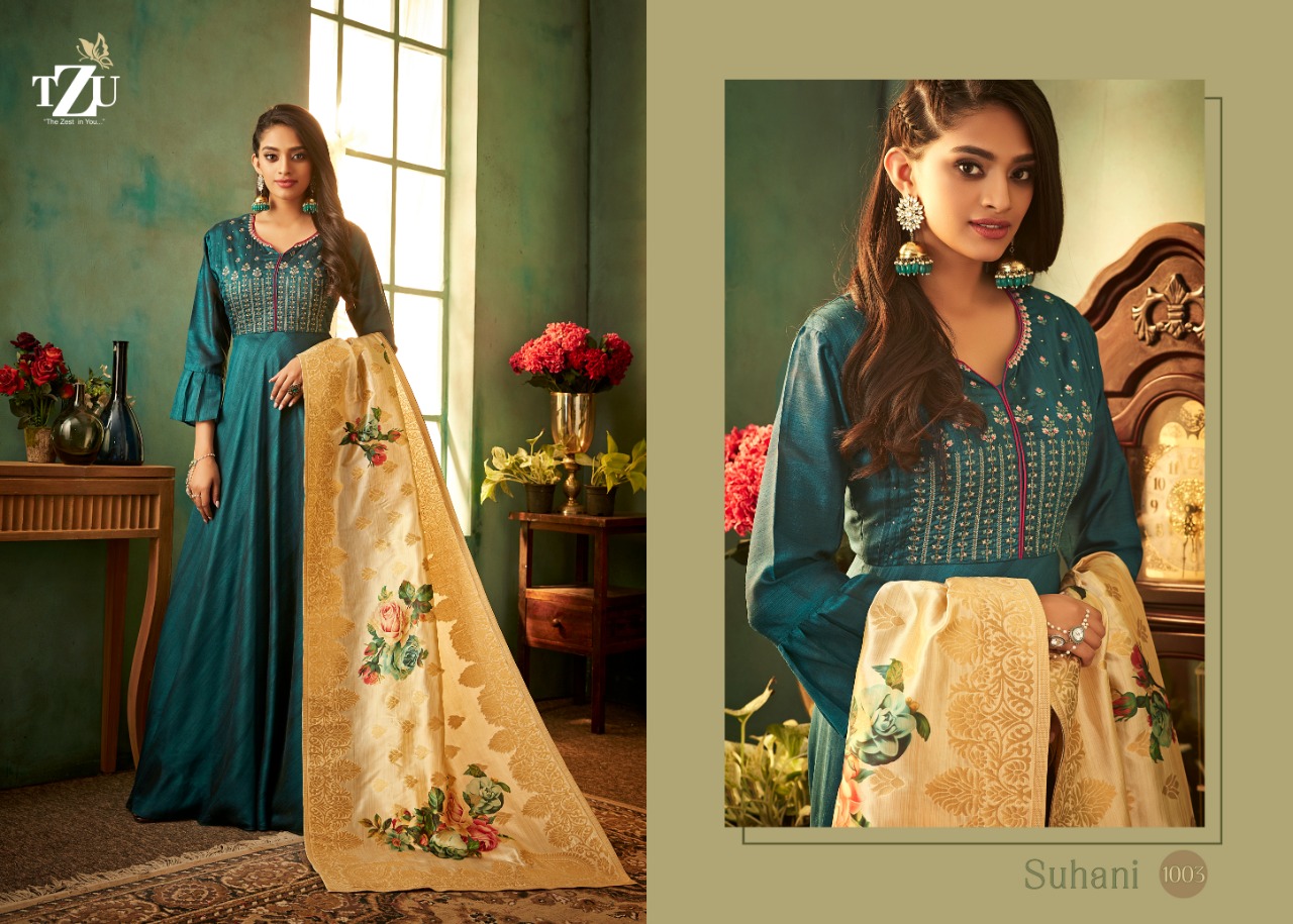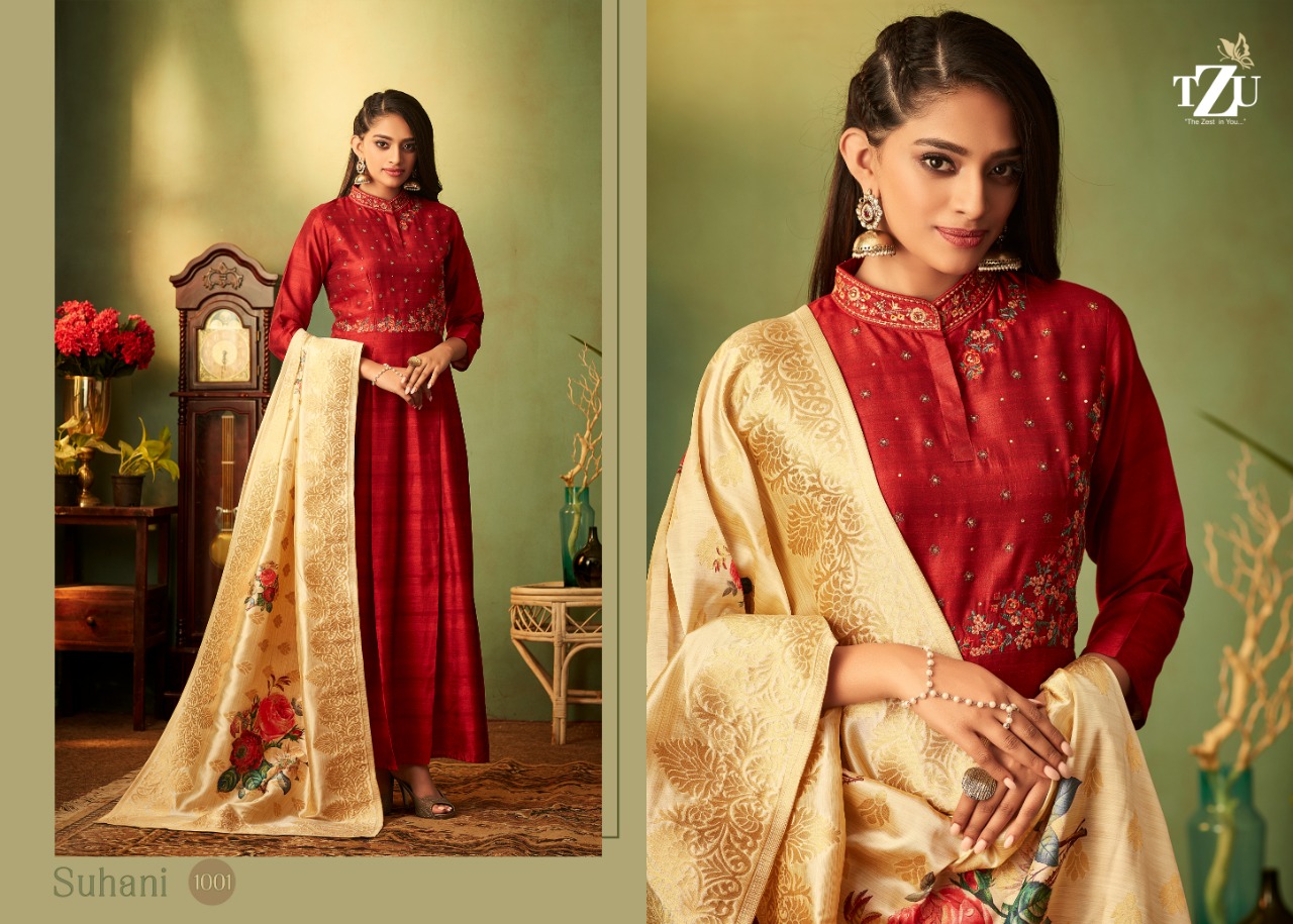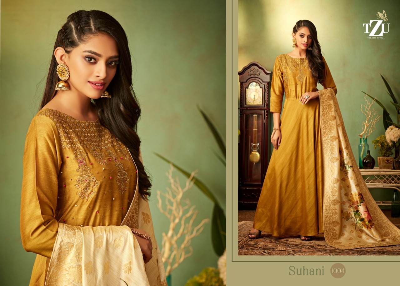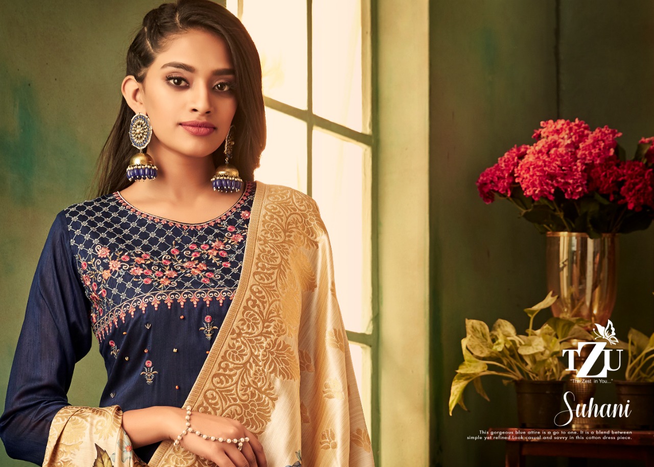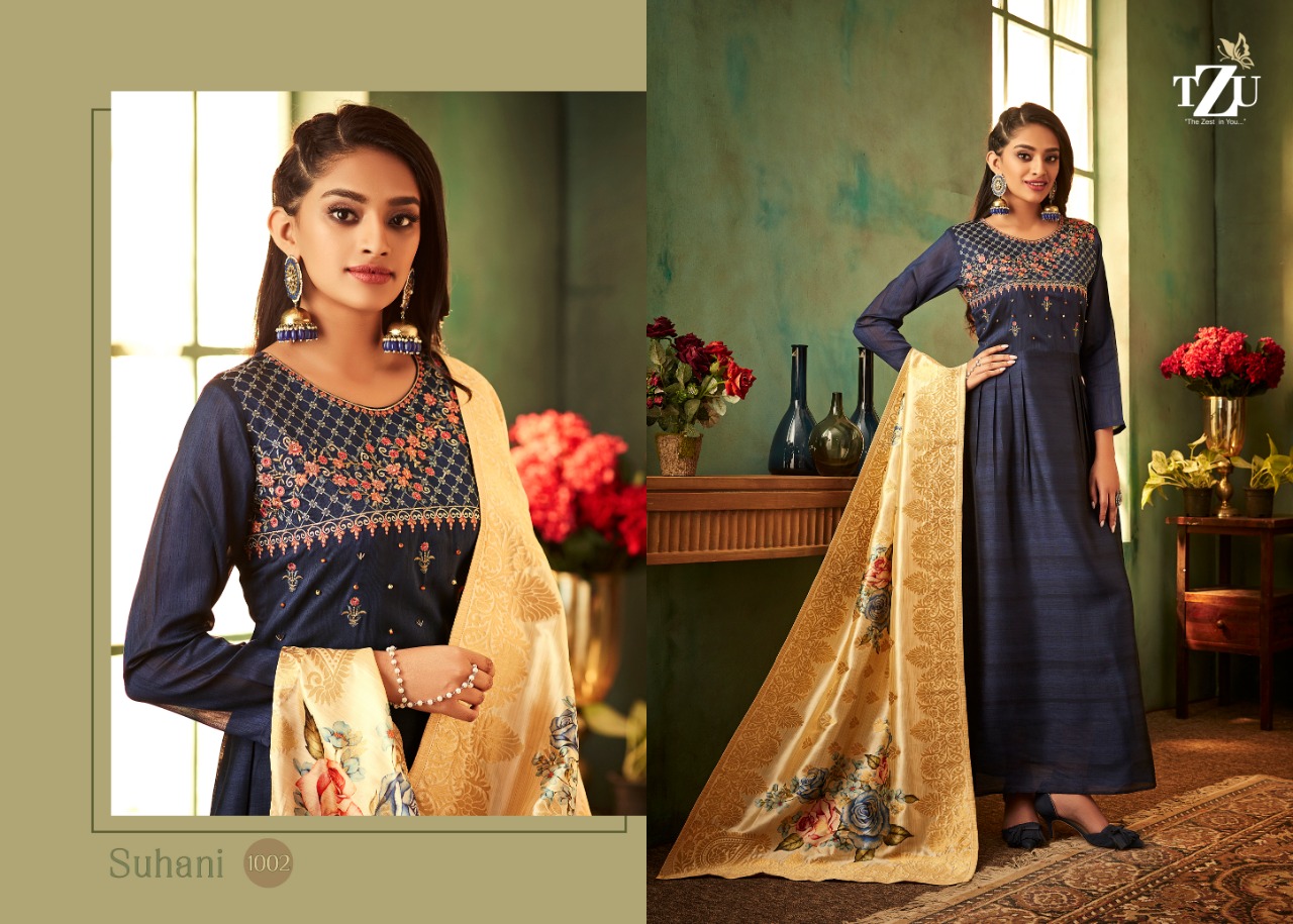 TZU LIFE STYLE INTRODUCING- THE NEW KURTI CATLOG SUHANI FABRIC :- MUSLIN CREAP SILK PATTERN :-ROUND CUT LONG TOP &BANARASI BAMBU SILK DUPATTA SPEC. :- EMBROIDERY + HAND WORK LENGTH :- 54 INCH. DESIGNS :-1001 TO 1004 SIZES :-40,42,44,46 RATE :- 1495/- GST :- 12% |