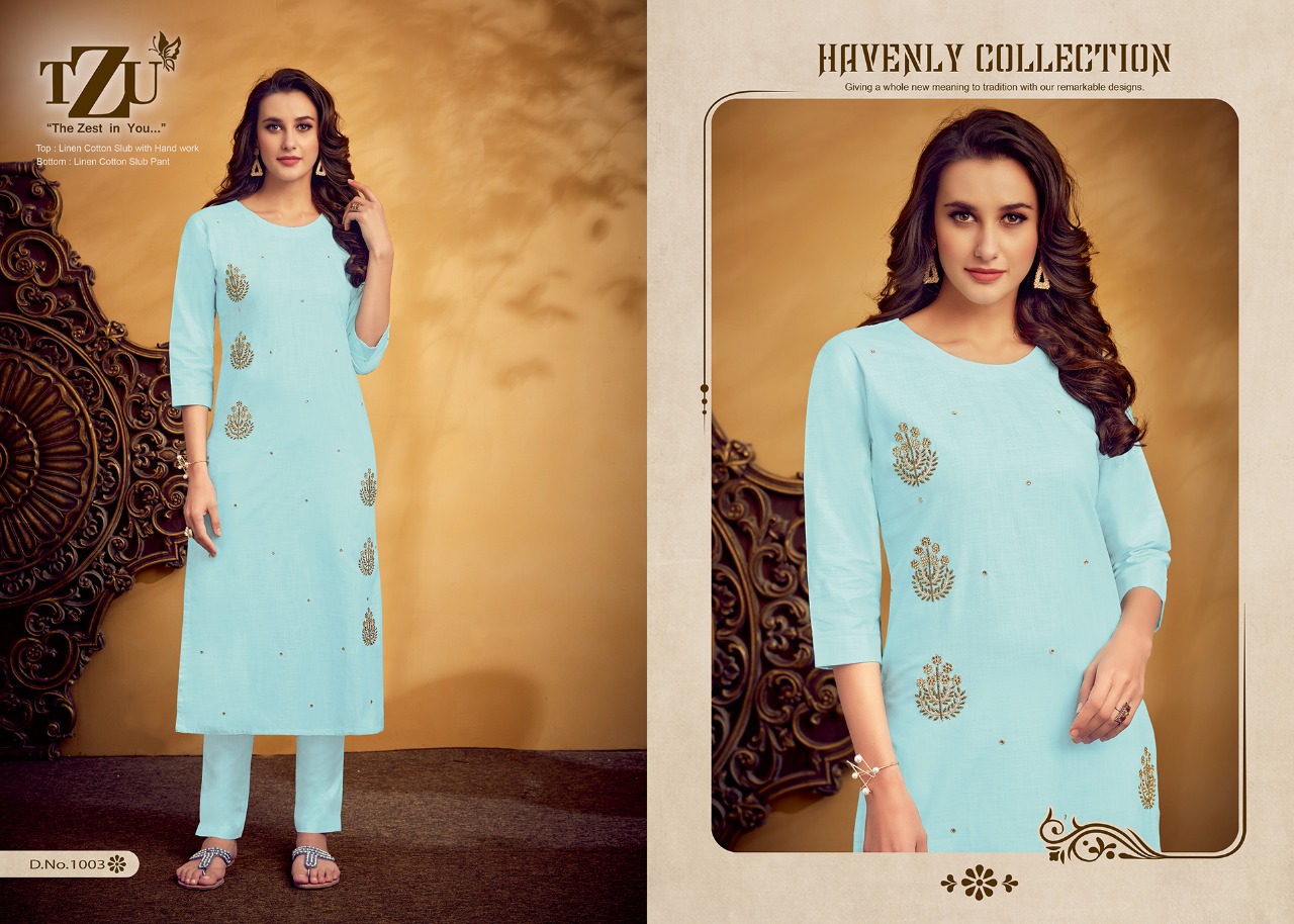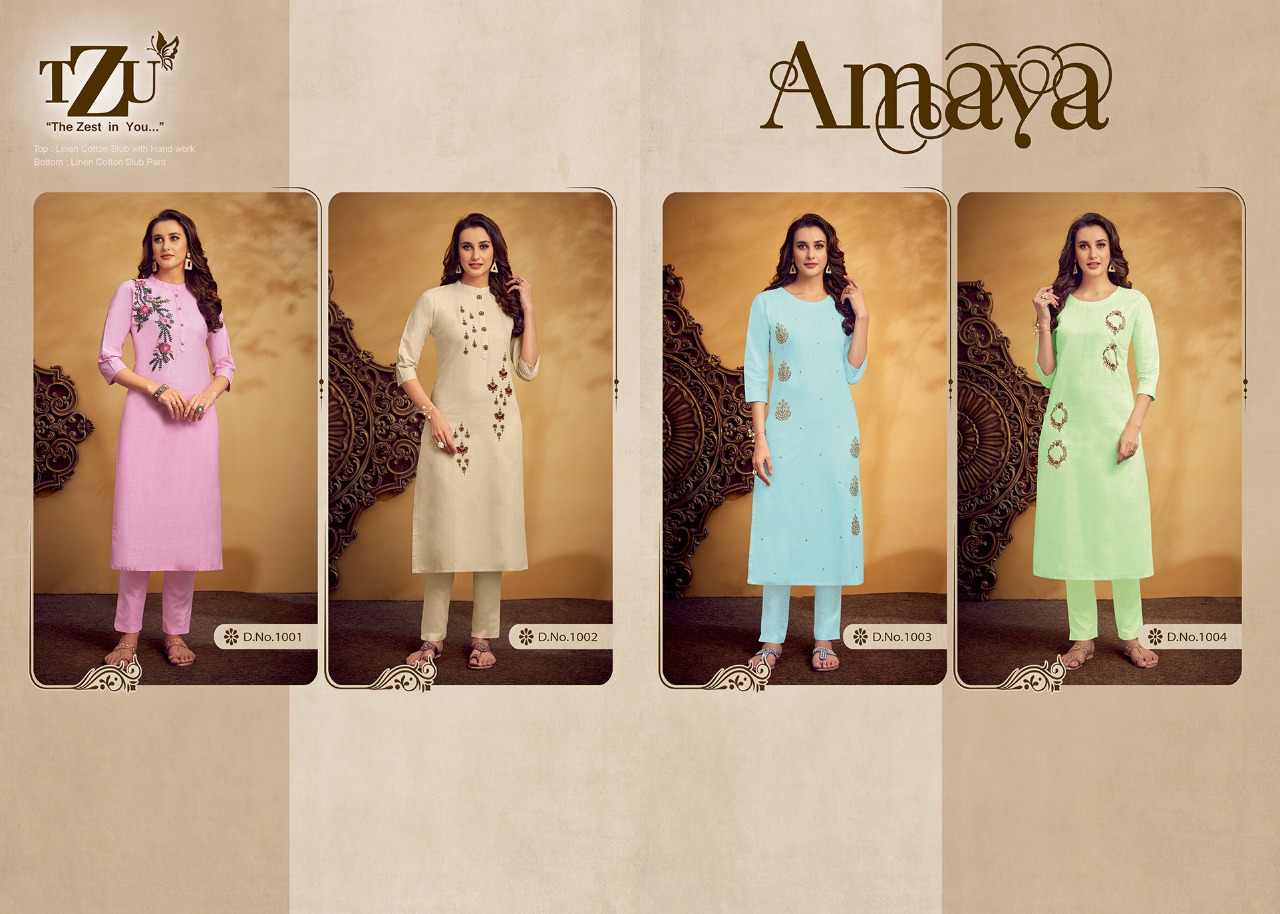 🪀🪀🪀🪀🪀🪀🪀 INTRODUCING- THE NEW KURTI CATLOG 🛎️🛎️🛎️🛎️🛎️🛎️🛎️🛎️🛎️🛎️ AMAYA 🪀🪀🪀🪀 FABRIC :- LINEN COTTON SLUB PATTERN :-HAND WORK EMBROIDERY TOP WITH BOTTOM SPEC. :- STRAIGHT CUT. LENGTH :- 46 INCH. DESIGNS :-1001 TO 1004 SIZES :-M,L,XL,2XL 40,42,44,46 RATE :- 999/- GST :- 5% |