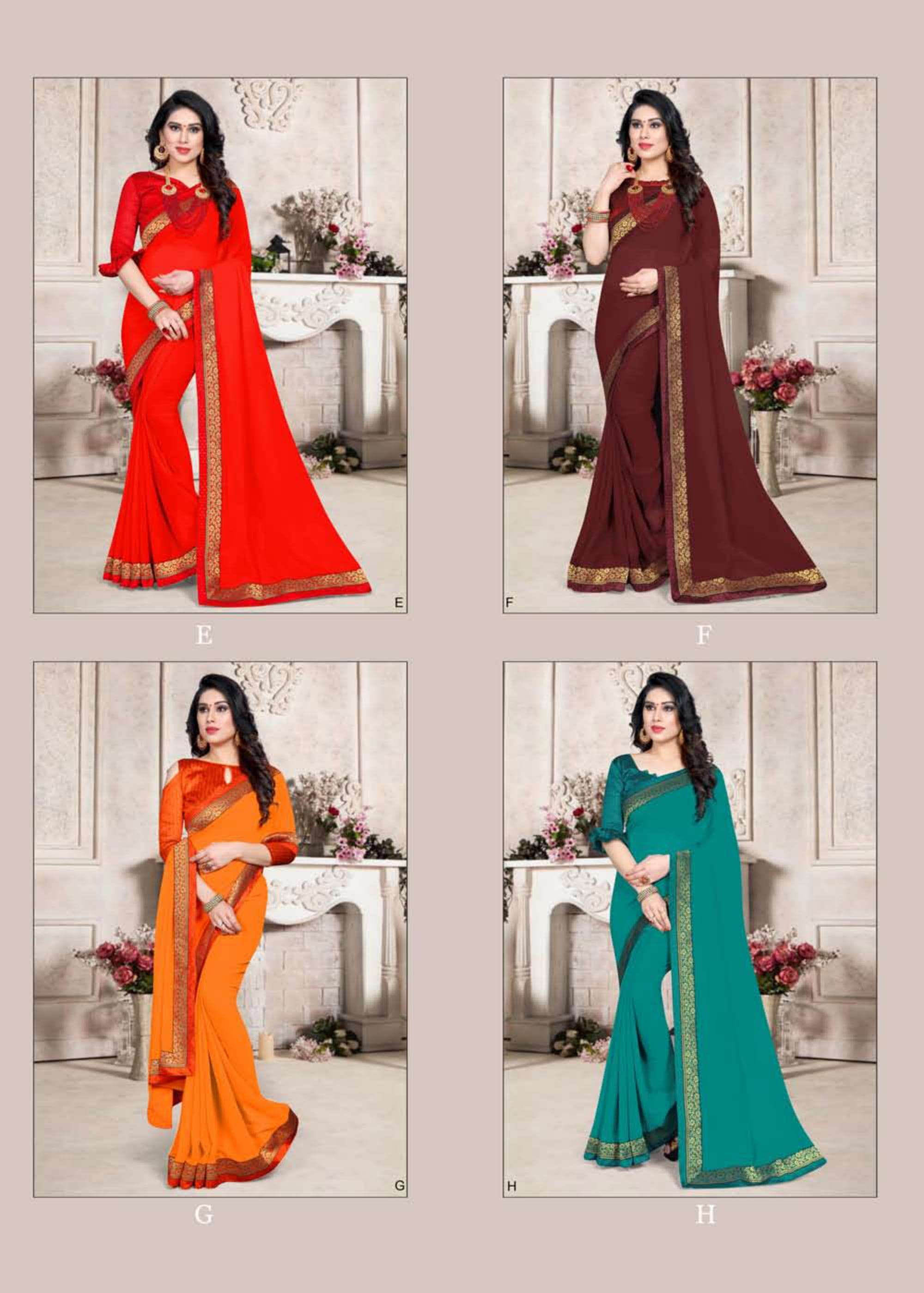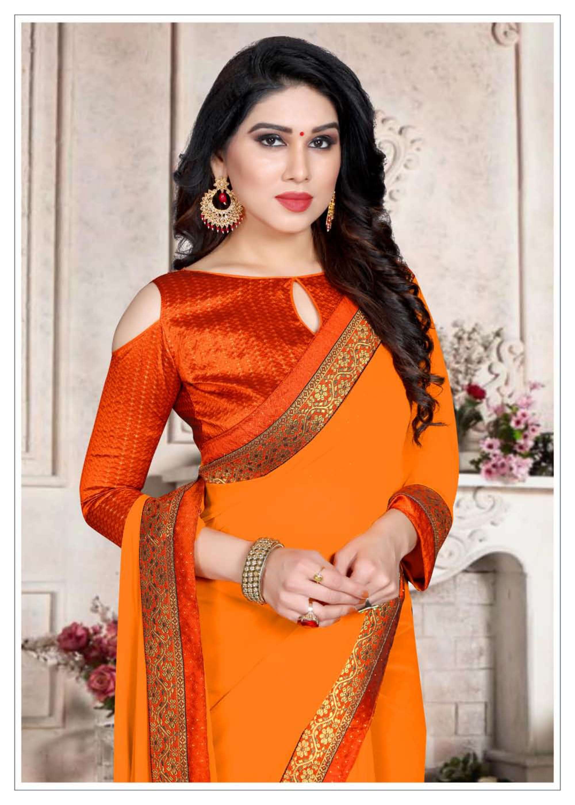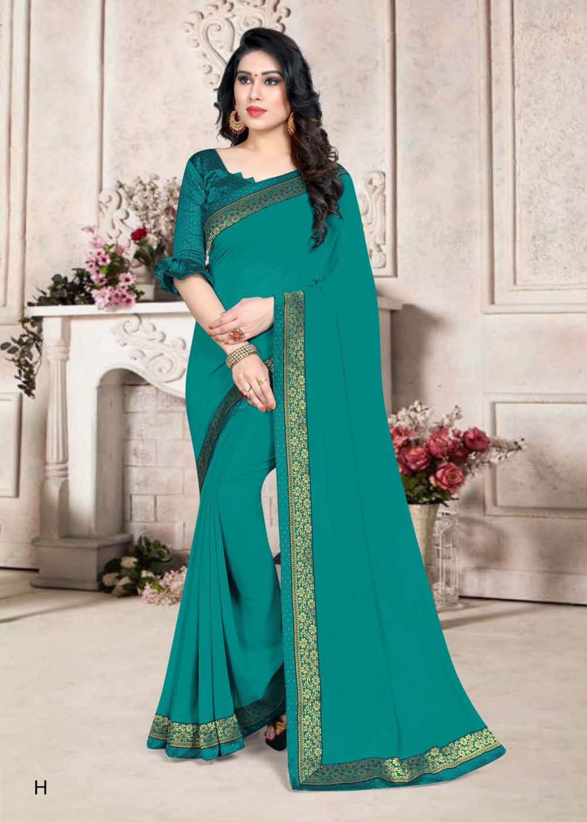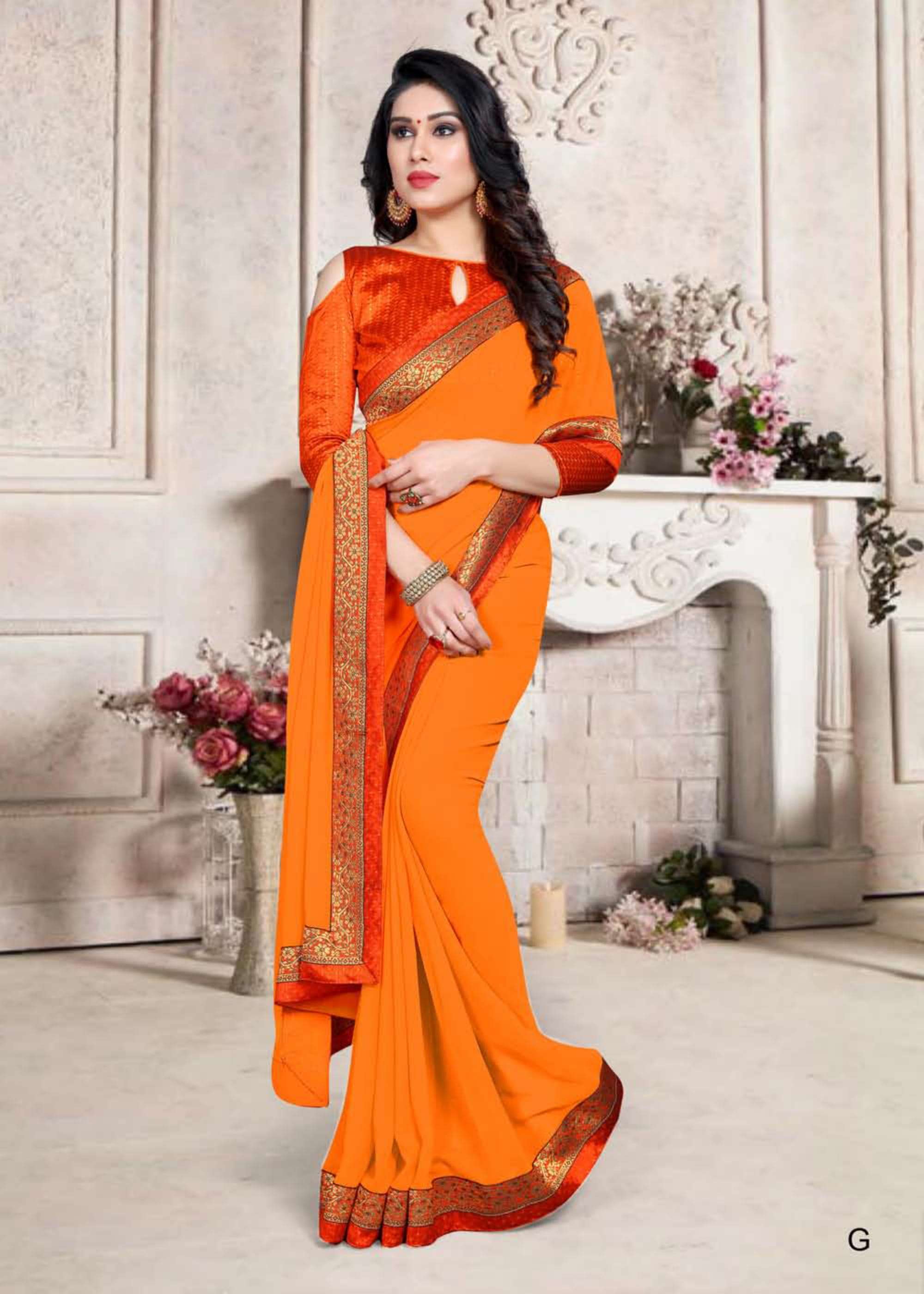 UTSAV Item name : UTSAV Brand name : Shravya fashion No. Of design : 8 colour Fabric : GEORGETTE WITH BLOOMING COLOURS ALONGWITH JACQUARD BORDER AND BLOUSE Packing : Set to set only Rate :  420/- |