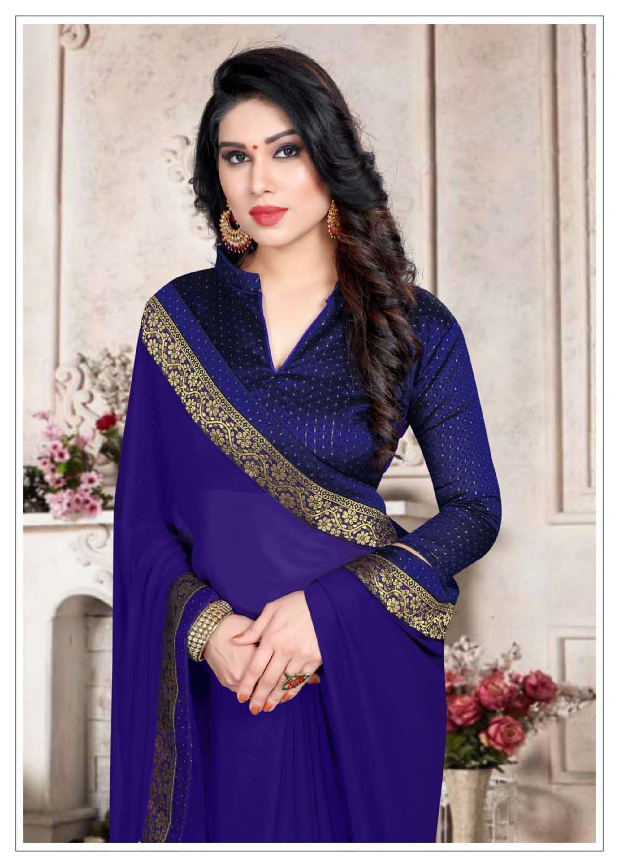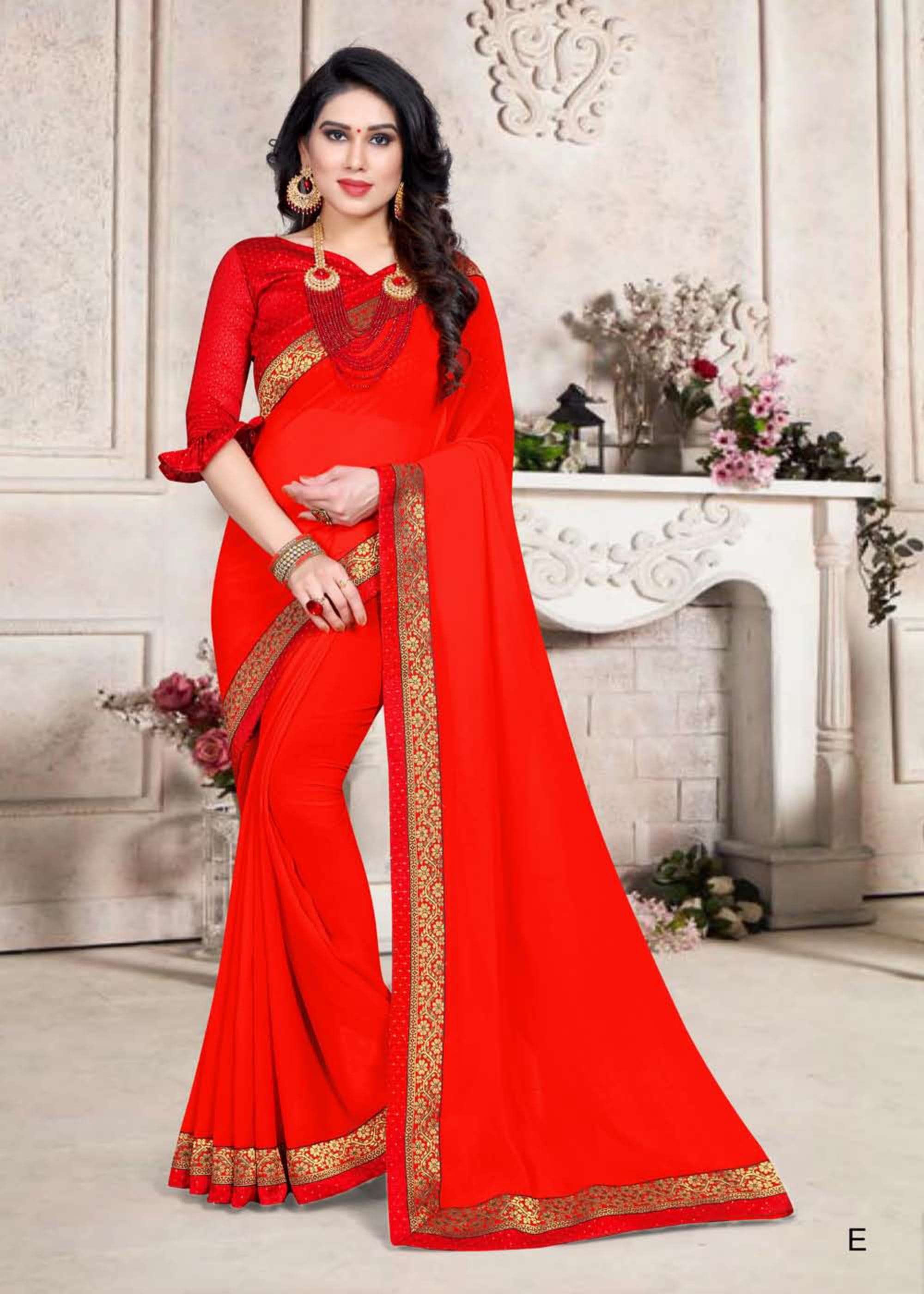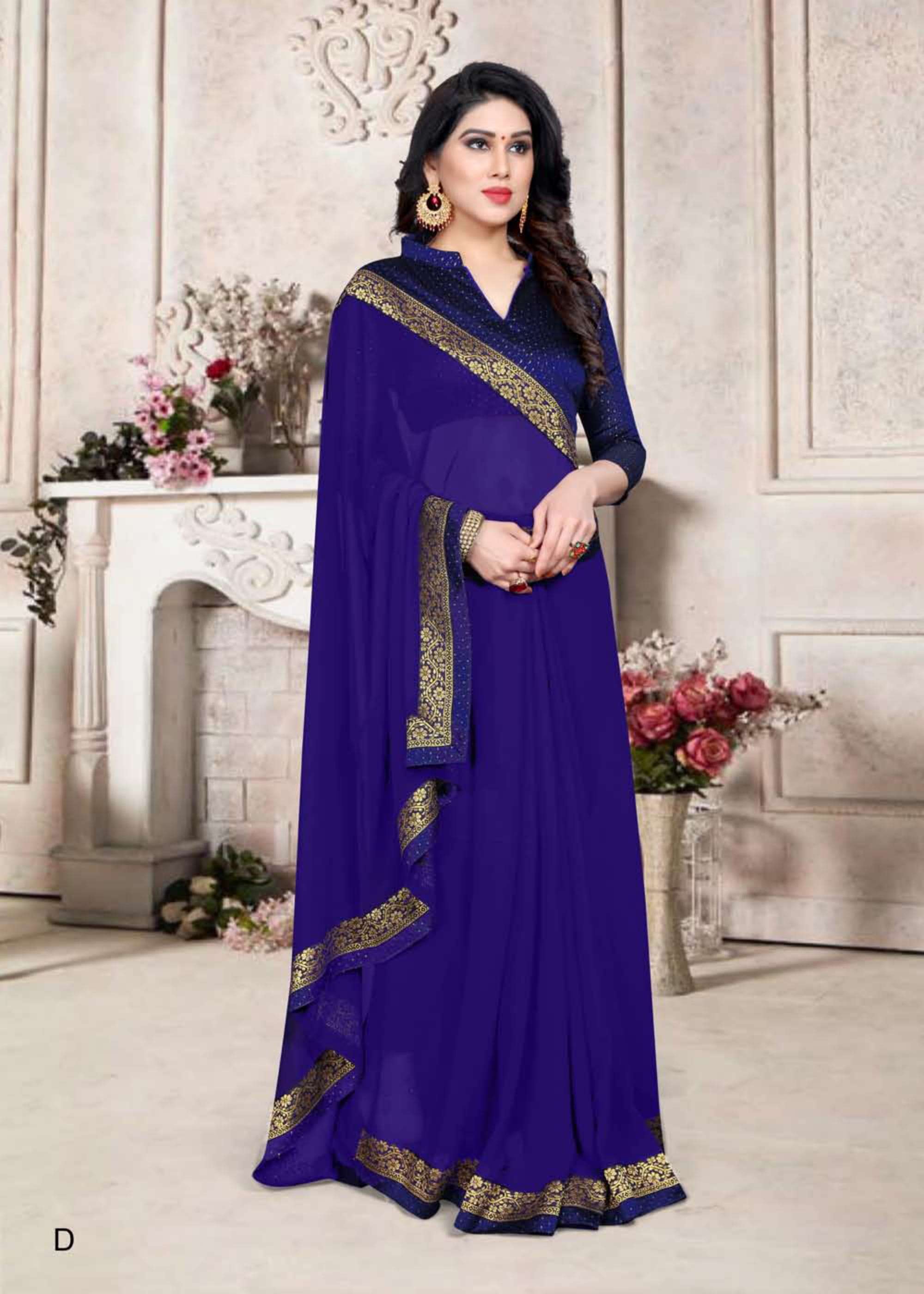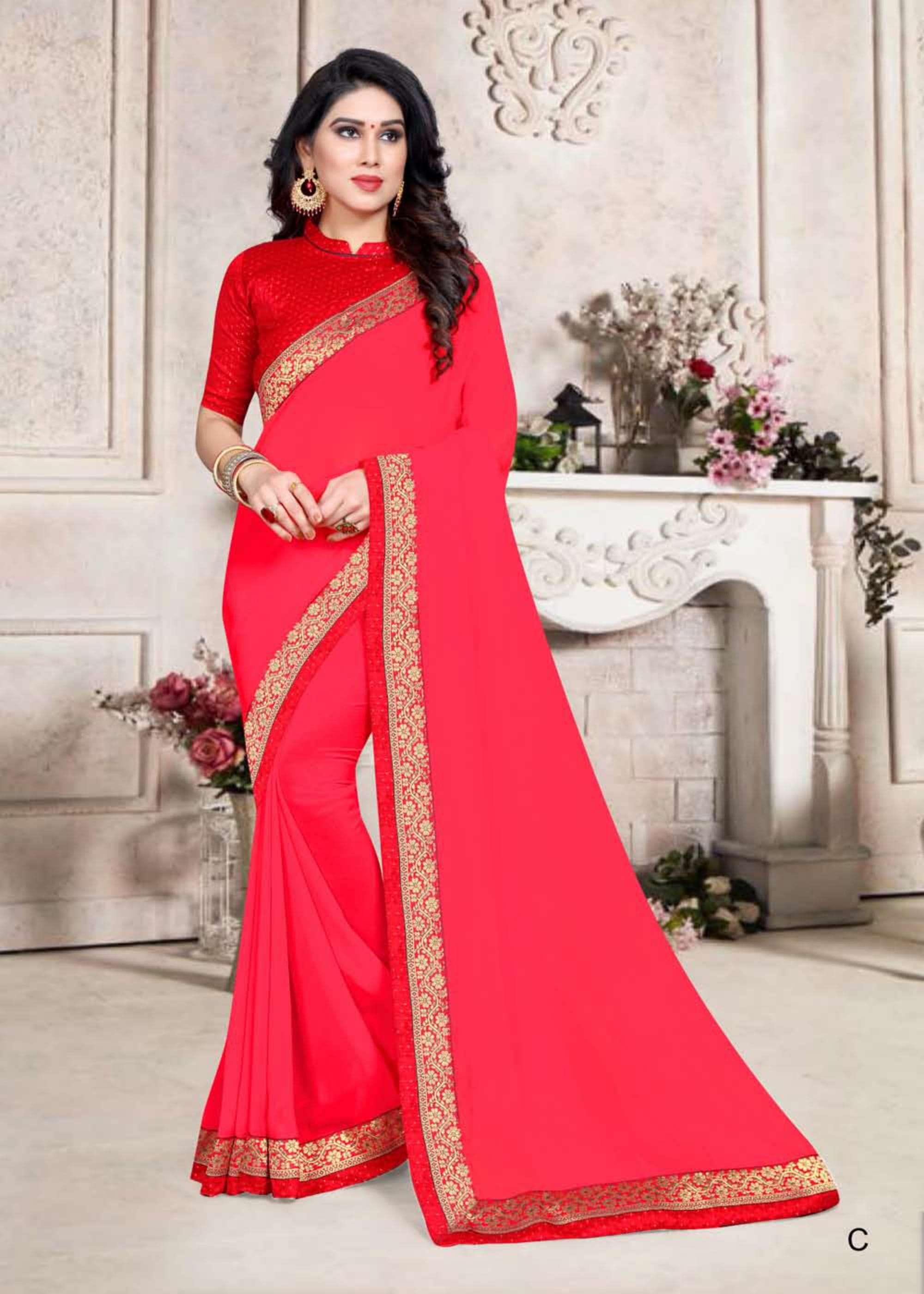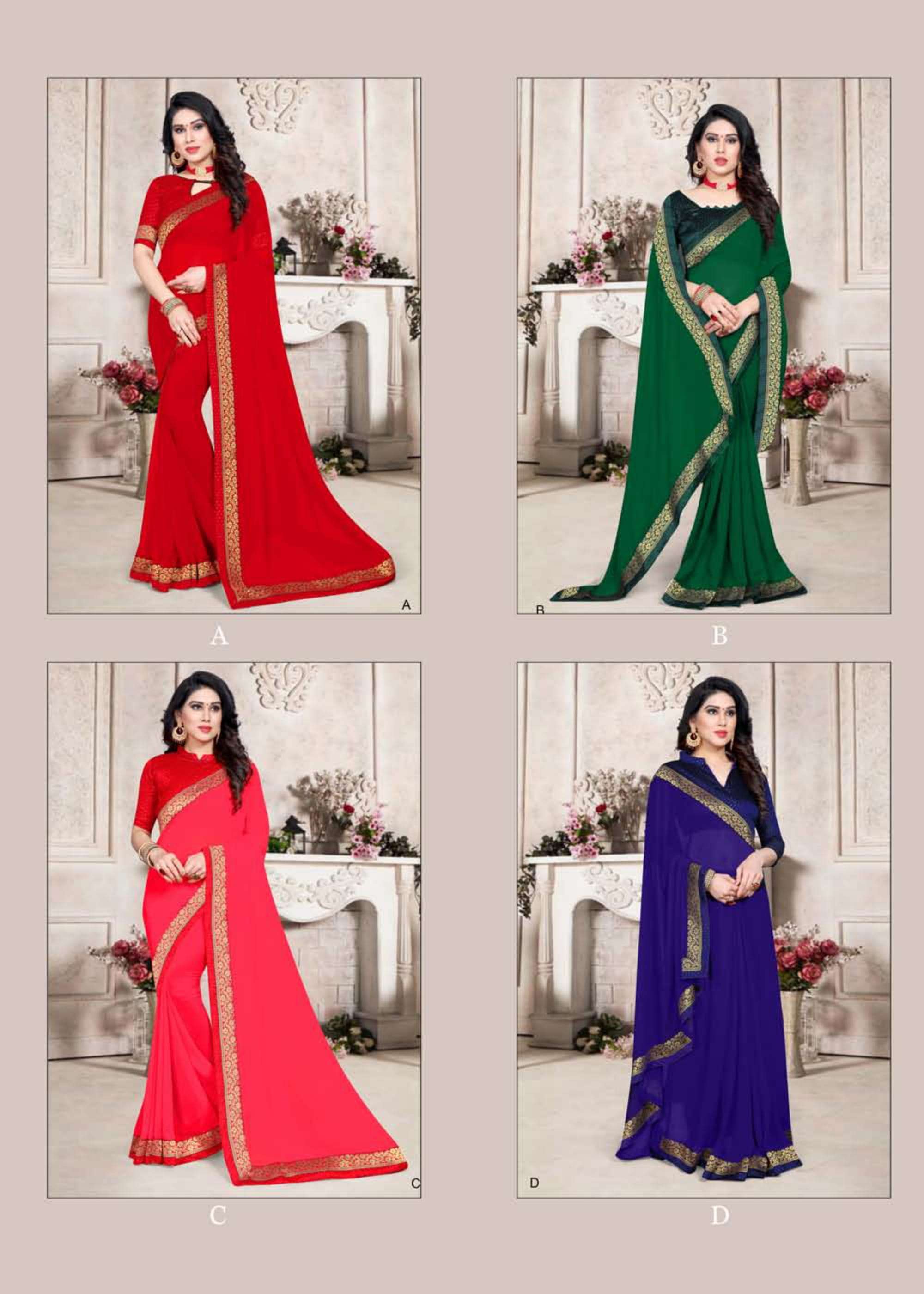 UTSAV Item name : UTSAV Brand name : Shravya fashion No. Of design : 8 colour Fabric : GEORGETTE WITH BLOOMING COLOURS ALONGWITH JACQUARD BORDER AND BLOUSE Packing : Set to set only Rate :  420/- |