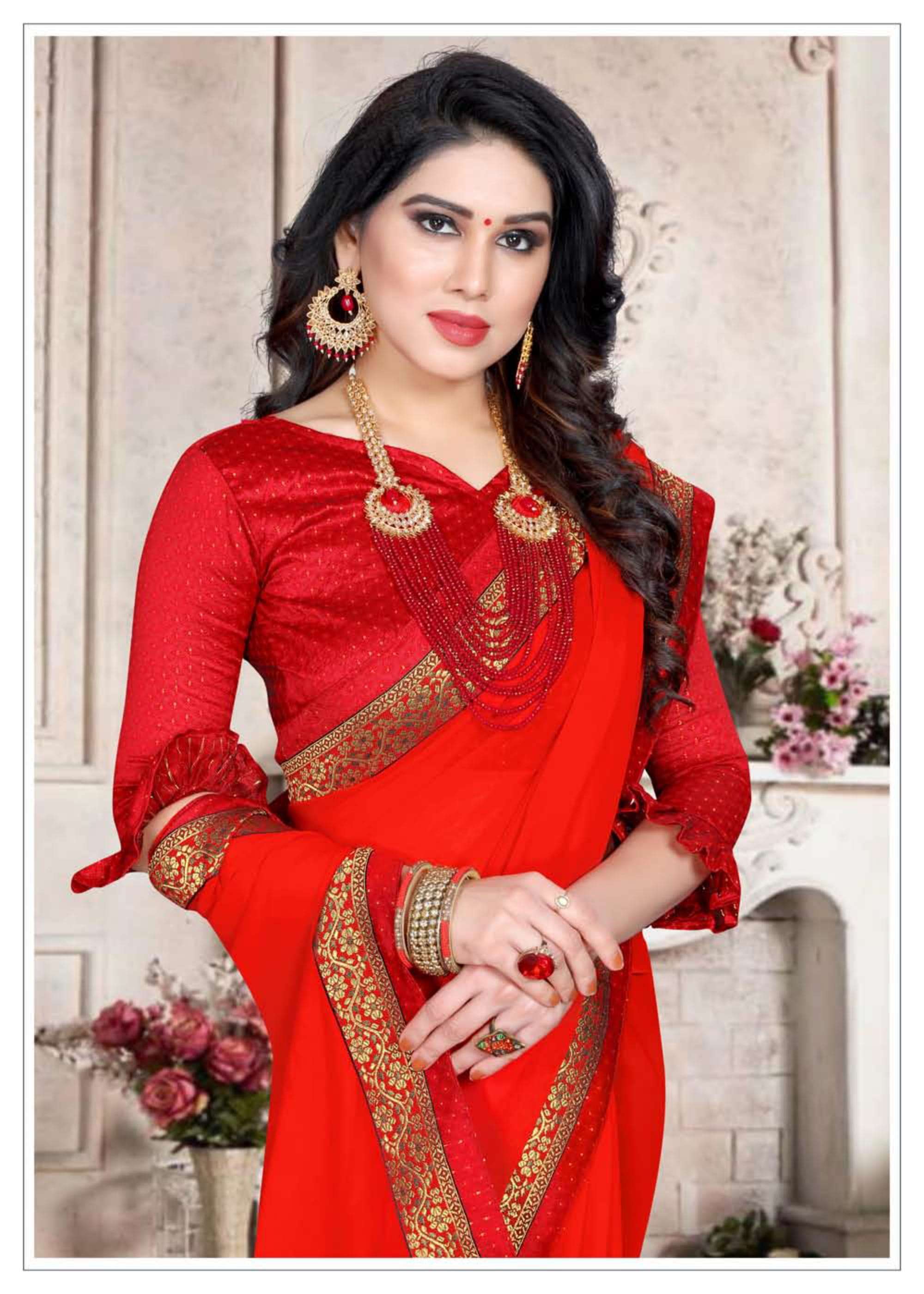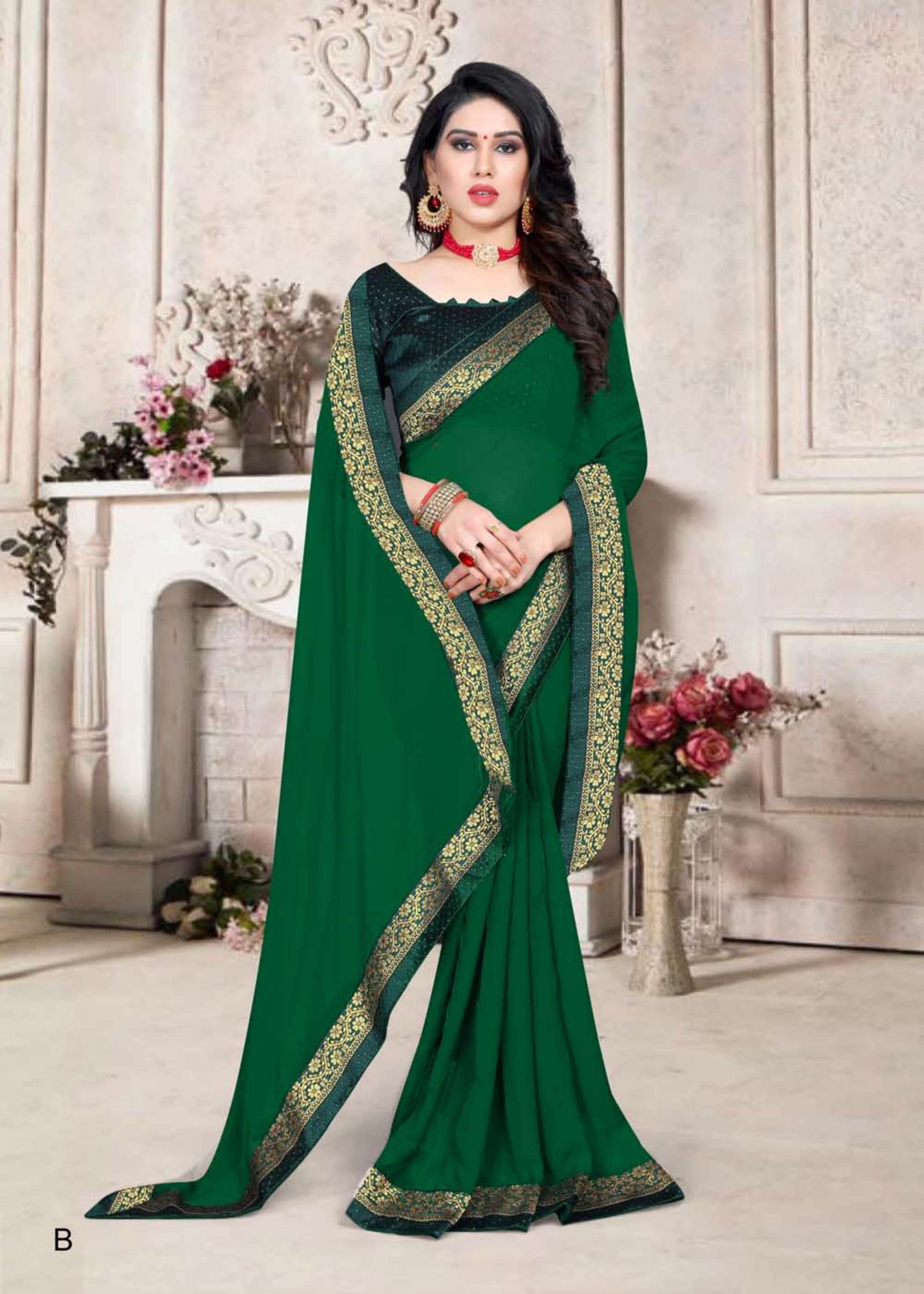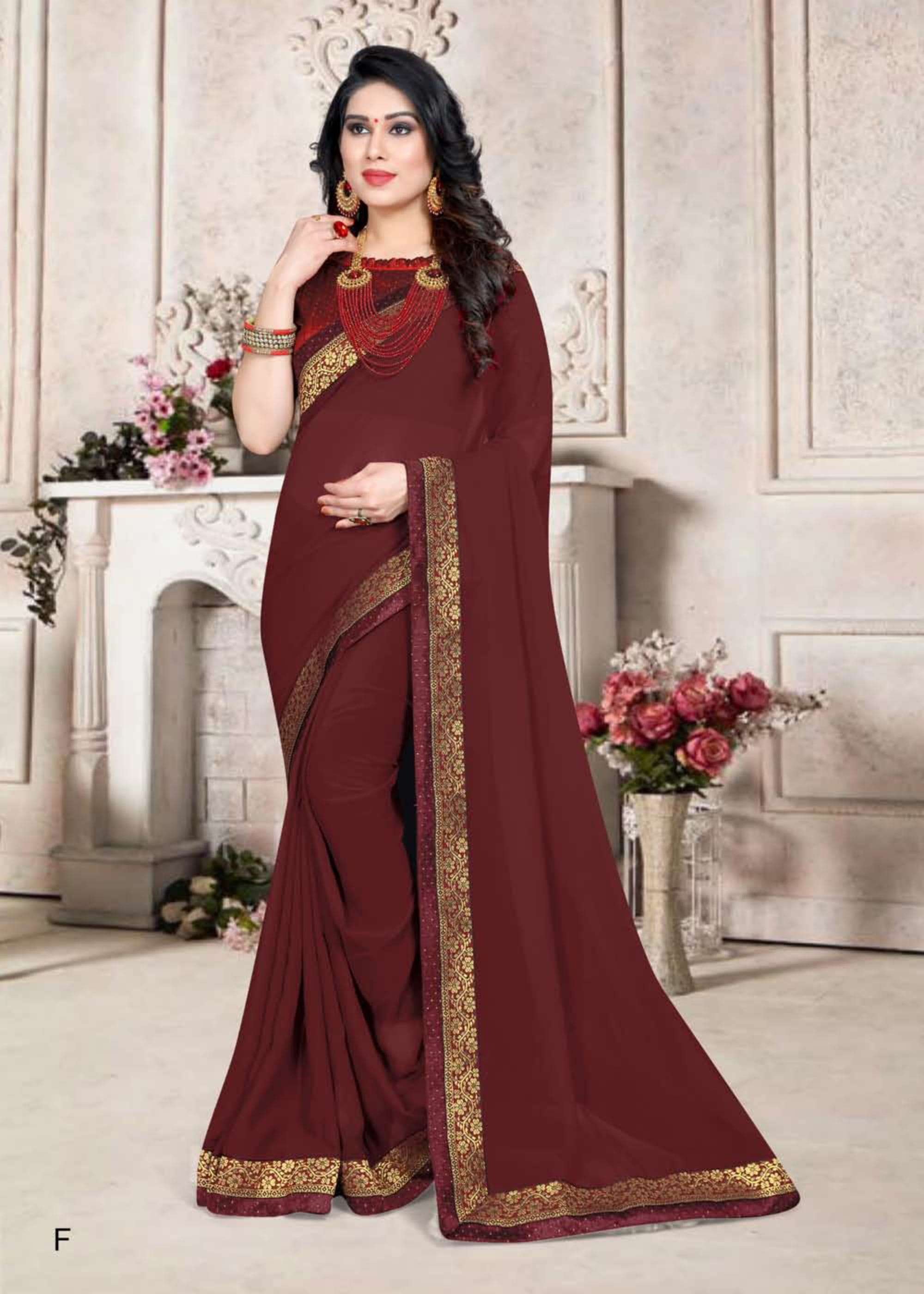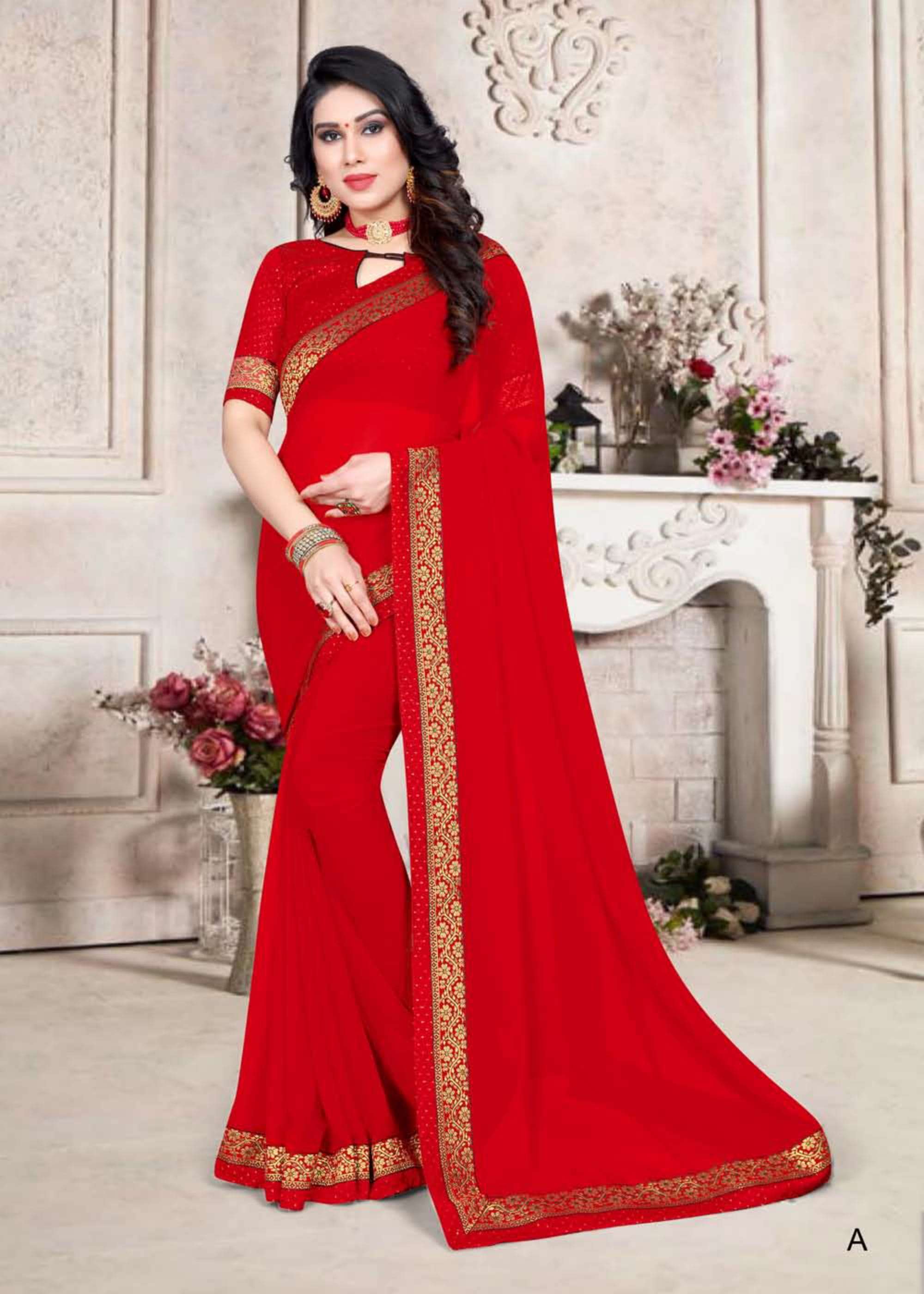 UTSAV Item name : UTSAV Brand name : Shravya fashion No. Of design : 8 colour Fabric : GEORGETTE WITH BLOOMING COLOURS ALONGWITH JACQUARD BORDER AND BLOUSE Packing : Set to set only Rate :  420/- |