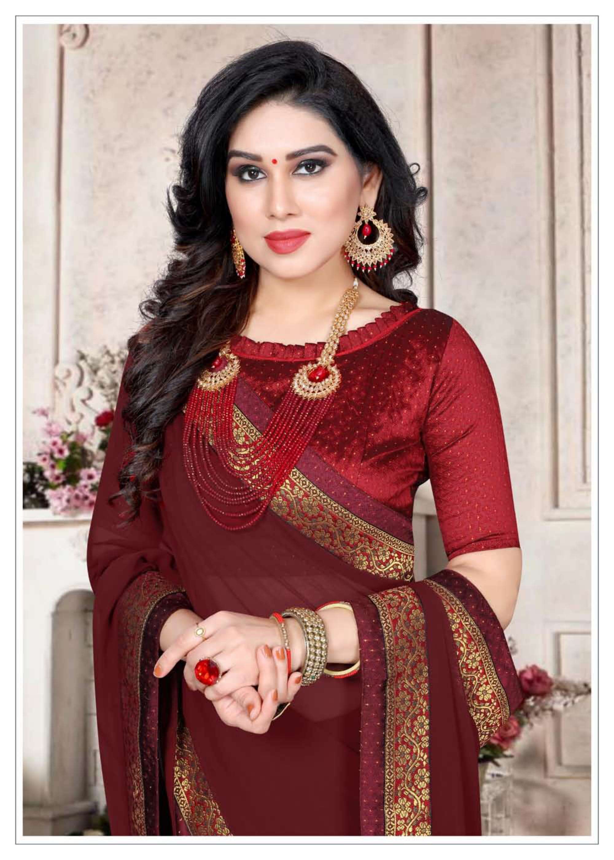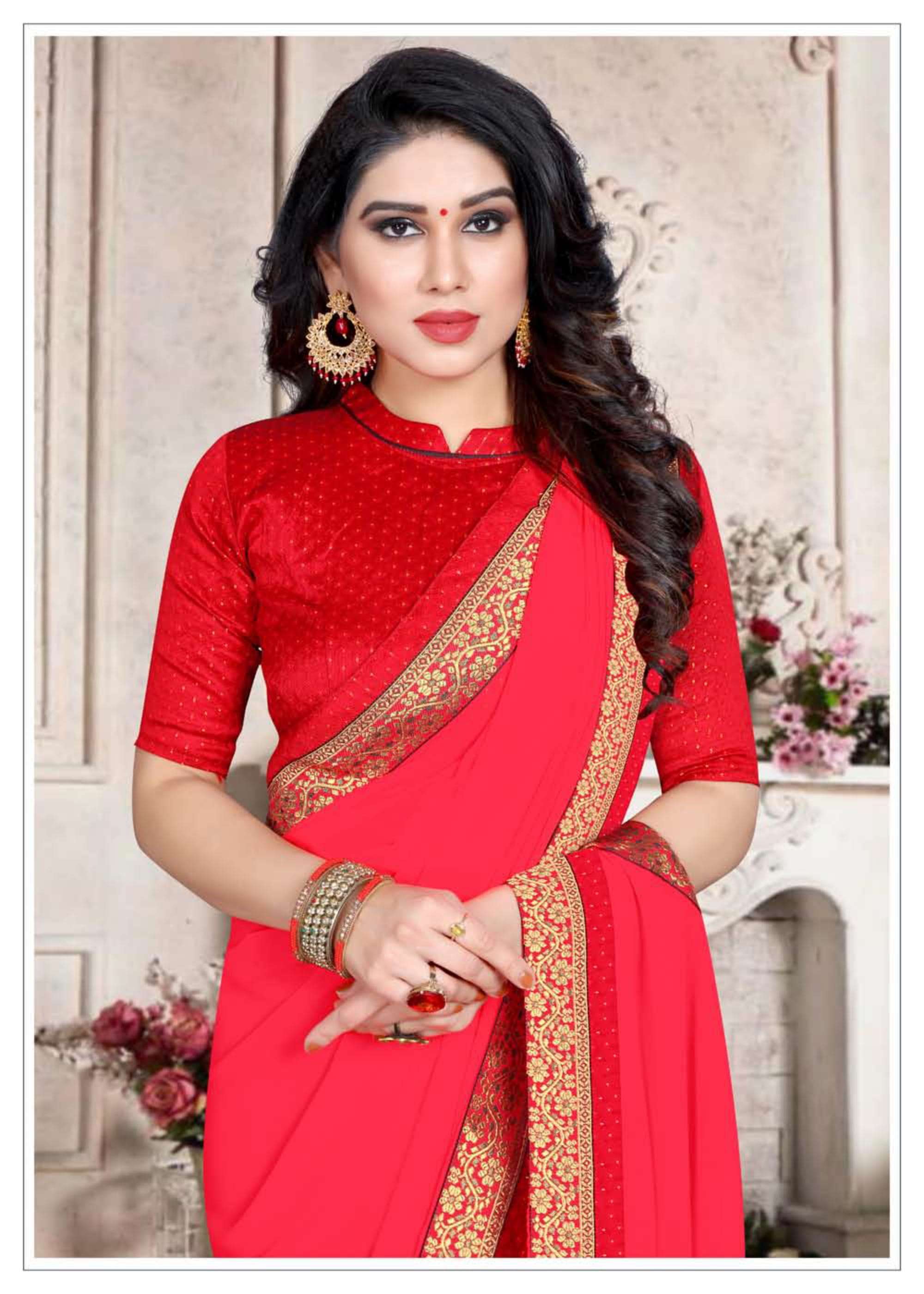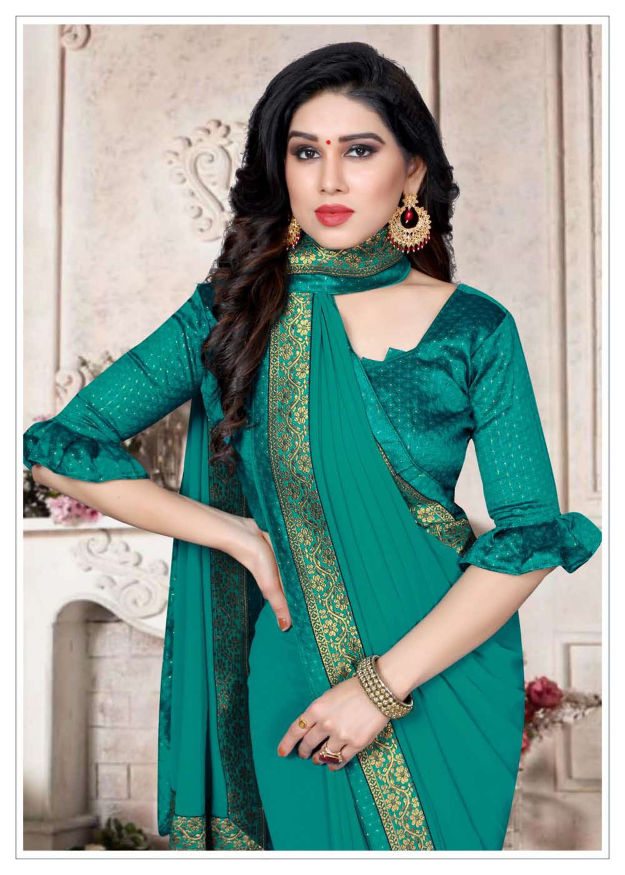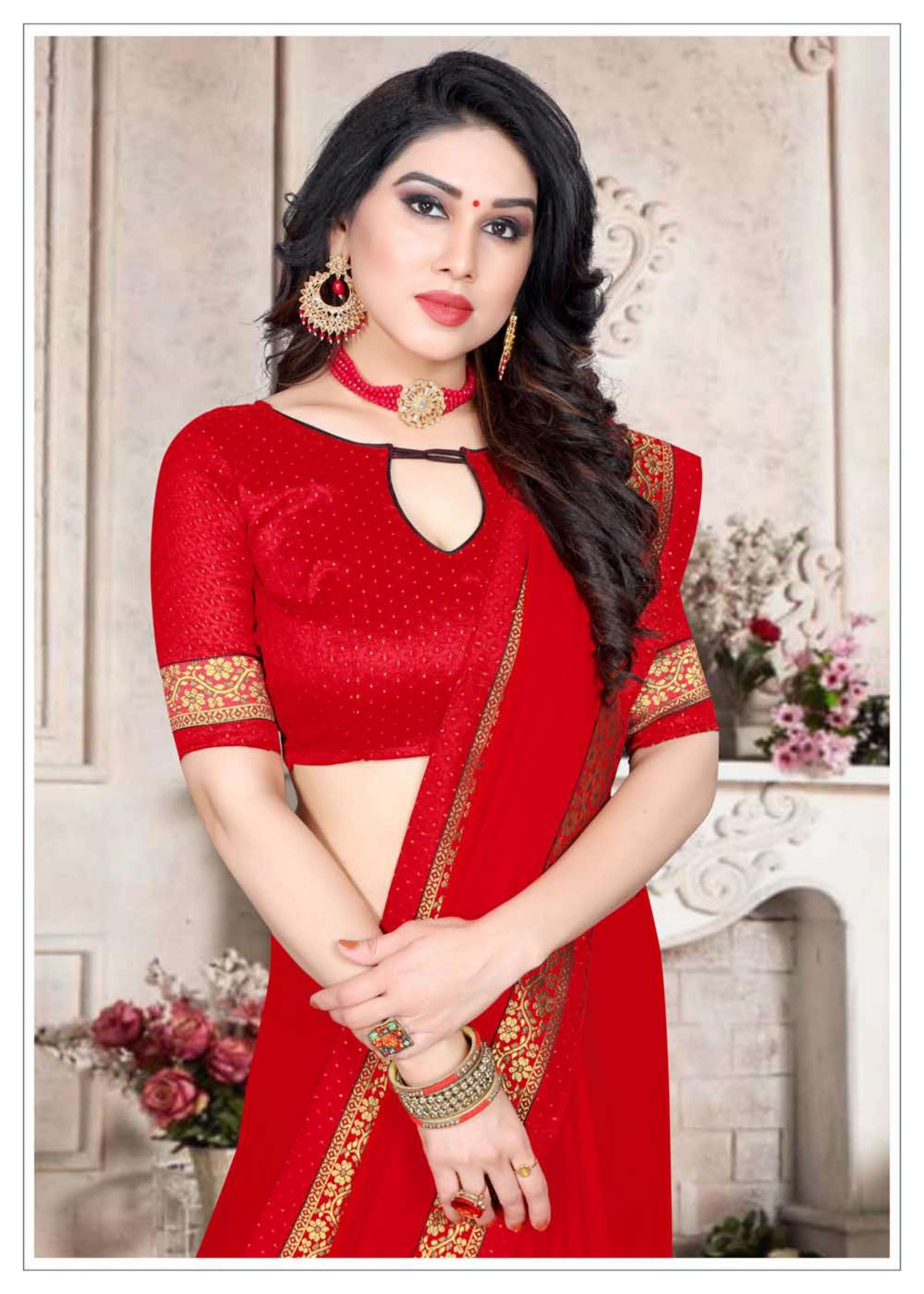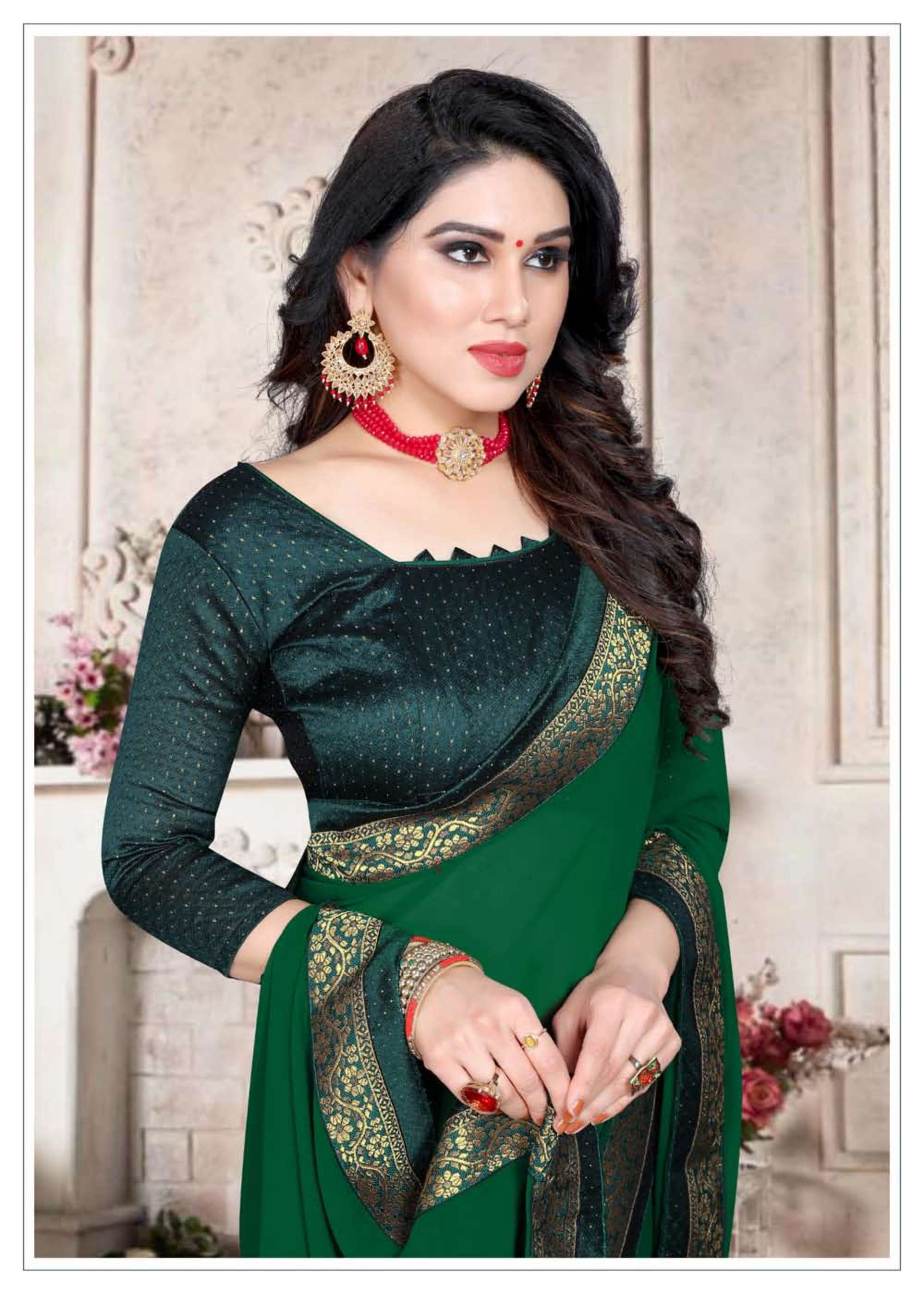 UTSAV Item name : UTSAV Brand name : Shravya fashion No. Of design : 8 colour Fabric : GEORGETTE WITH BLOOMING COLOURS ALONGWITH JACQUARD BORDER AND BLOUSE Packing : Set to set only Rate :  420/- |