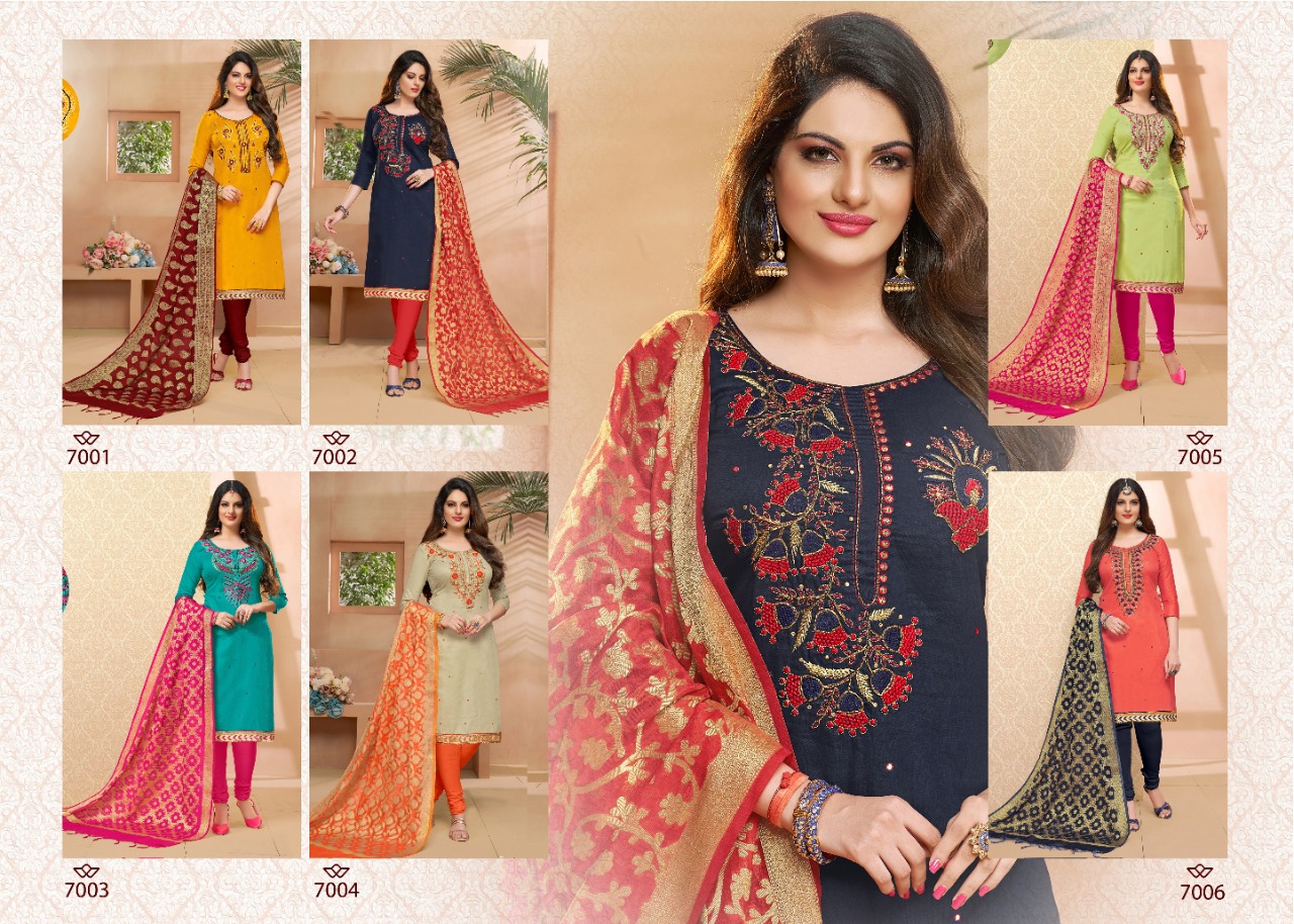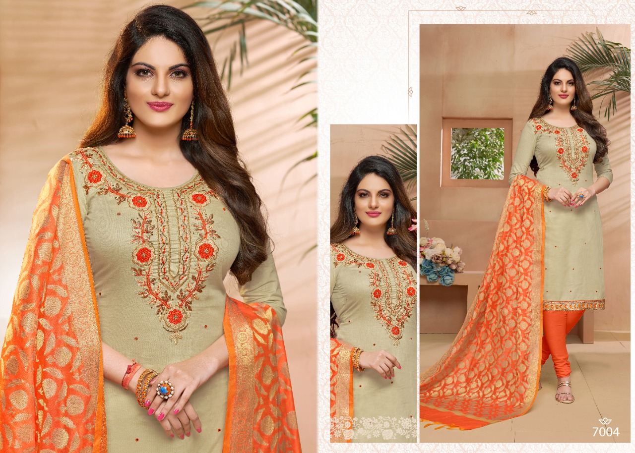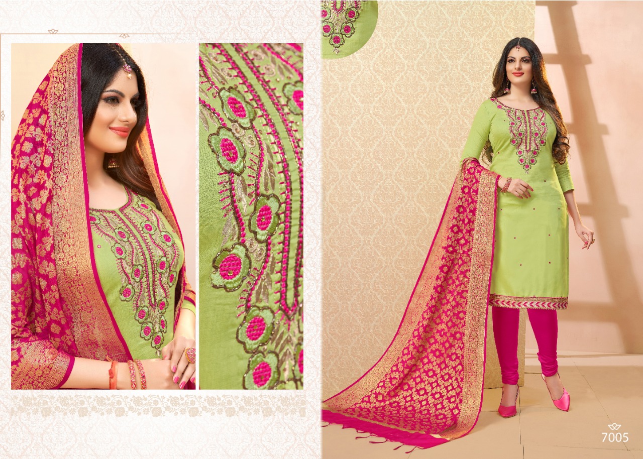 "UTSAV SUITS"_ BRAND CREATED BY YOU It is a brand synonymous with sophistication and style it is for the women of today,who prefers to make a statement whenever she step out. We r now Introducing ..."TAZIN VOL. 7"... KHATLI WORK Fabric Details:- Top :-Glaze Cotton Bot :- Semi loan Dup :-Pure Banarasi Rate :- 7⃣3⃣5⃣ DESIGN:-. 6⃣ Have a look to this awesome catalogue & book your orders... |