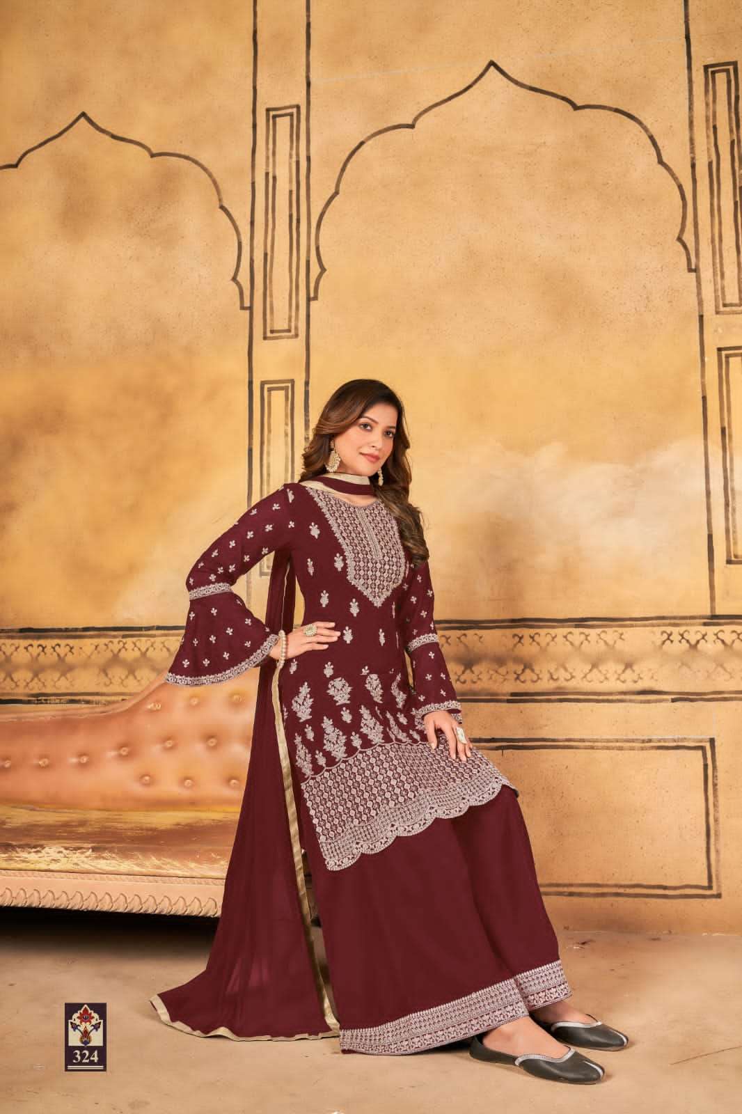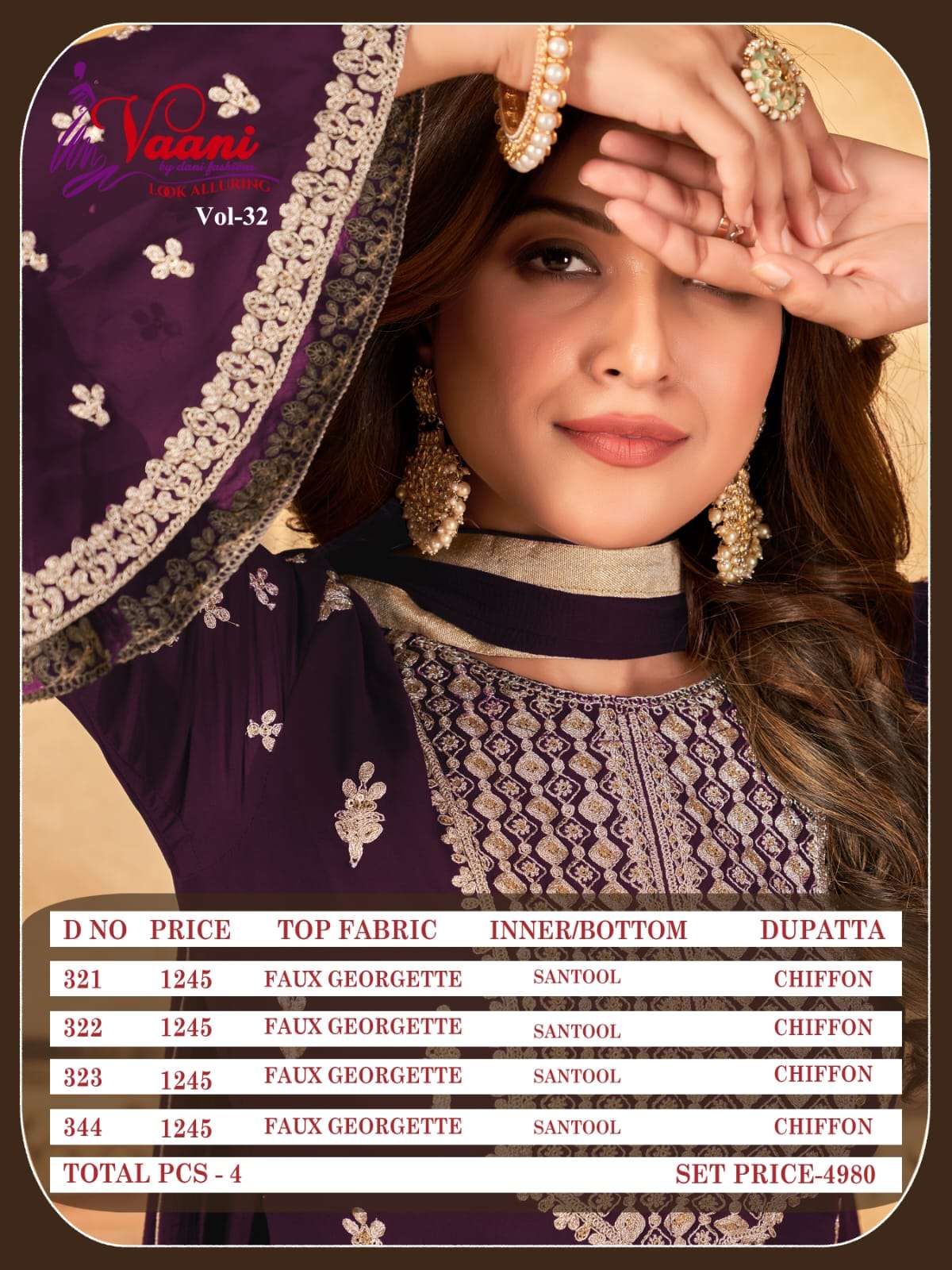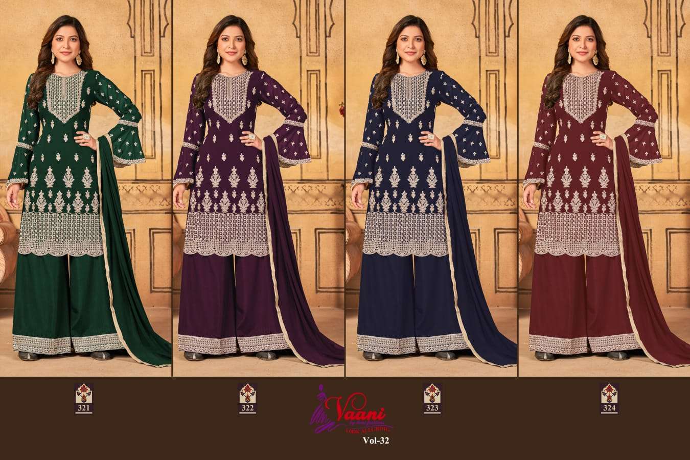 New Arrival Vaani Vol-32 Top. – Faux Georgette Inner/Bottom :- Santool Dupatta – Chifforn Price :- 1245 /- Rs Dispatch :- 05/01/2023 NOTE:- This Product Can Stich Up To 46 (3XL) Gst 12% Extra |