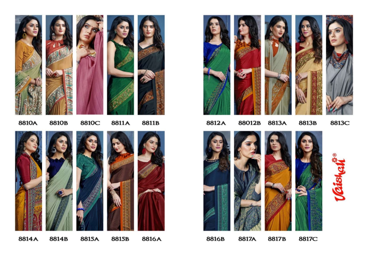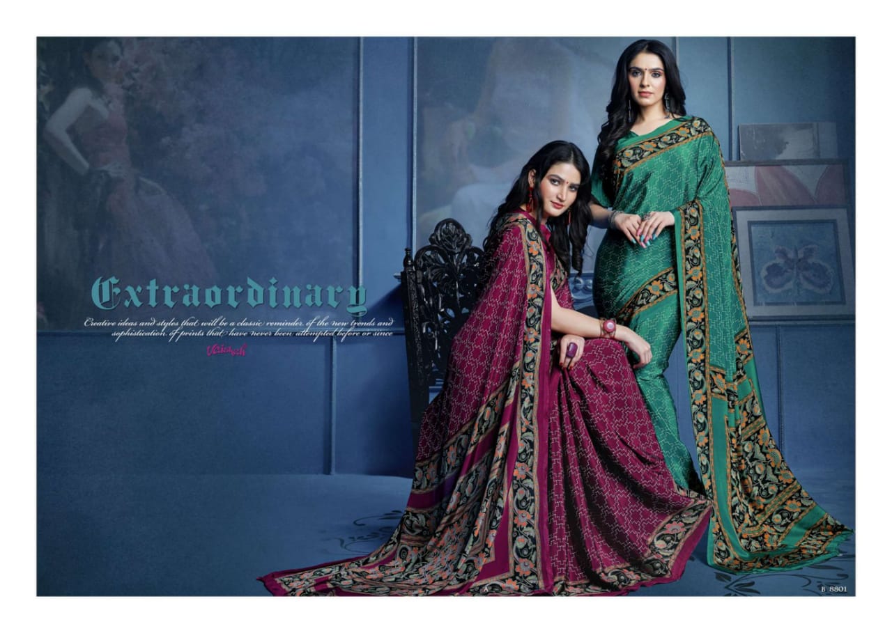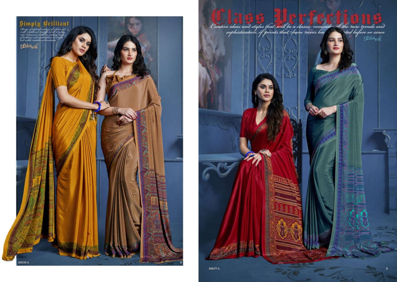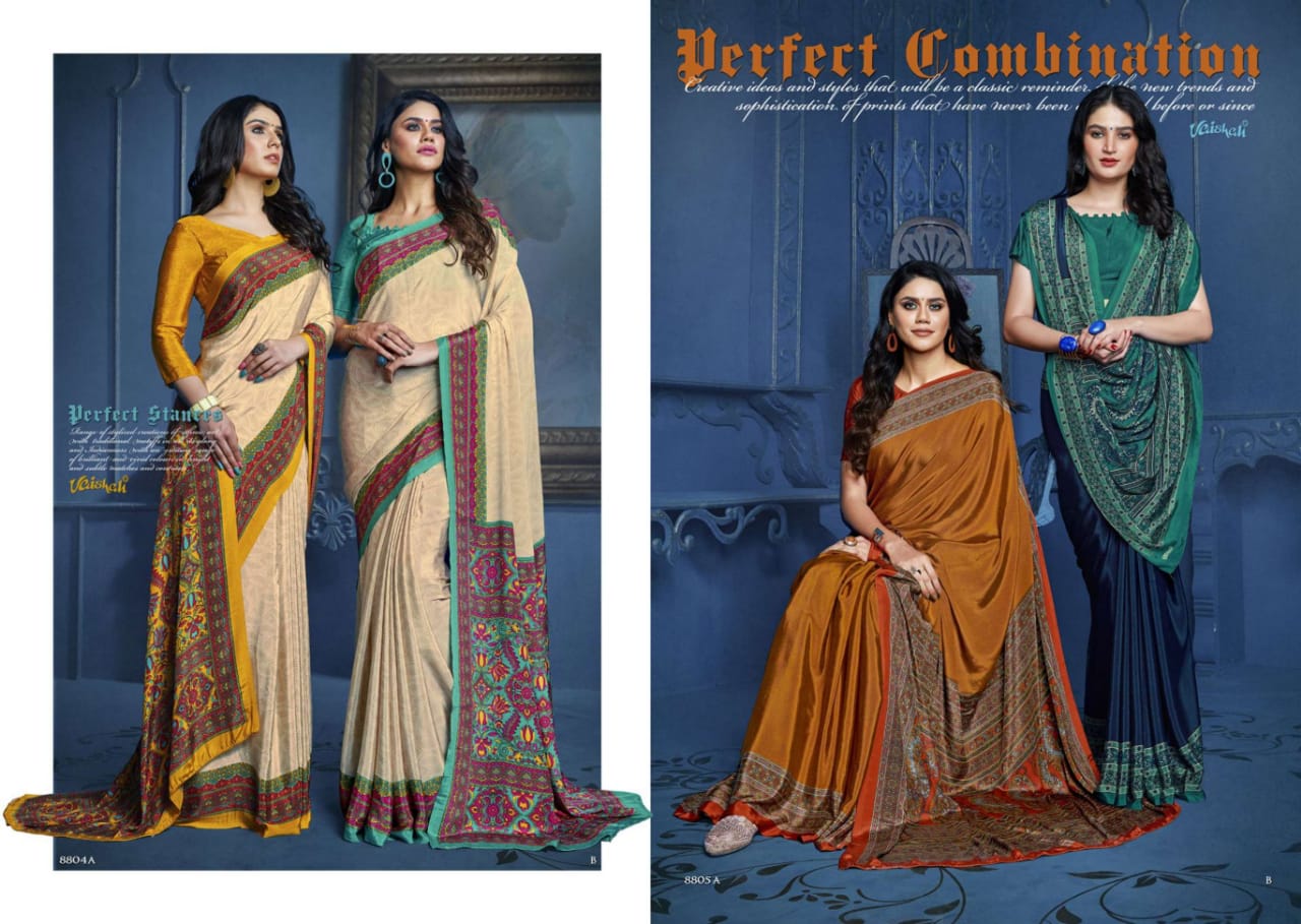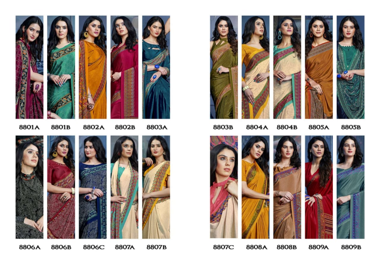 Catlog name - ART OF TRADITION . Fabric - Crape Series - 8801 to 8817. Rate- 598 per pcs . MOQ - 39 GST 5 Percent Extra. Delivery from today |