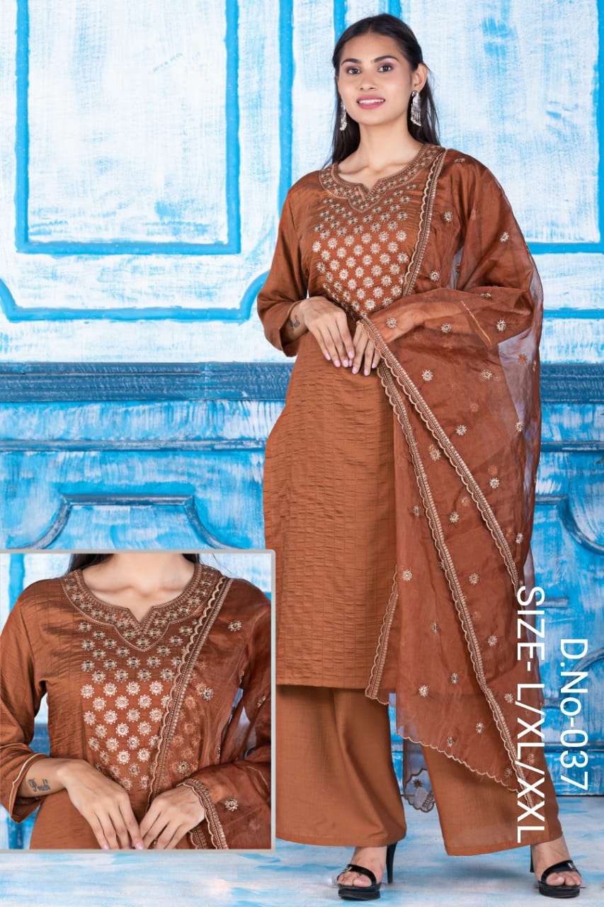 Dear Customer, We are launching our new Designer Sets Dno : 037 Fabrics - Chinon Silk Kurta with Palzzo & Dupatta Sizes - L, XL, XXL * Set to set (Combo)* Rate 975/- only GST 5 Percent Extra. Delivery 3-4 days Book your order now . |