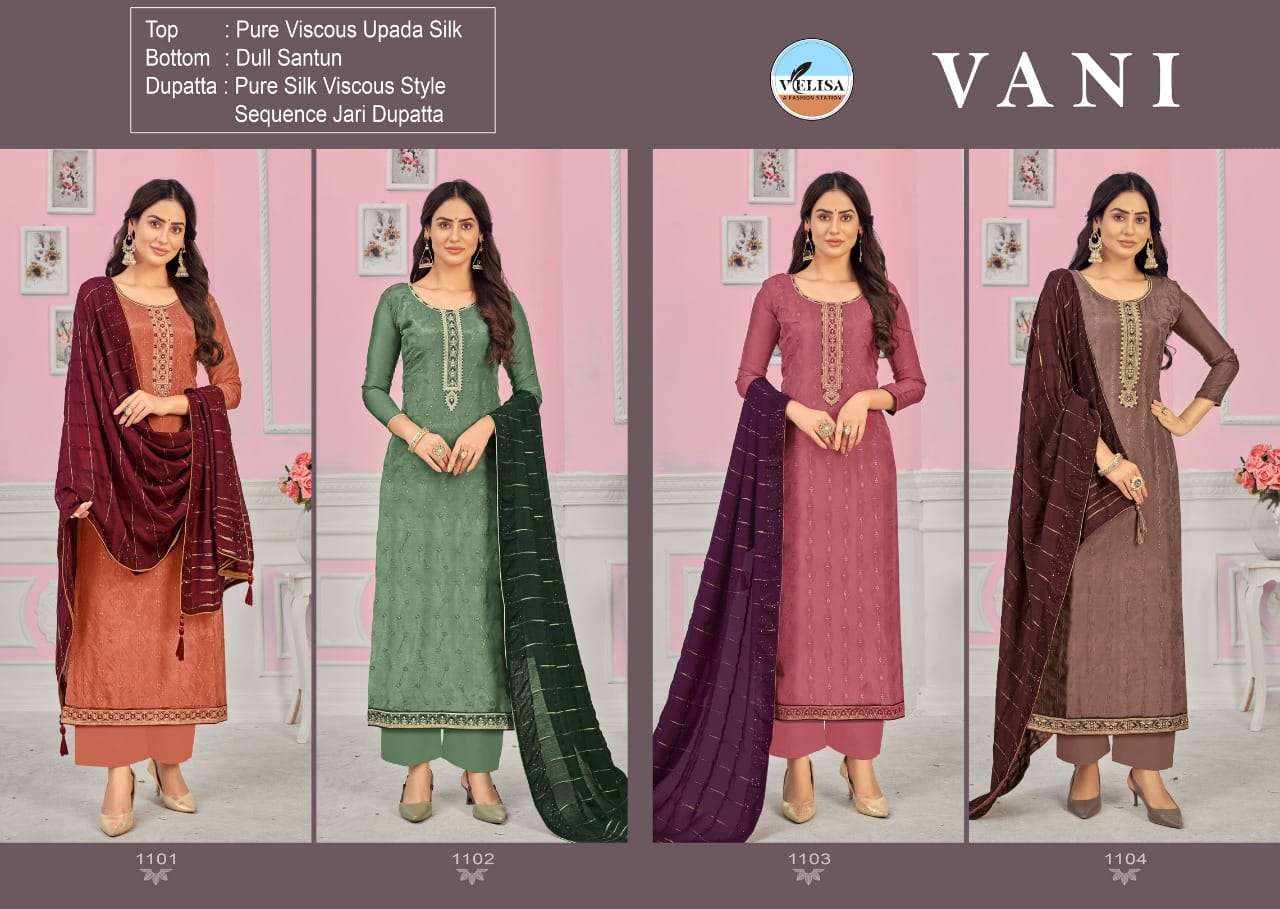 DESCRIPTION:-VANI Top:-Pure viscous upada silk with heavy embro work Bottom:- Dull santun Dupatta:- Pure Silk lining viscous pattern sequence Design :- 4 Pcs Rate :- 950/- Special:- Upada colour Set to set Having limited stock Please order now REGARDS:- VELISA Â Â Â Â Â Â Â A brand by SMF Â Â Â Â Â Â Â Â Â Â Surat |