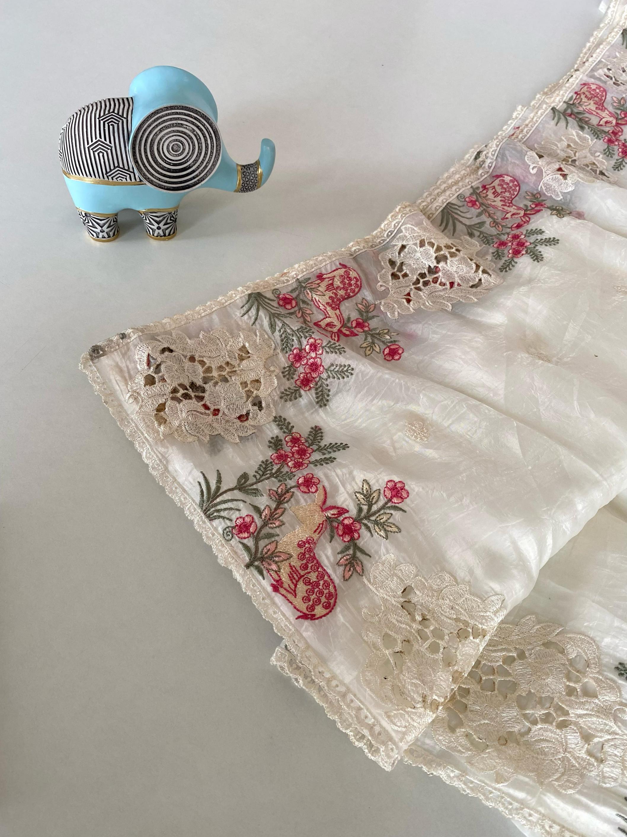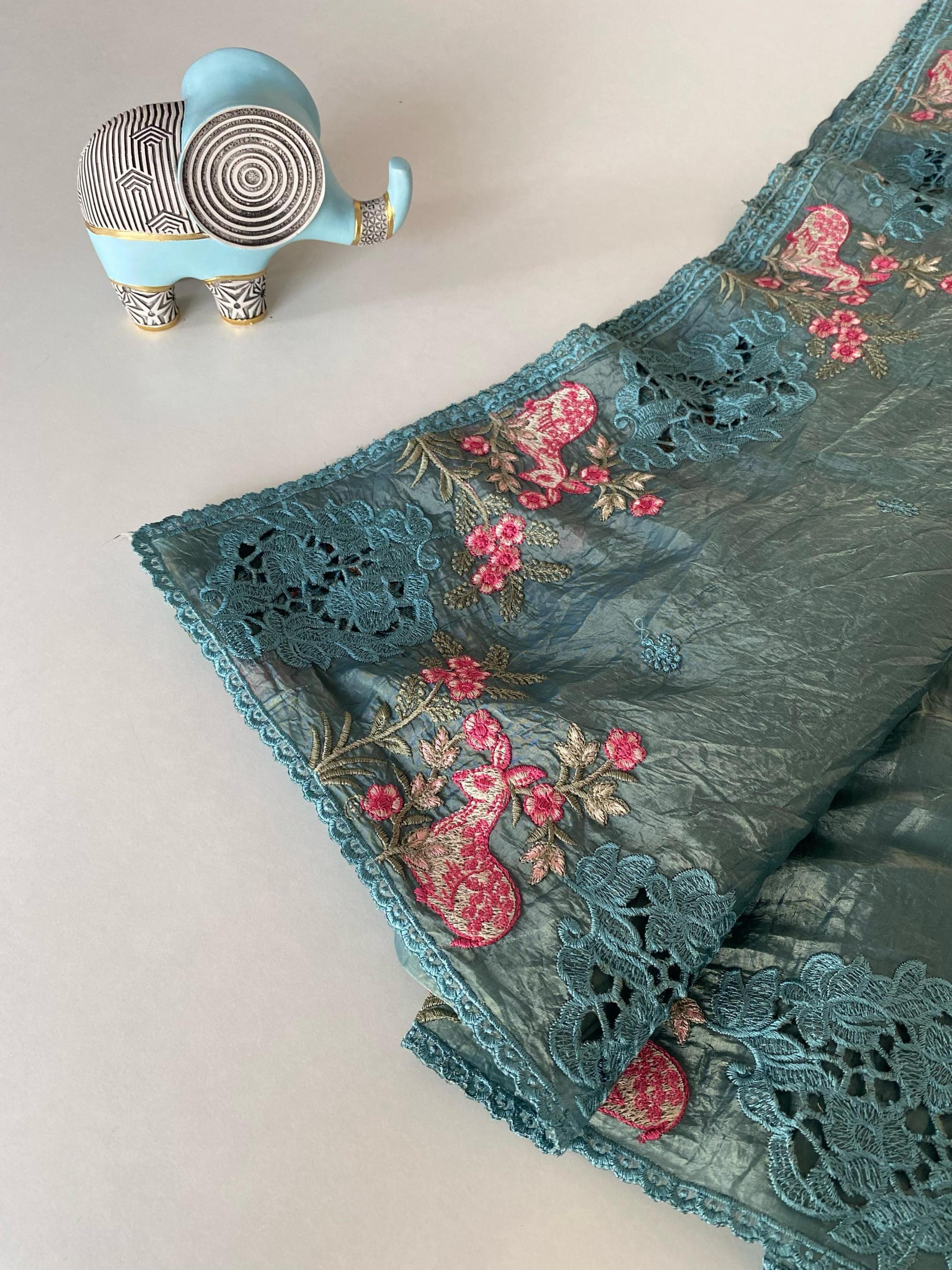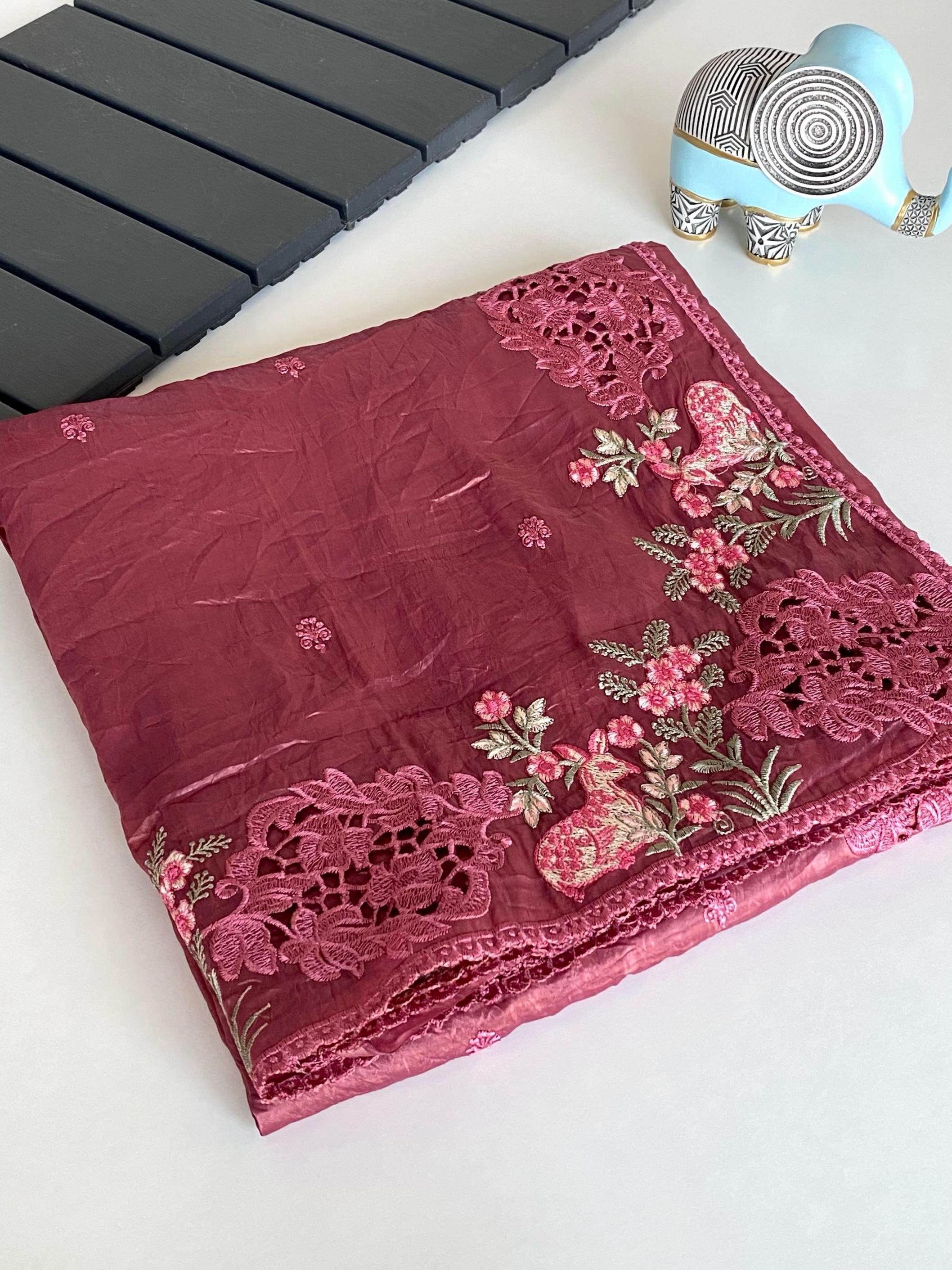 Premium collection saree. Catalogue - Vani 🥻👉🏻Description - Pure crush silk saree with all over embroidery design and cut work design. 👉🏻 Highlight - Intricate embroidery designed contrast pallu. 😍 👉🏻 1350/- Ready to ship 🚢🚢🚢 |