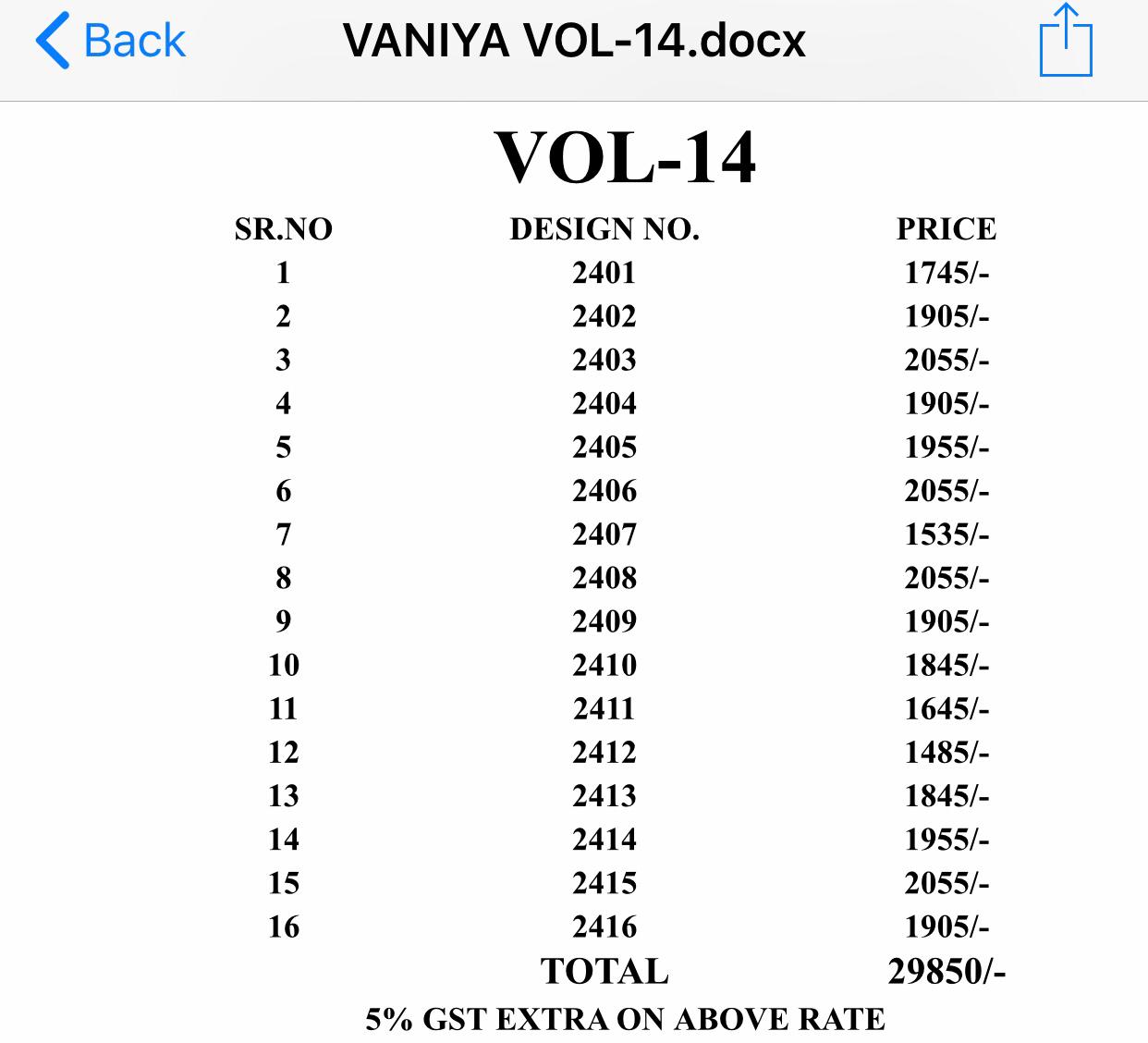 Brand - Vanya . Catlog Name - Vol -14. Series -2401 to 2416. Avarage price 1866 GST 5 Percent Extra. Delivery from tomorrow |