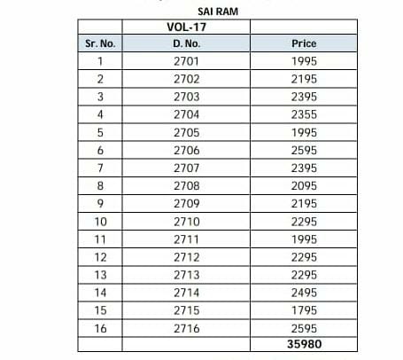 Catalog - Vol 17 Type - saree. Series - 2701 to 2716. Rate - 2249/-₹ Set to Set GST 5 Percent Extra. Delivery from today |