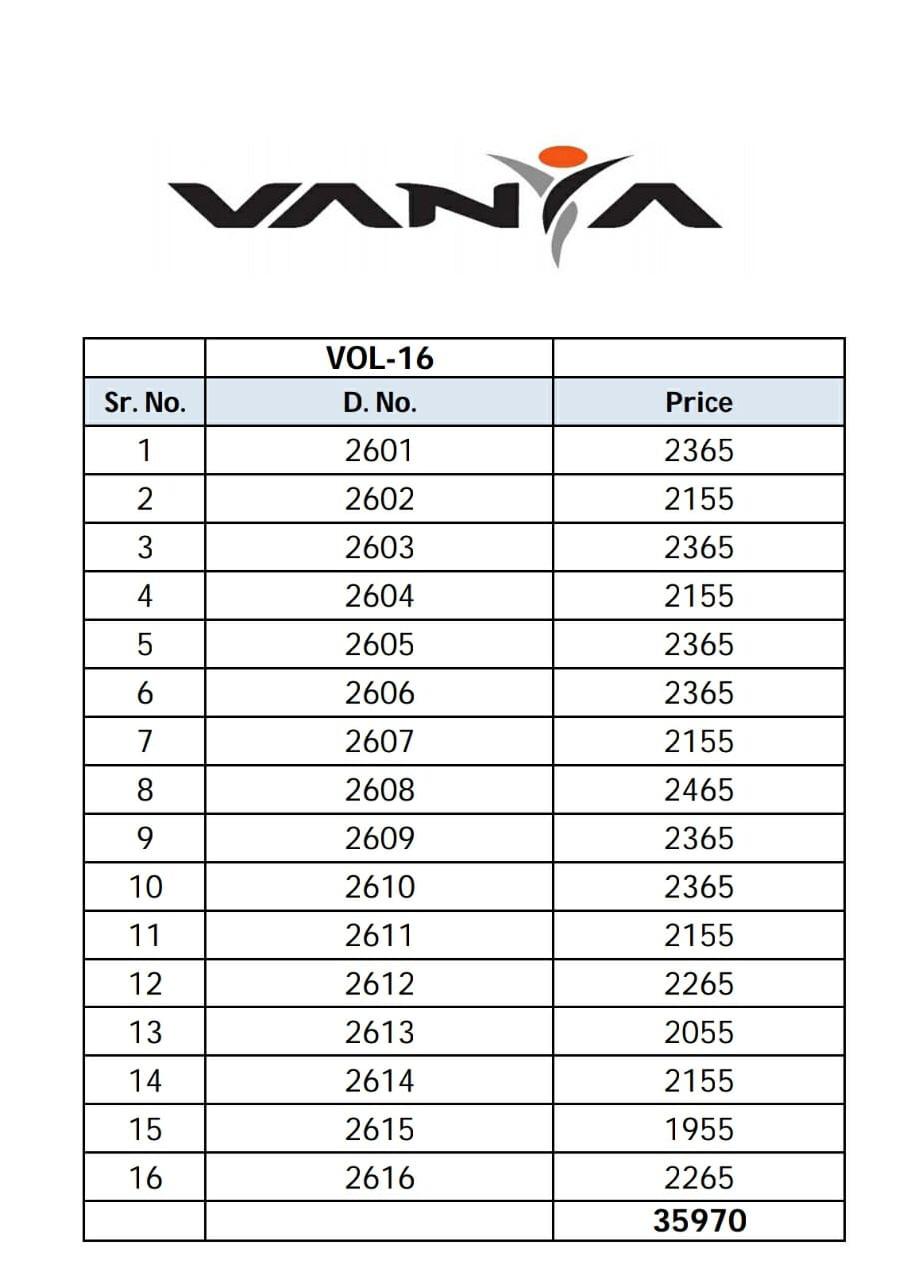 Brand - VANYA . Catlog name - Vol -16. Series - 2601 to 2616. SET TO SET ONLY PRICE LIST HAS ATTACHED GST 5 Percent Extra. Delivery from tomorrow |