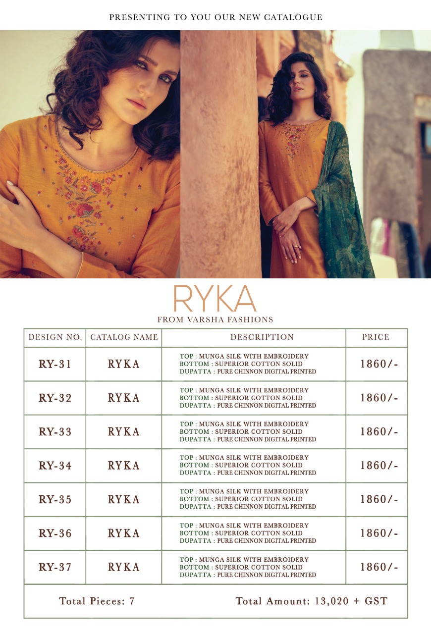 Presenting to you our new catalogue. RYKA From Varshaa Top:- Pure Munga Silk With Embroidery Bot:- Superior Cotton Dup:- Pure Chinon Digital Printed Rate:- 1860/- 1 Set:- 07pcs. |