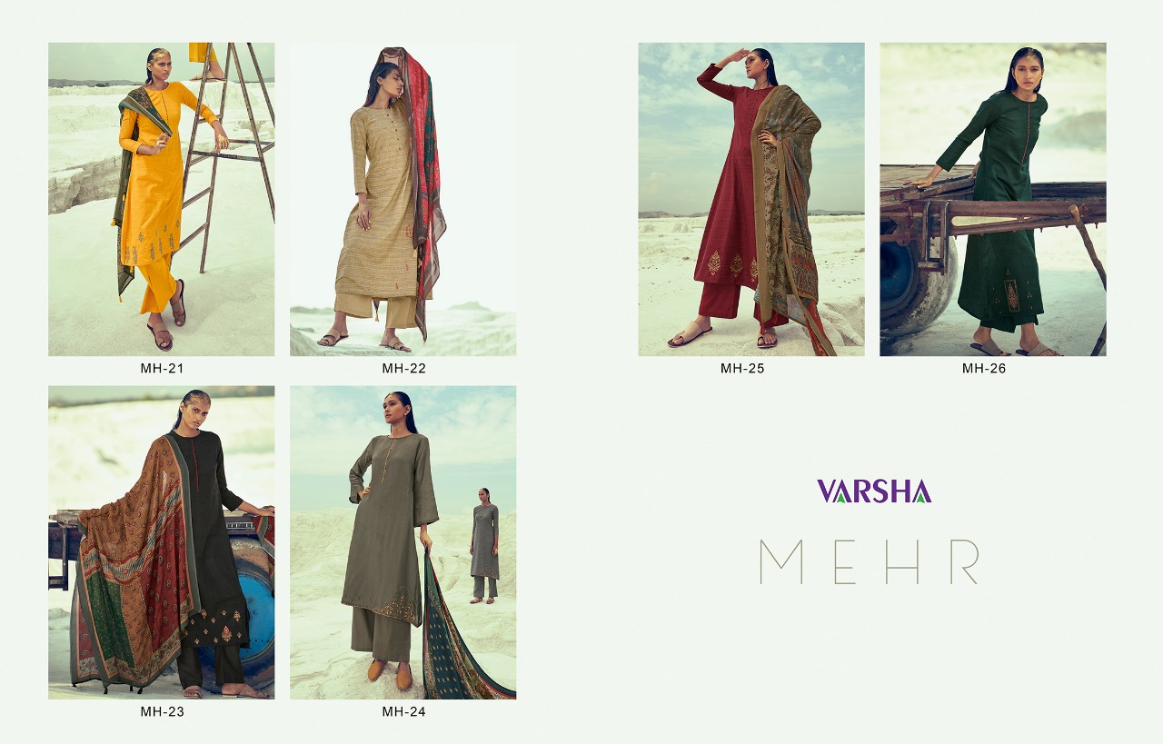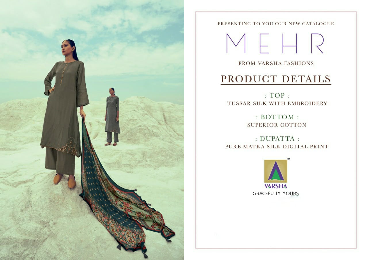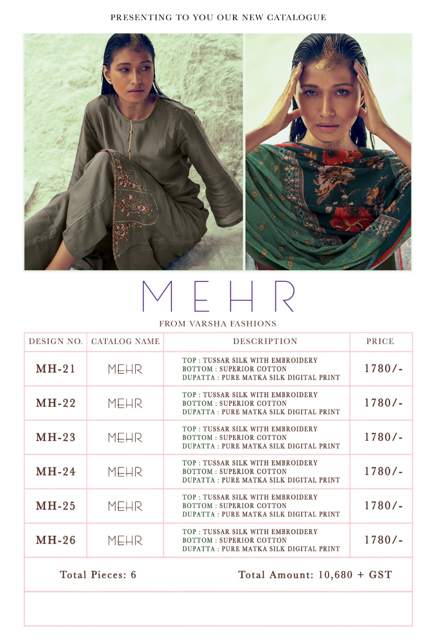 Presenting to you our new catalogue. MEHR From - Varshaa Top - Tussar Silk With Embroidery Bot - Superior Cotton Solid Dup - Pure Matka Silk Digital Prints Rate:- 1780/- 1 Set:- 06 pcs. |