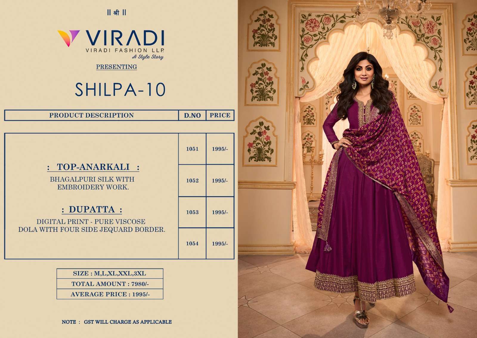 This catalogue is not just a collection of clothing; it's a reflection of our brand's values, style, and commitment to quality. Our new catalog is a testament to our commitment to offering you the latest trends, exceptional quality, and unmatched comfort. PRESENTING SHILPA-10 TOP - ANARKALI - BHAGALPURI SILK WITH EMBROIDERY WORK DUPATTA - DIGITAL PRINT PURE VISCOSE DOLA WITH FOUR SIDE JEQUARD BOARDER . AVAILABLE SIZE - L,XL,2XL |