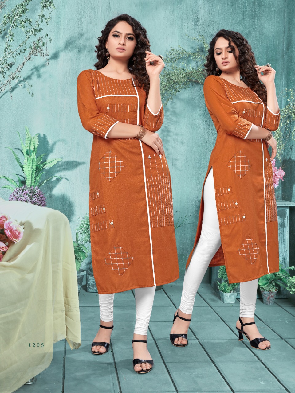 Ved Tex PRODUCTS Catalog : Heer Vol-1 Fabric : Ruby Slub Work - Embroidery Length - 46" Inner Full - Butter Crepe Size M-(38). L-(40). Xl-(42) Xxl-(44) Designs : 6 Rate : 425 |