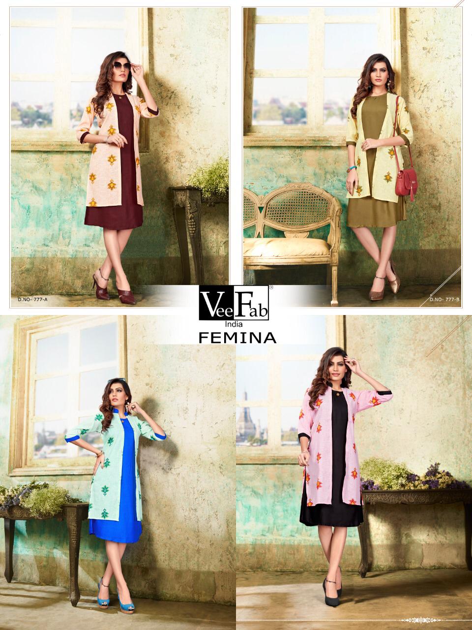 VEE FAB INDIA™ Catalog name : FEMINA With new concepts Inner : 14 Kg rayon solid Length 42 Sleeve less Jacket : cotton slub print Length 38 Size : L - XL - XXL Rate :. 520 + gst 5% Set To Set. Delivery- Today |