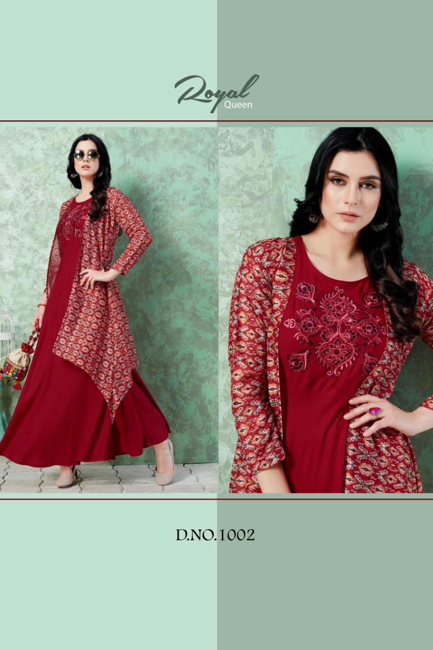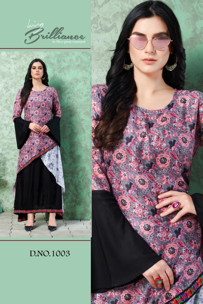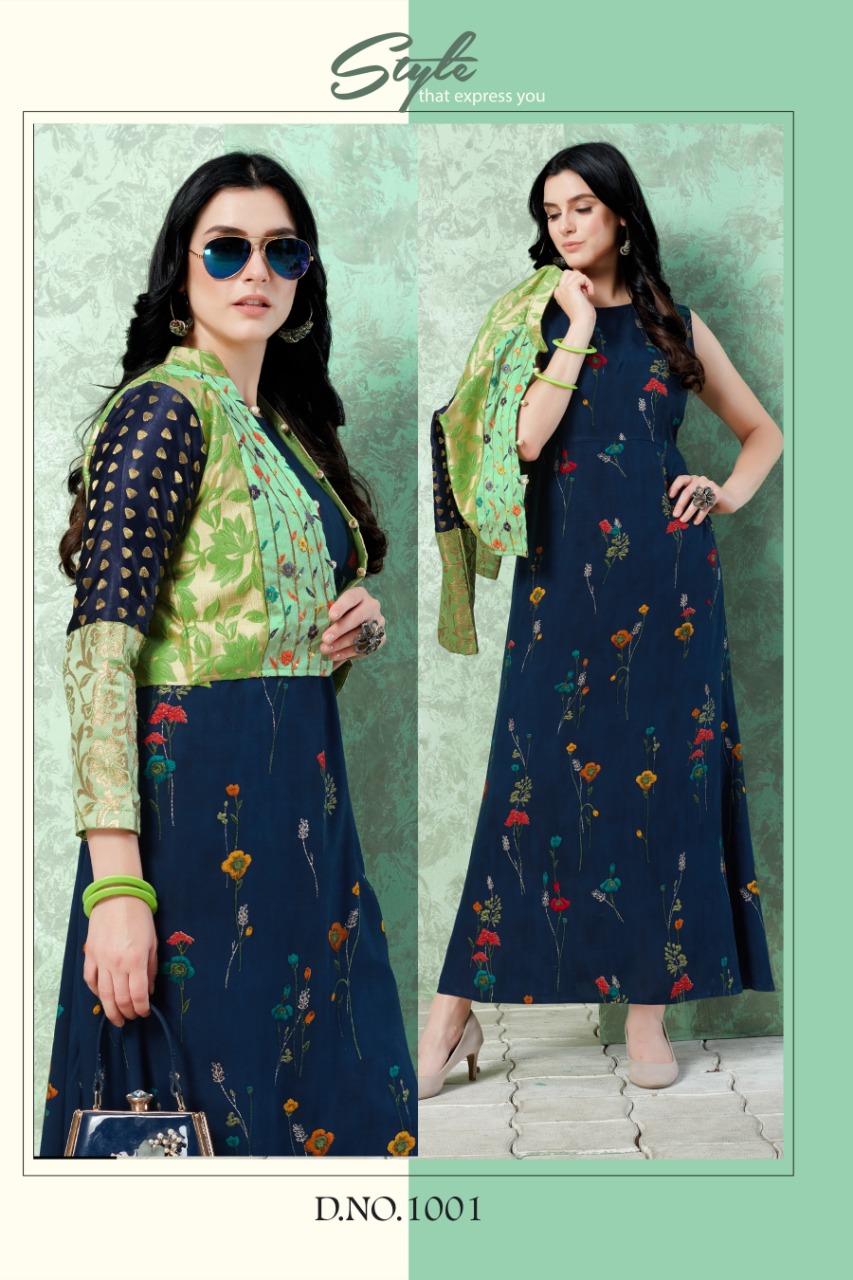 Catalogue name - Elissa Moq - 3 Size - 42" (margin 2 inch extra) ⚡Length - 52" Fabric :- 1⃣ D.N 1001 - kurti rayon premium + koti banglori silk and jackard 2⃣ D.N 1002 - kurti rayon dyed 14 kg + koti muslin digital print 3⃣ D.N 1003 - rayon 14 kg dyed + muslin digital print + work lace Additional - 3 to 4 mtr flare Price per pcs - 899 +GST High quality guaranteed Regards Vee Fab India |