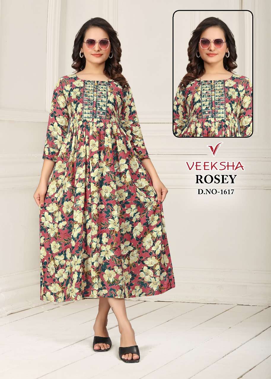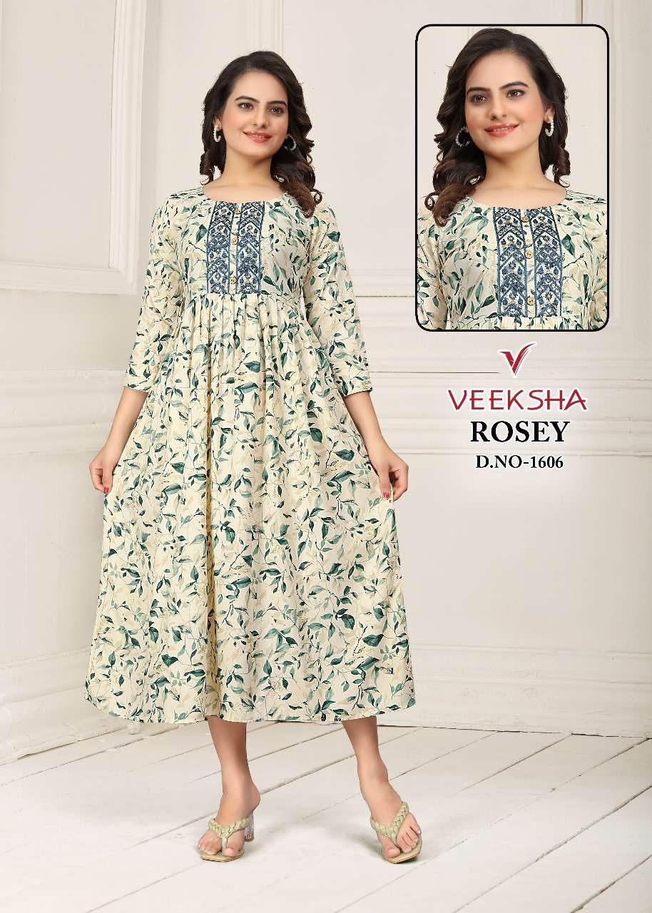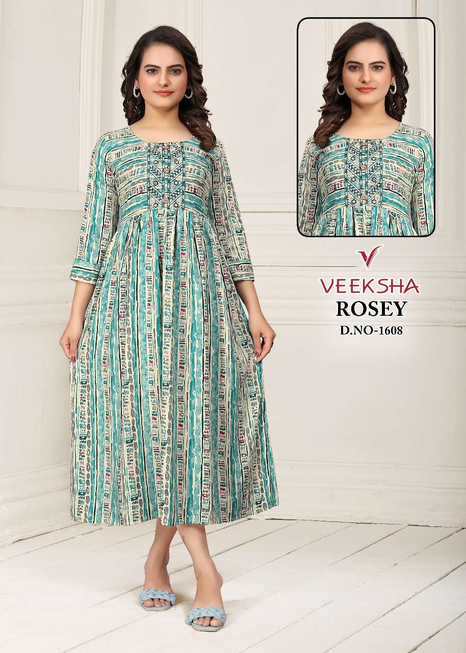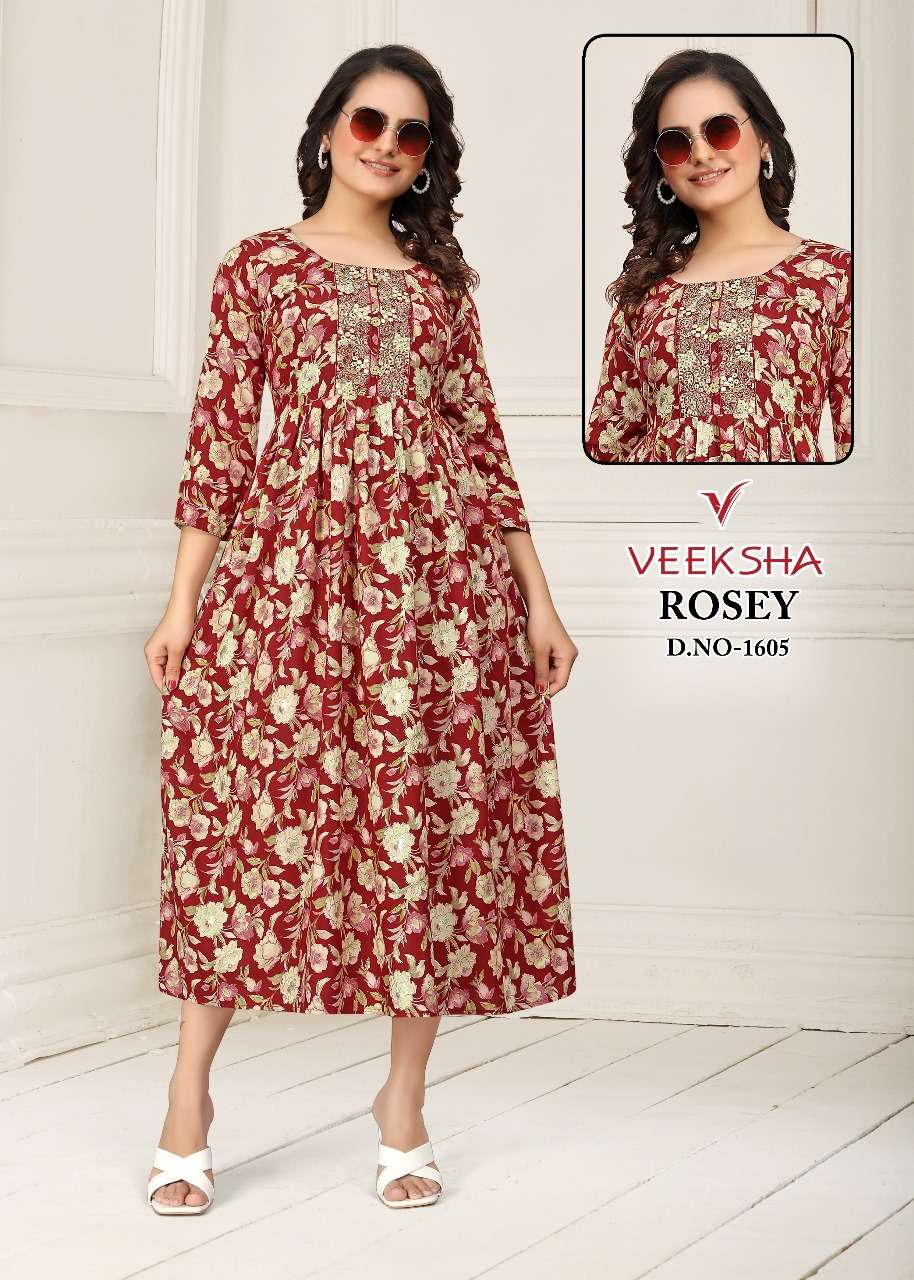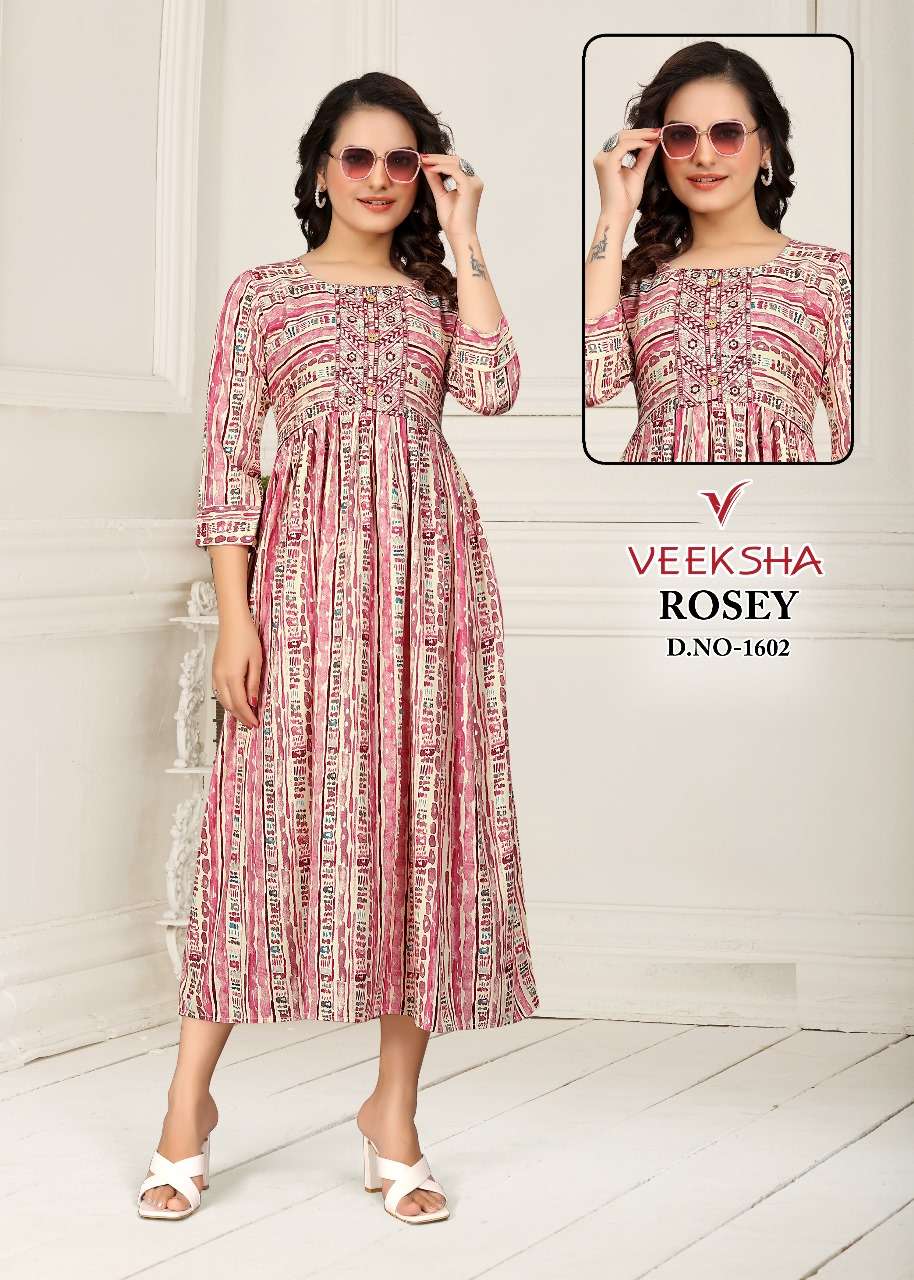 veeksha present rosey readymade nayra style flair rayon kurti combo set
