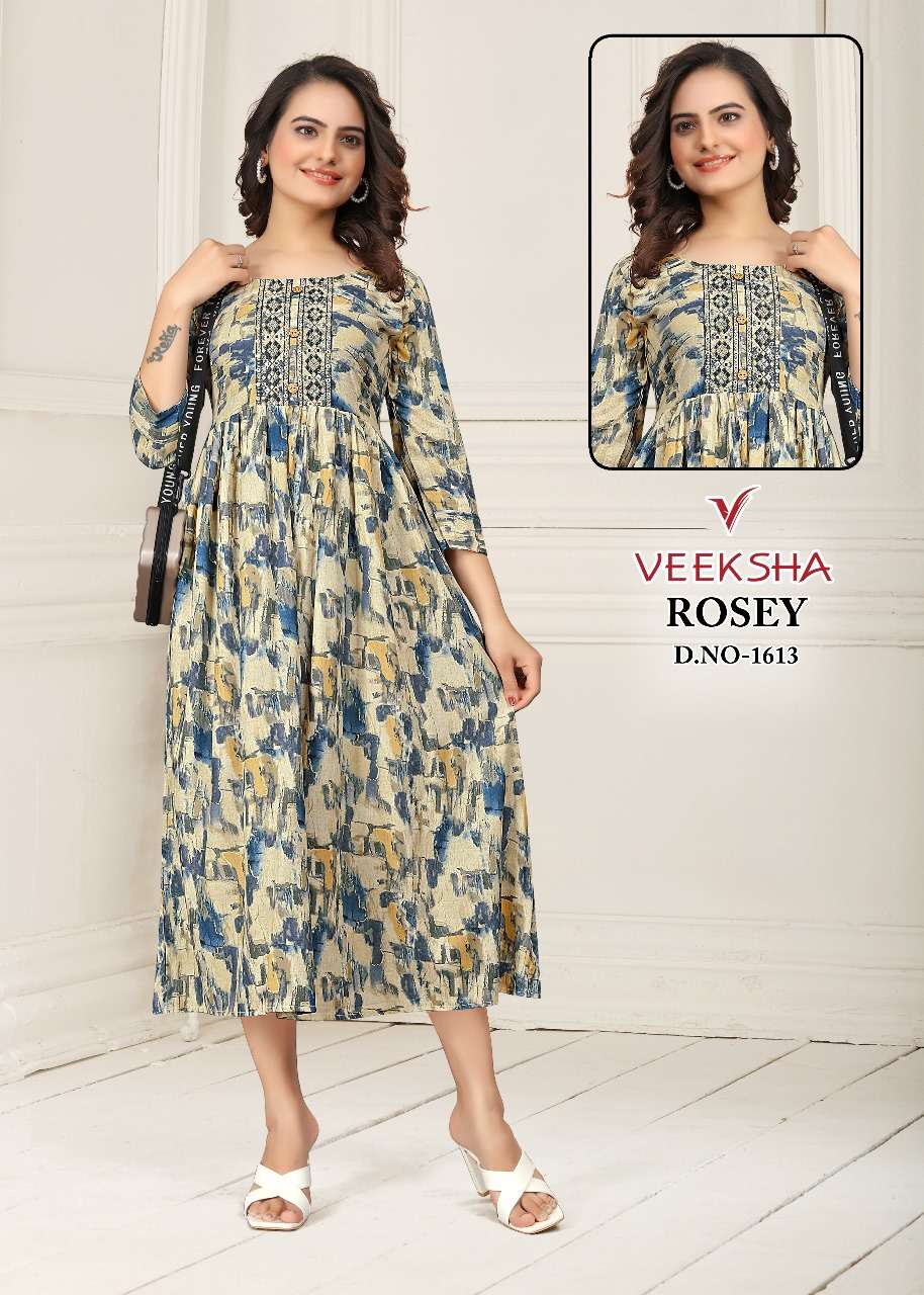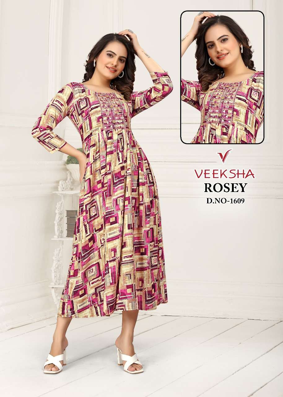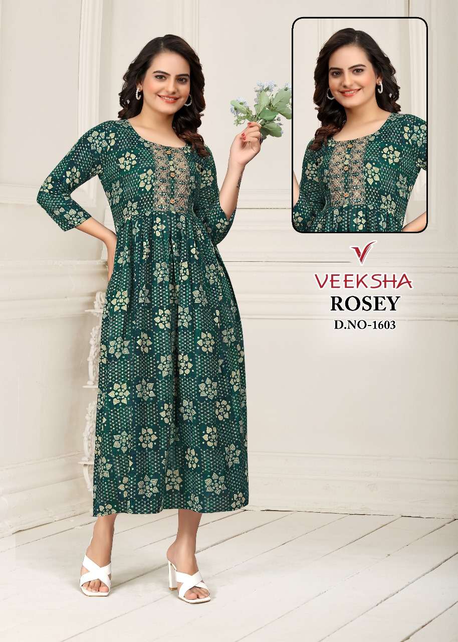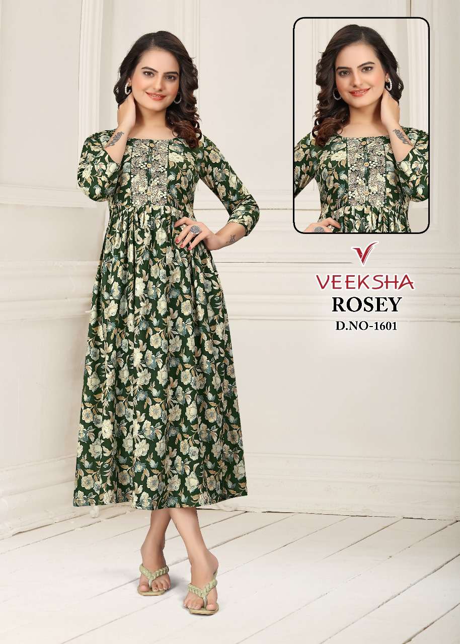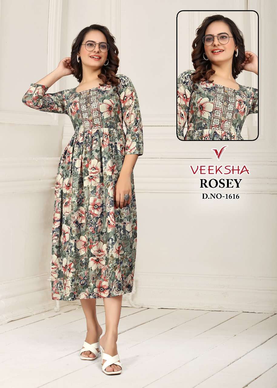 veeksha present rosey readymade nayra style flair rayon kurti combo set
