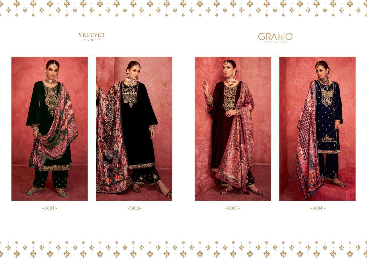 Gramo®️ ❤️ Velvet vol 3 ❤️(4 PCS) Being all new hue to your festive Wardrobe. An elite look to be carried for the fanciest colours of the season. Glam up your festive look with 4 Piece Set Of 4 Designs. FABRIC 👗 - Top hevy Velvet nine thausand with inar Rate 1850/- per pcs |
