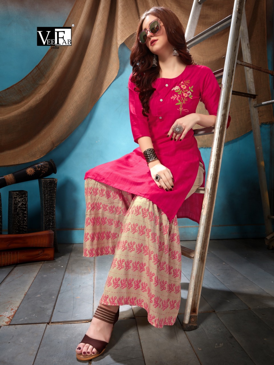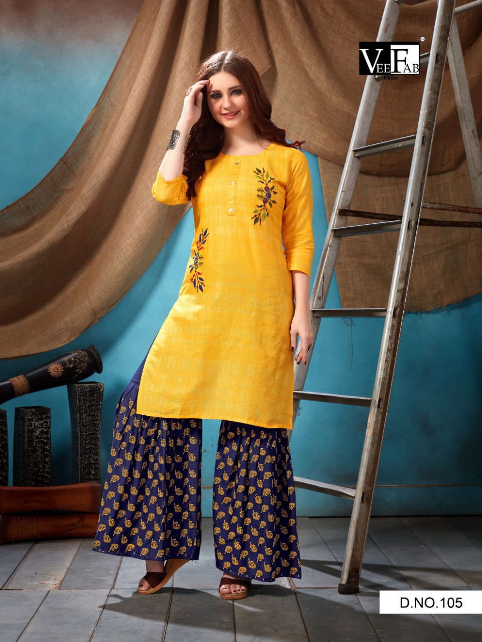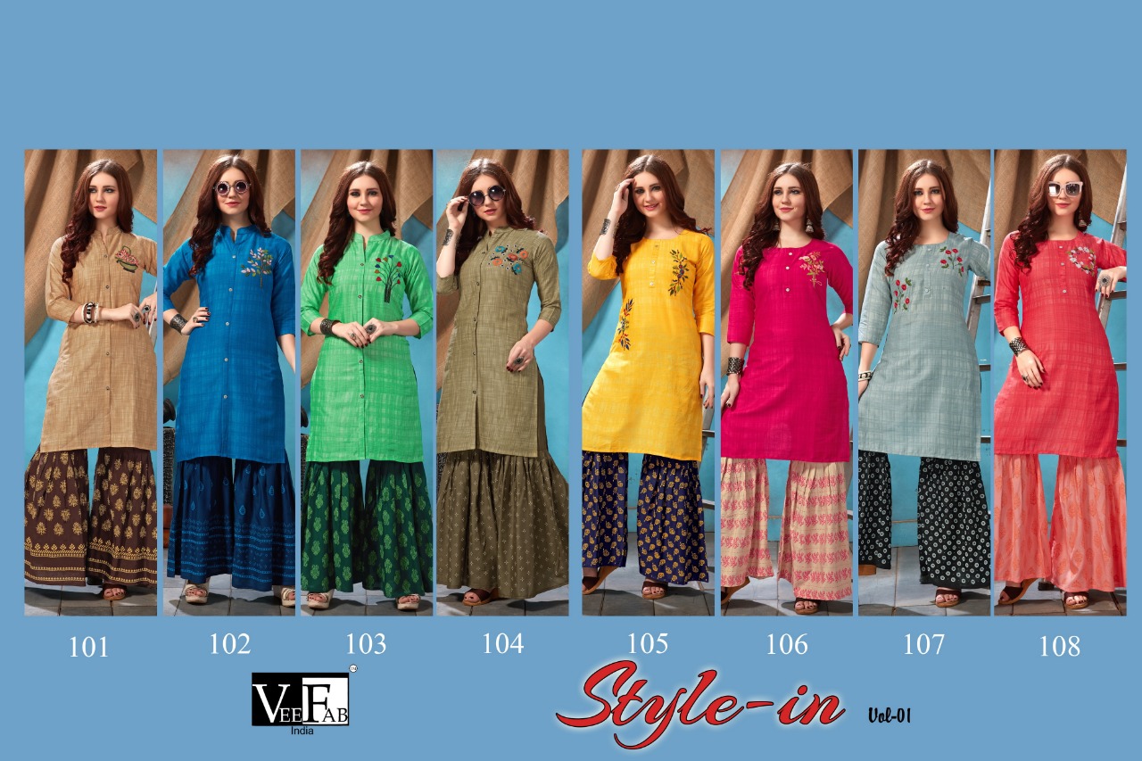 Brand name - Vee Fab India Catalogue name - STYLE IN Description Top : * cotton sitin with different type of Embroidery* Size - M- L -XL -XXl -XXXL Bottom(SHARARA) RAYON 14kg print design* -0ï¸Ââ£8ï¸Â⣠Rate - 650+GST Dispatch Wednesday |
