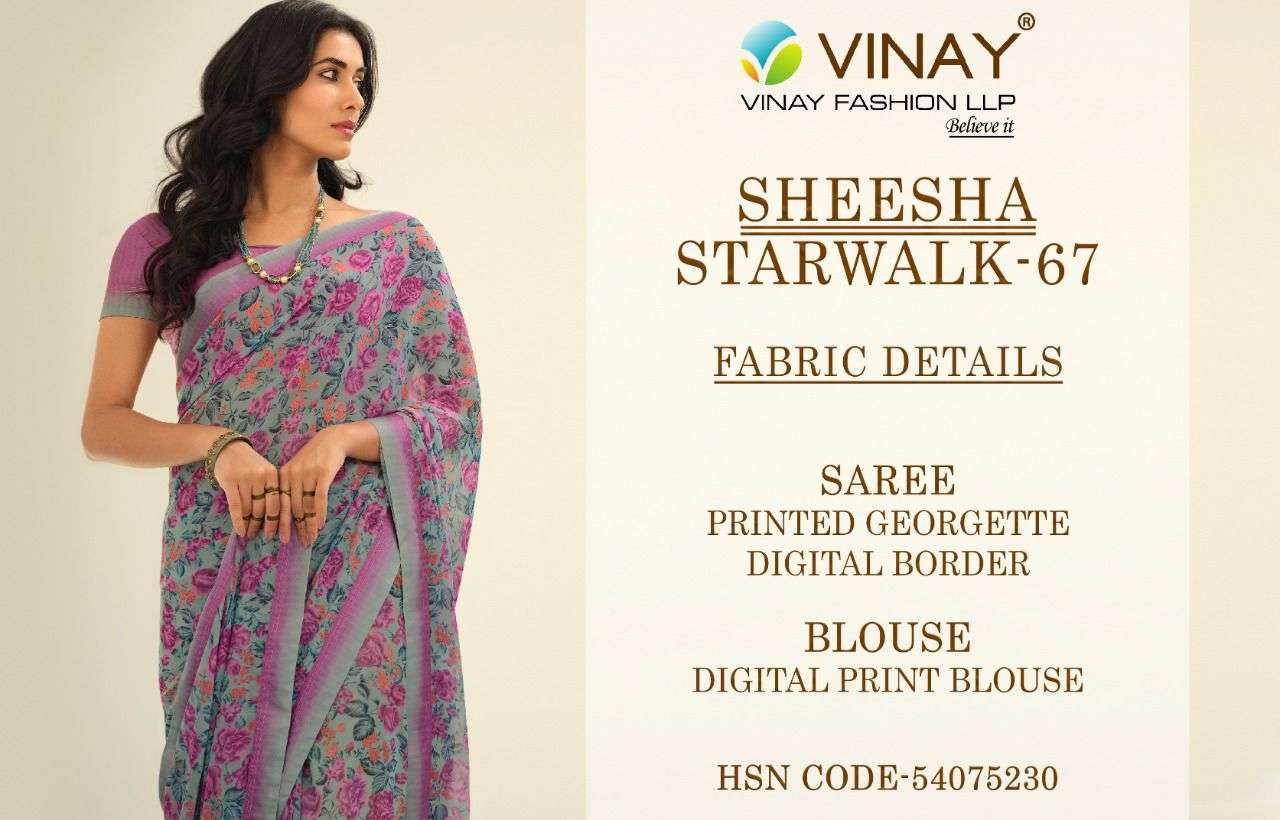 Vinay Fashion STARWALK-67 PRINTED GEORGETTE WITH DIGITAL BORDER & BLOUSE Per PCs RATE : 740/- ₹ 25/PIECE WILL CHARGE EXTRA FOR BOX PACKING |