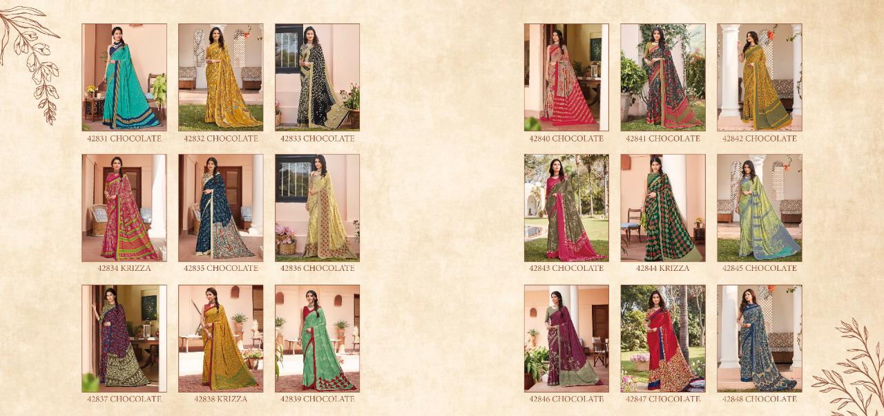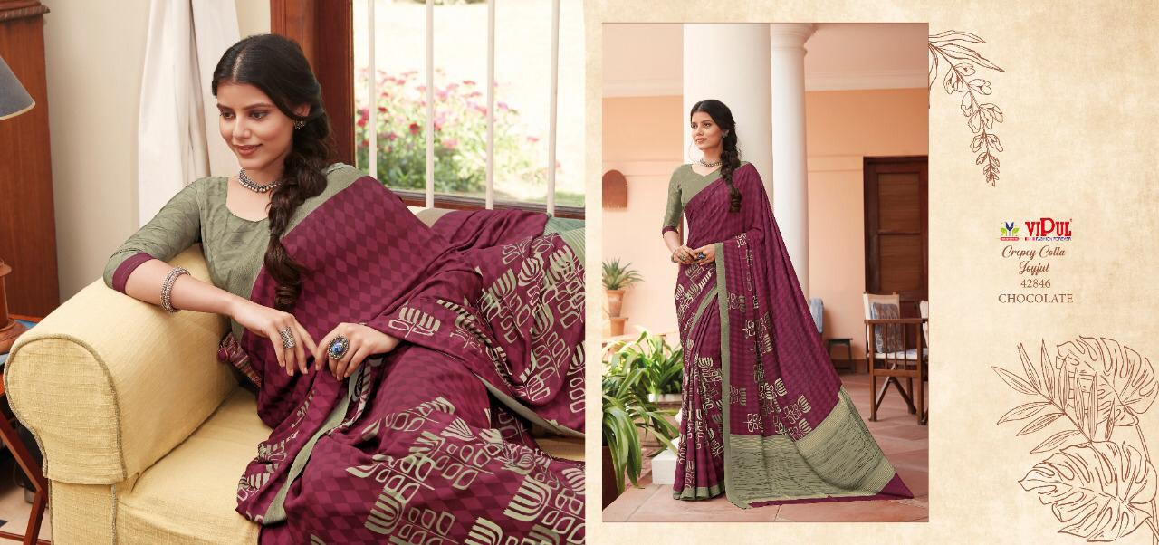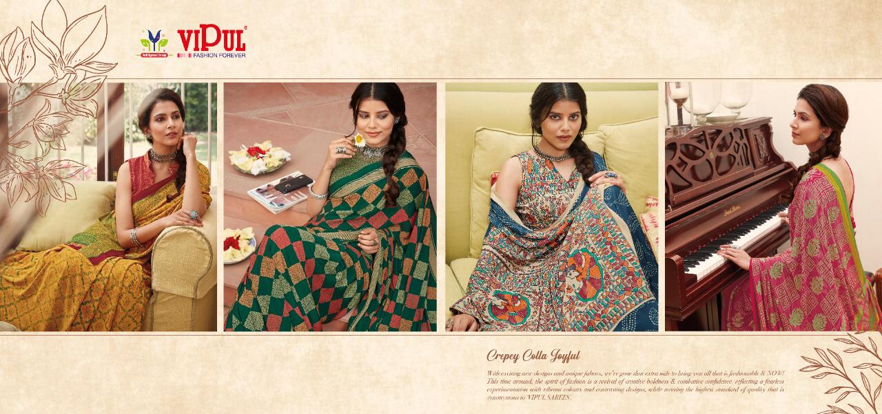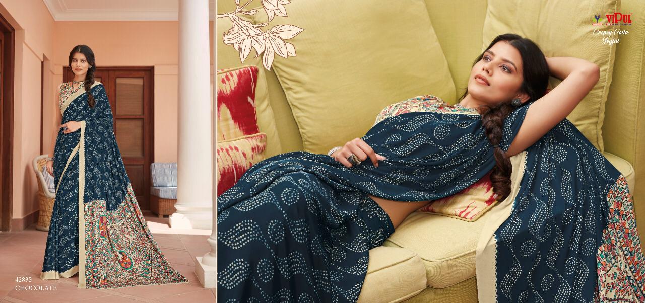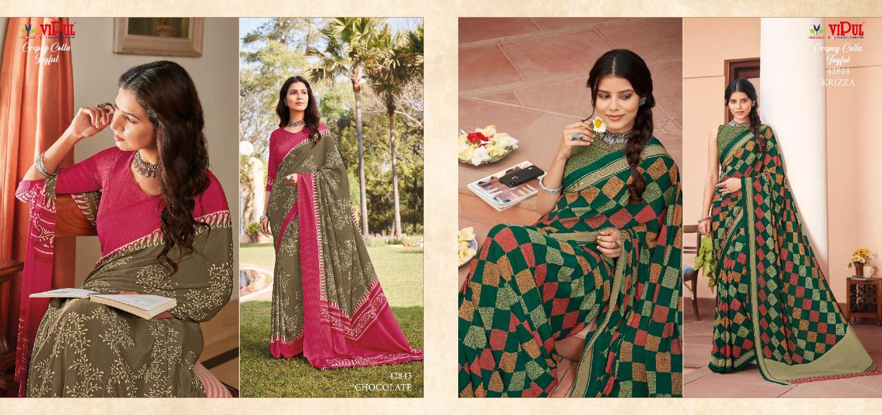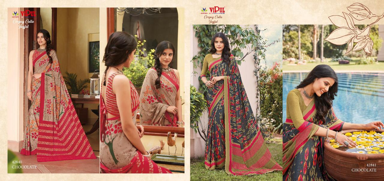 Vipul Crepey Colla Joyfull Pure Crape New Design Print Stylish Synthetic Saree Exporter
