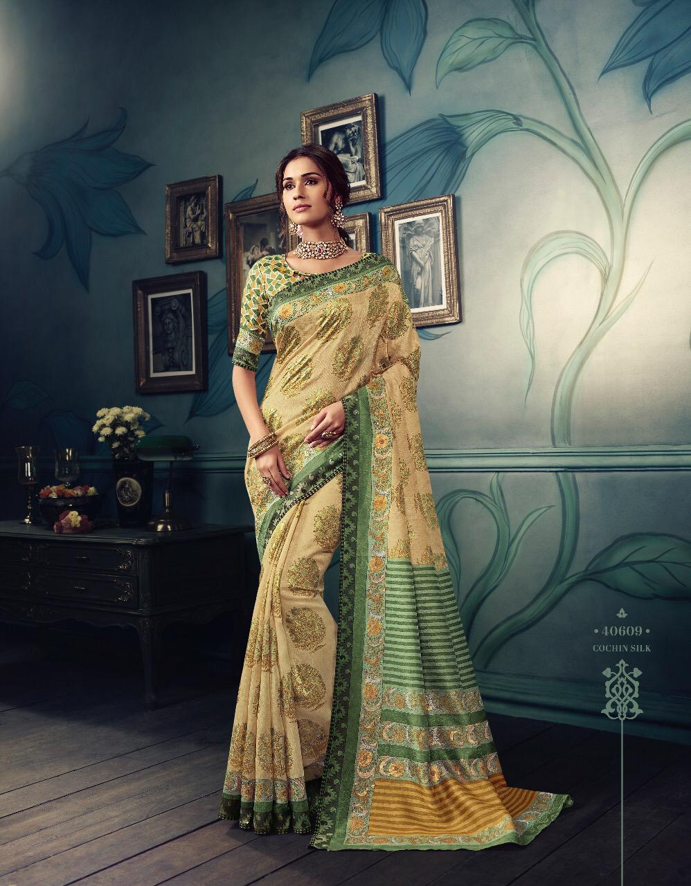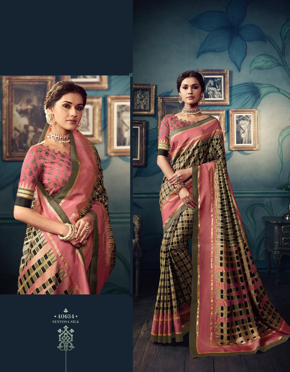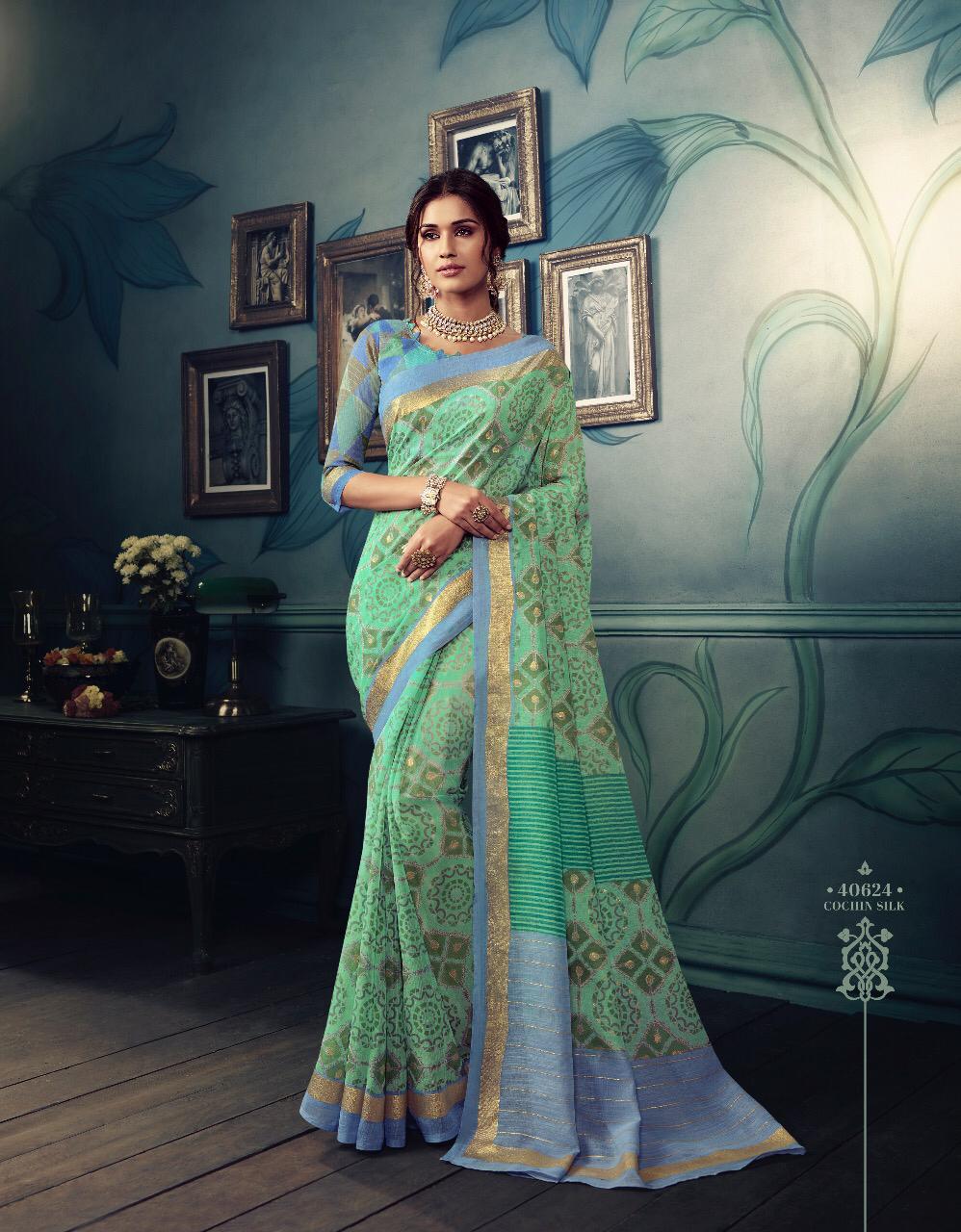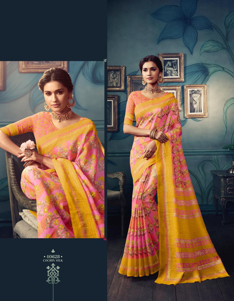 VIPUL CAT - 406 KOSTA SILK " MISHREE " ALL NEW SILK BASE FABRIC @ " DISCOVER YOUR UNIQUENESS " DISGUISE THE SPOTLIGHT WITH YOUR VARIOUS LOOKS & LET IT FOLLOW YOU. AVERAGE RATE-682₹ (Ratelist attached) 5%Gst Applicable Set to set Delivery 2 Days |