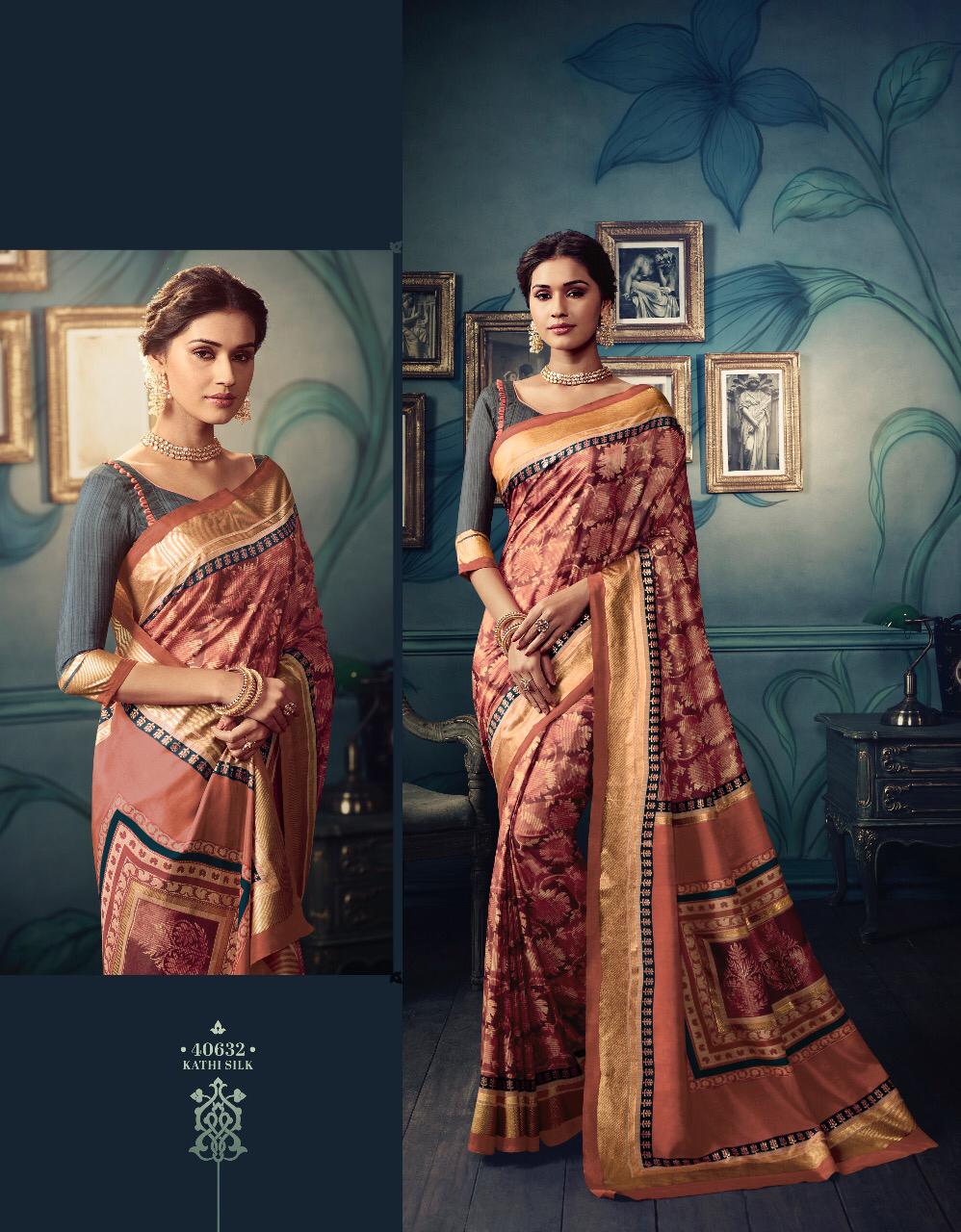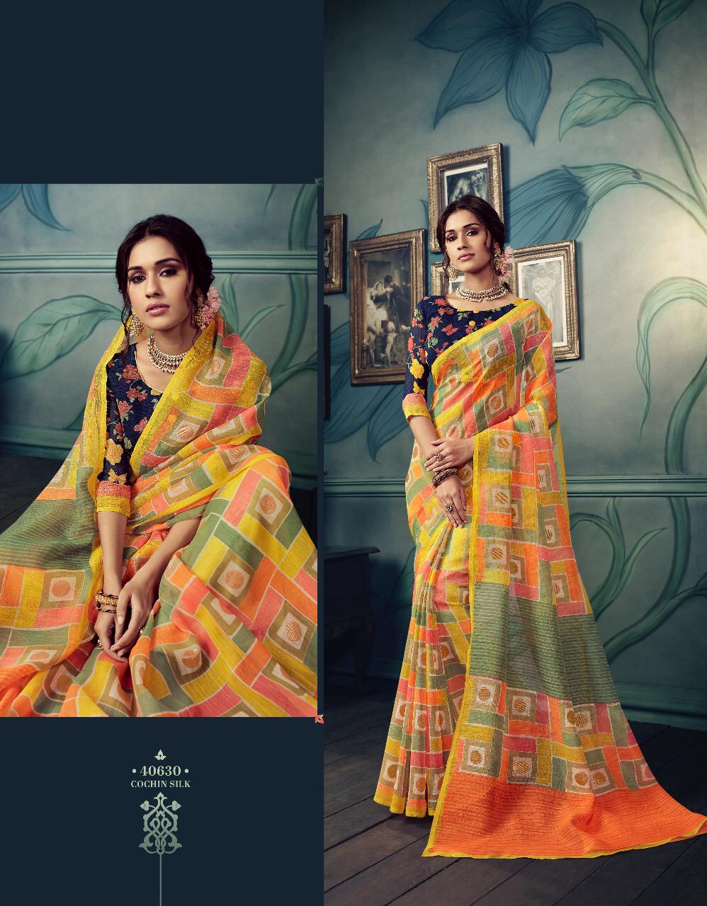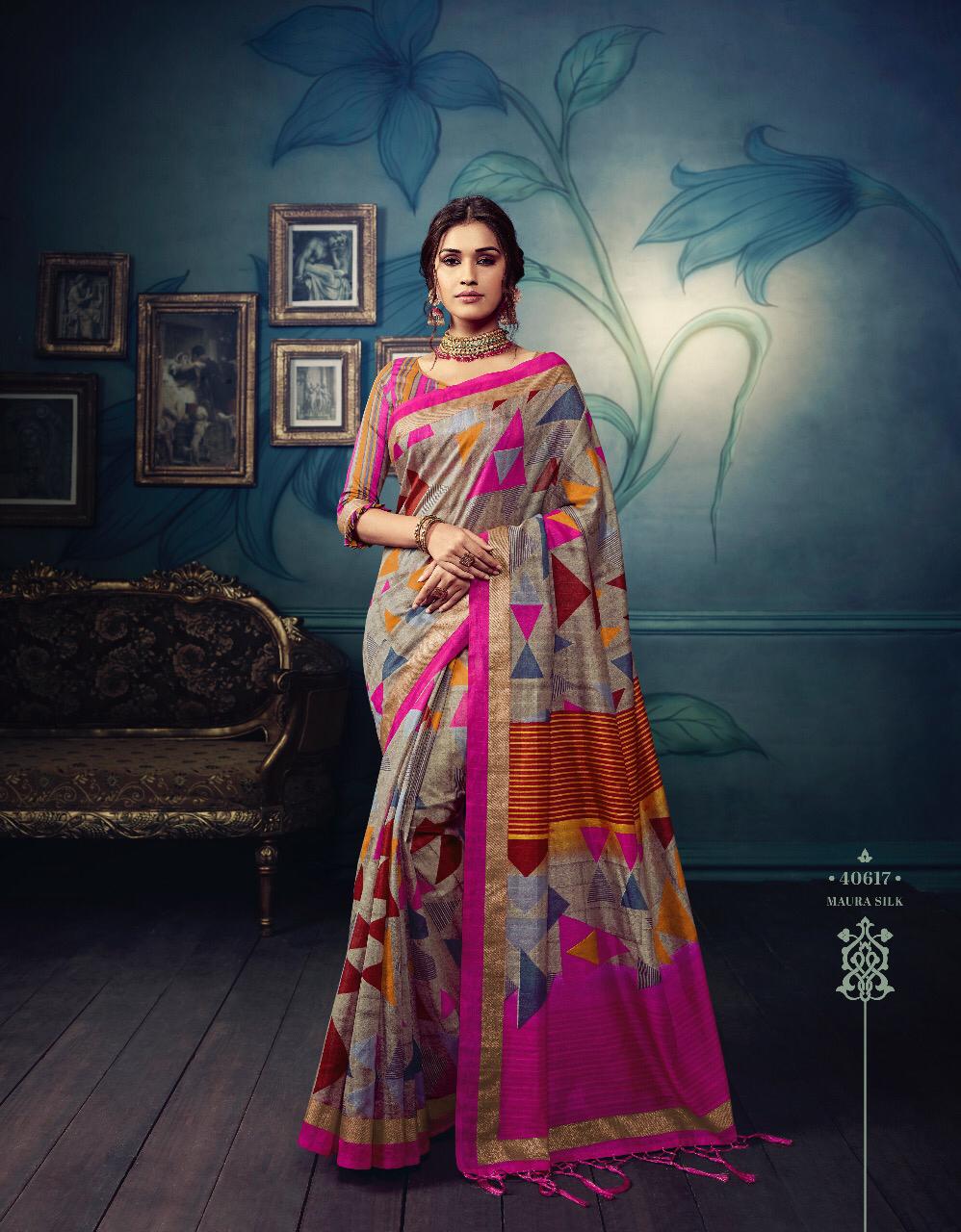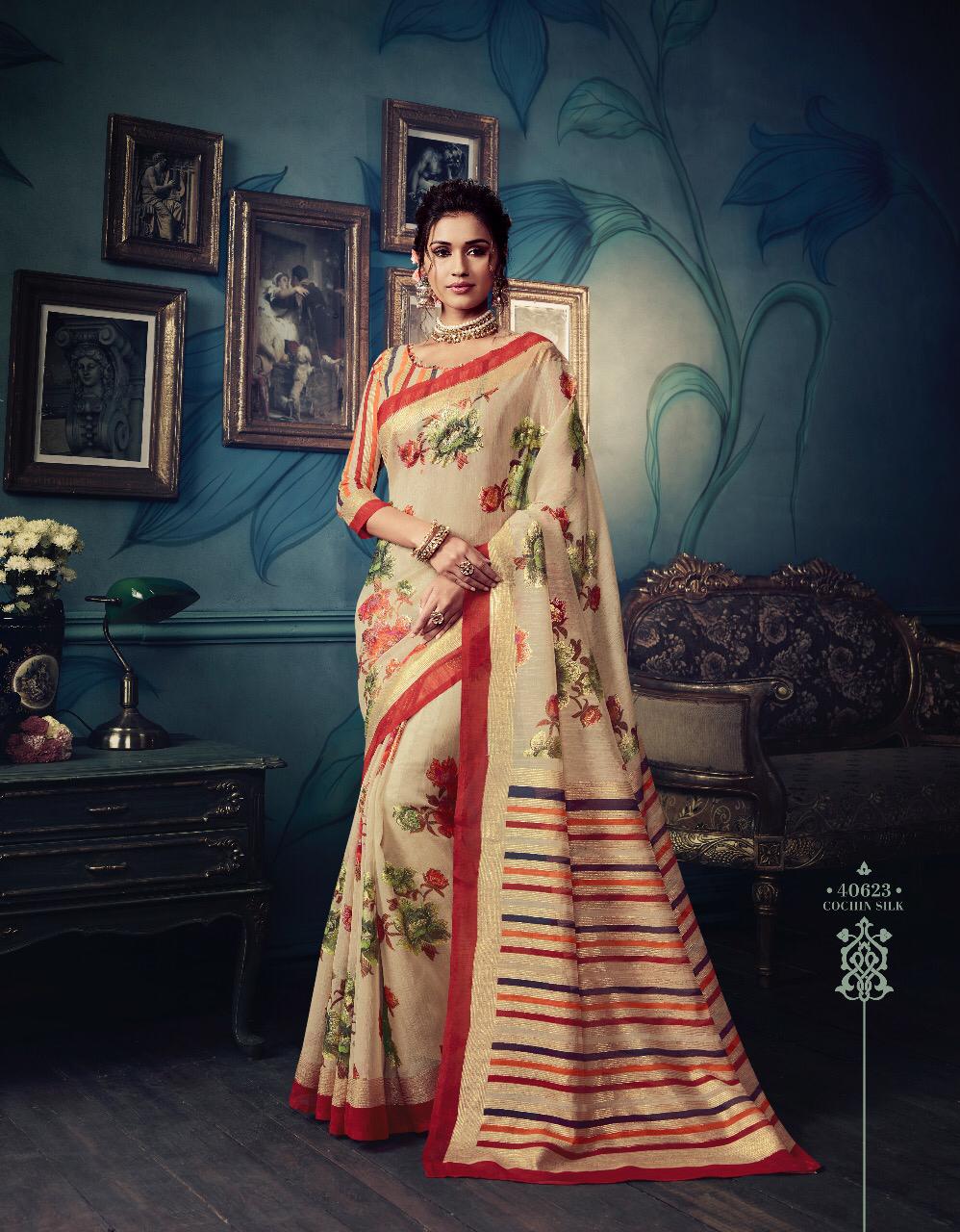 VIPUL CAT - 406 KOSTA SILK " MISHREE " ALL NEW SILK BASE FABRIC @ " DISCOVER YOUR UNIQUENESS " DISGUISE THE SPOTLIGHT WITH YOUR VARIOUS LOOKS & LET IT FOLLOW YOU. AVERAGE RATE-682₹ (Ratelist attached) 5%Gst Applicable Set to set Delivery 2 Days |