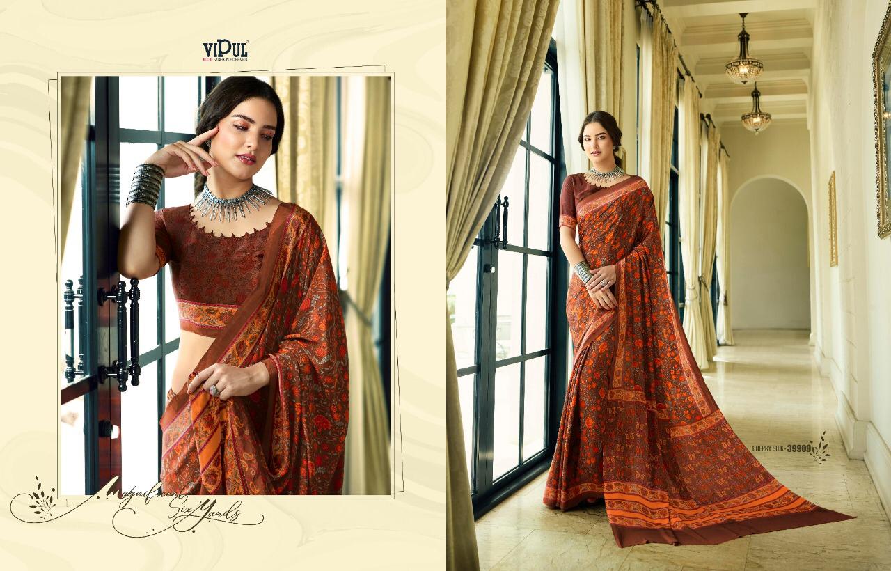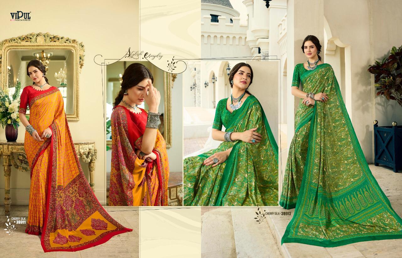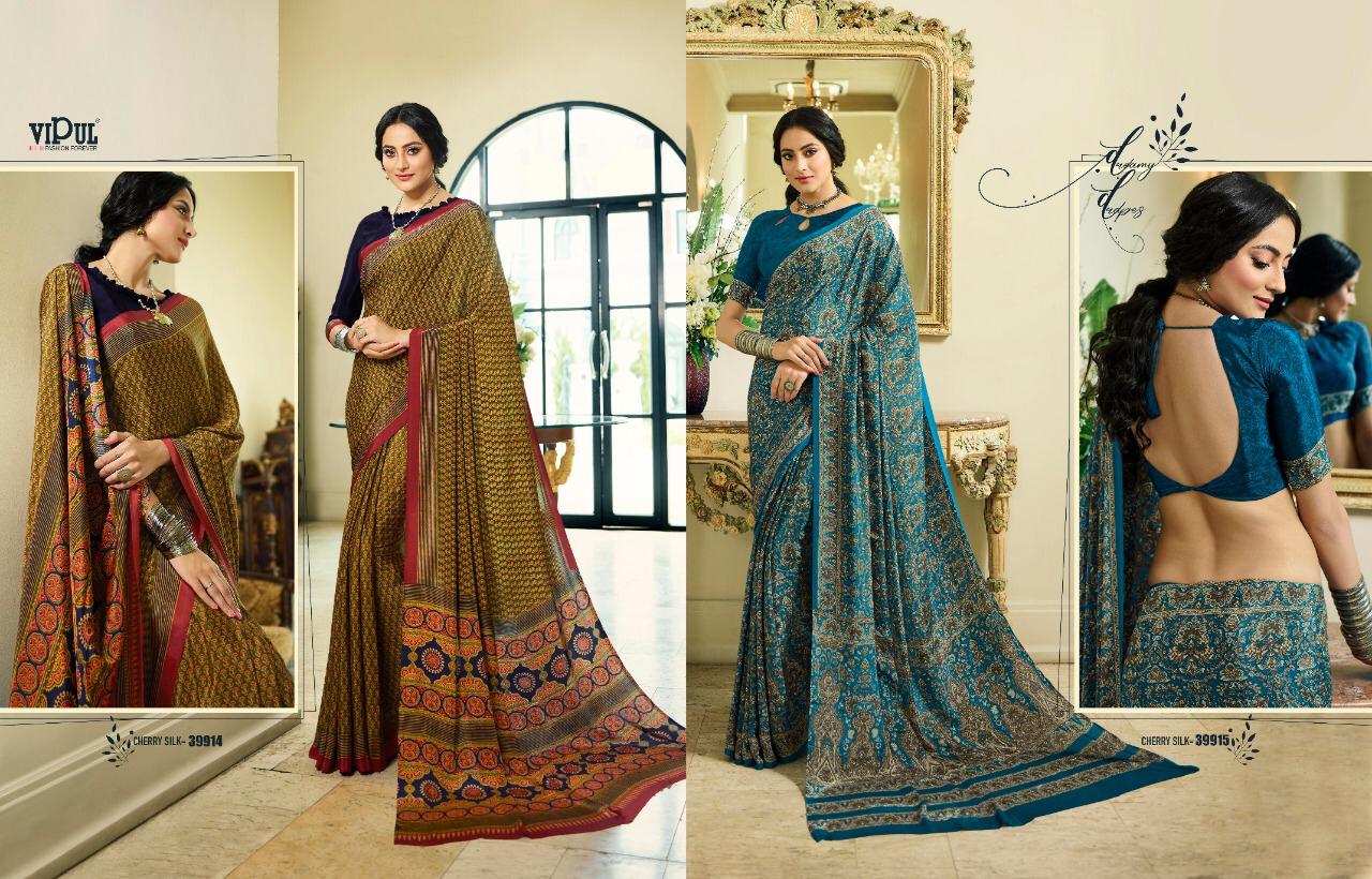 VIPUL *CAT-399 * *HERITAGE SILK - PEARL * NEW CREPEY TRADITIONAL SILKY PRINTS .YOU CAN MAKE THEM MEMORABLE BY DRAPING FOR ALLWAYS UNIFORM PURPOS. FABRIC-HEAVY CRAPE PRINTED RATE-550₹ 5%Gst Applicable Set to set Delivery 2 Days |