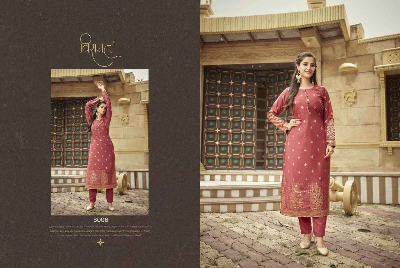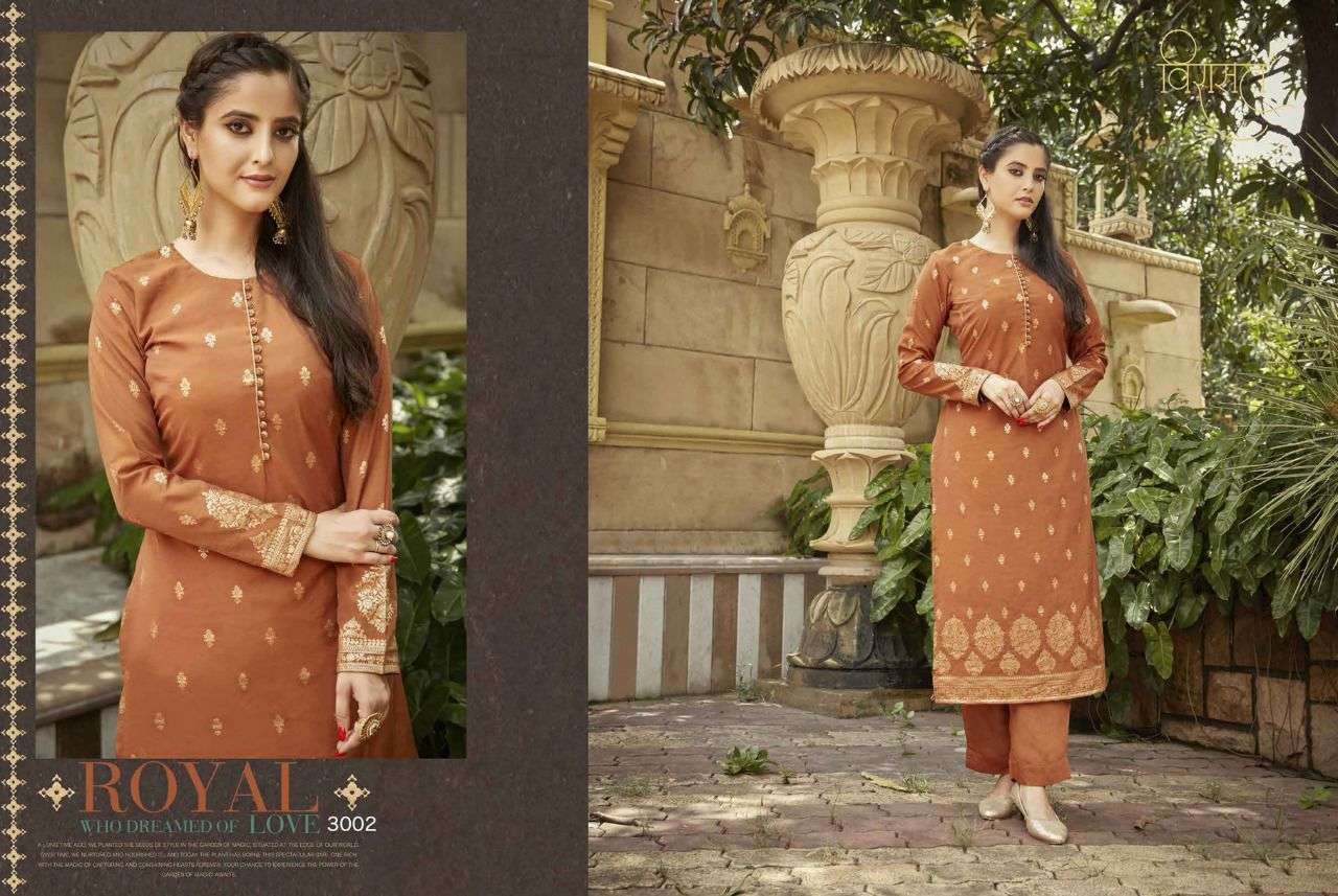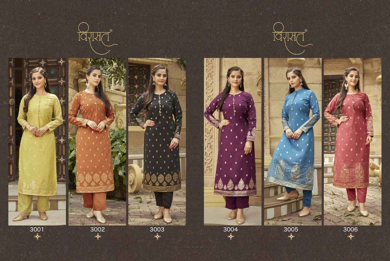 VIRASAT ROYAL 3001 SERIES Fabric Details:- Size (Full stitched) :- M(38),L(40),XL(42),XXL(44). Rate : 699/- per pcs GST : 5% |
