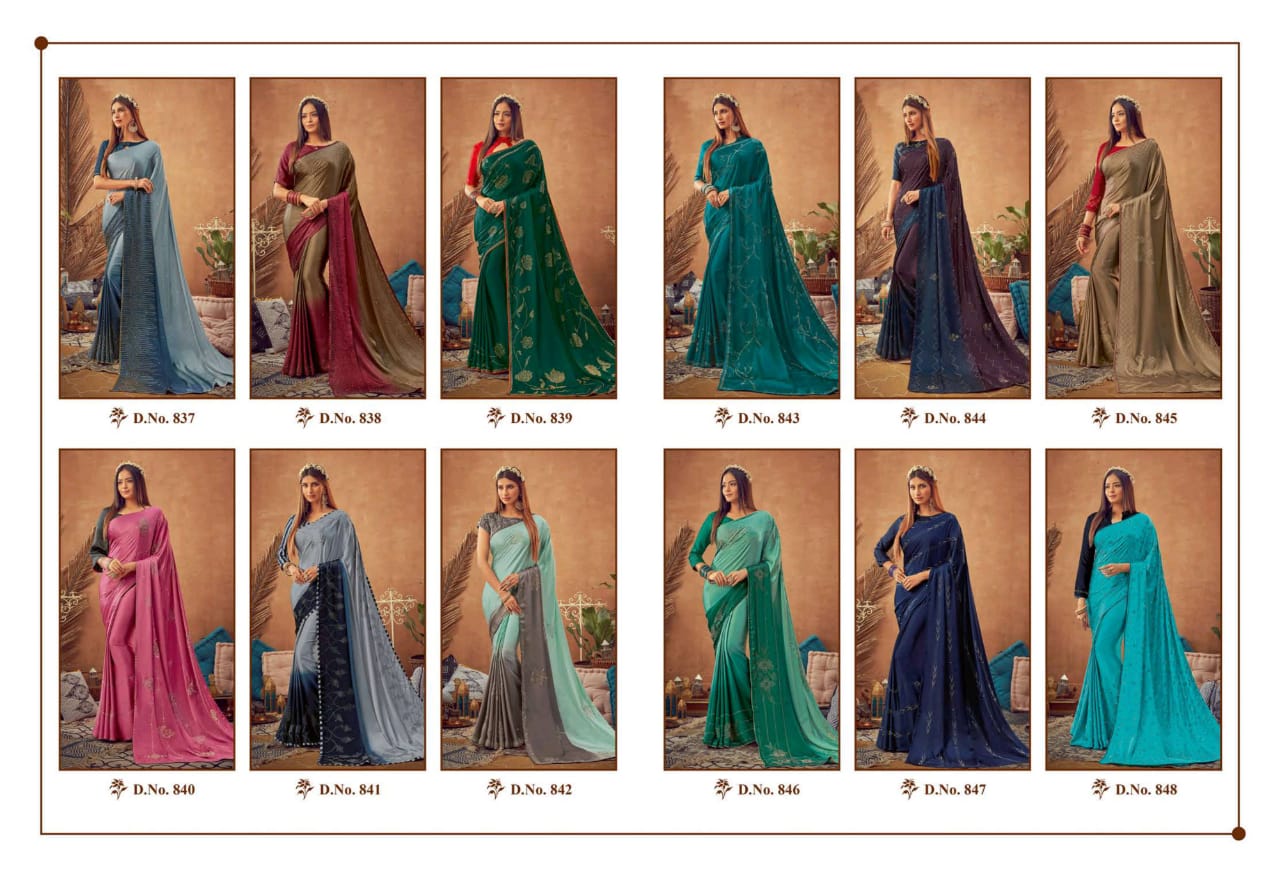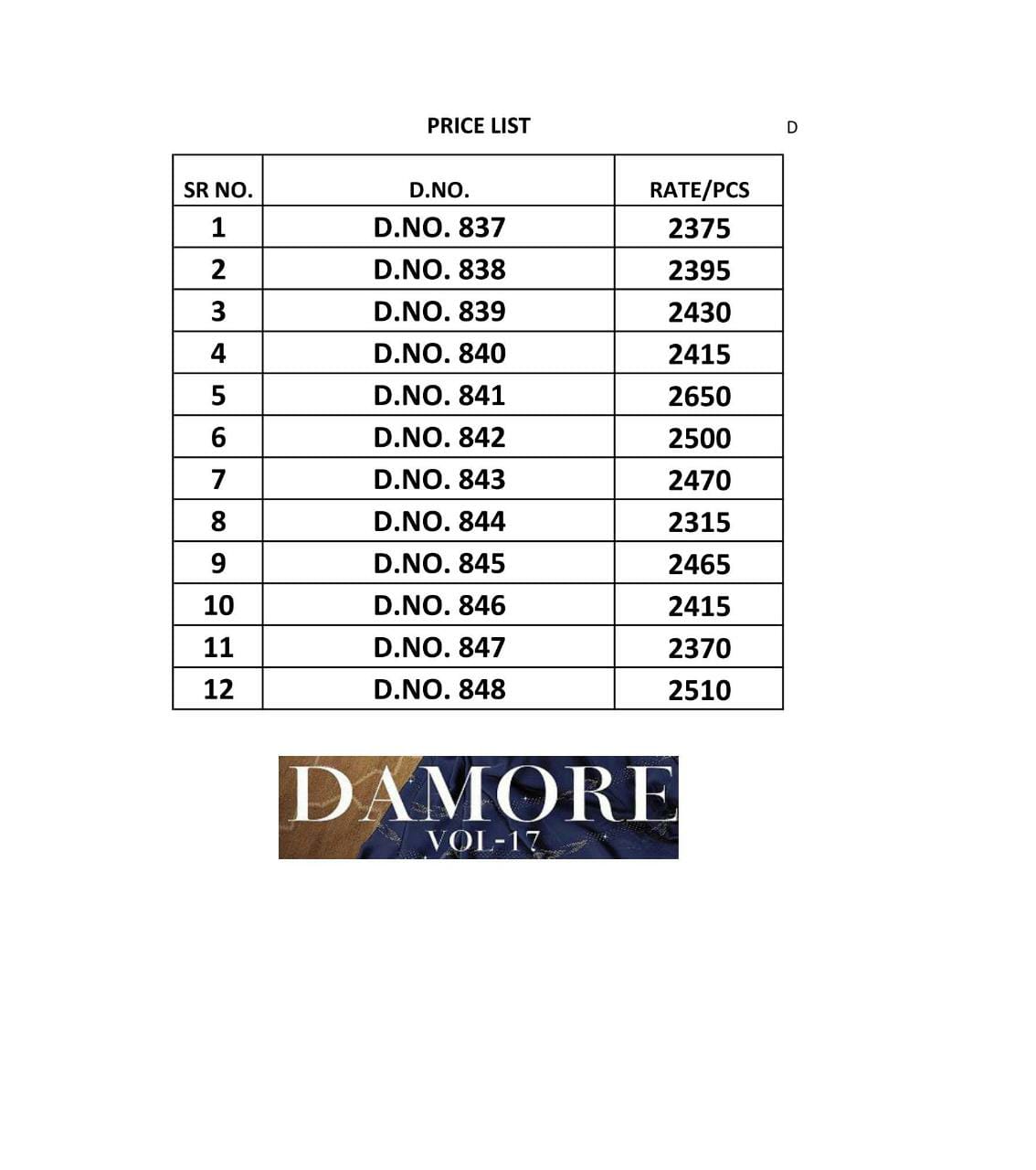 We are launching our new Saree Catalog Brand – Vishal Prints Catalog Name : DAMORE VOL 17 Series - 837-848 Fabrics – Fancy Cut - 6.30 mtr * Set to set * Rate 2443/- Pc – 12 GST 5 Percent Extra. Book your order now . |
