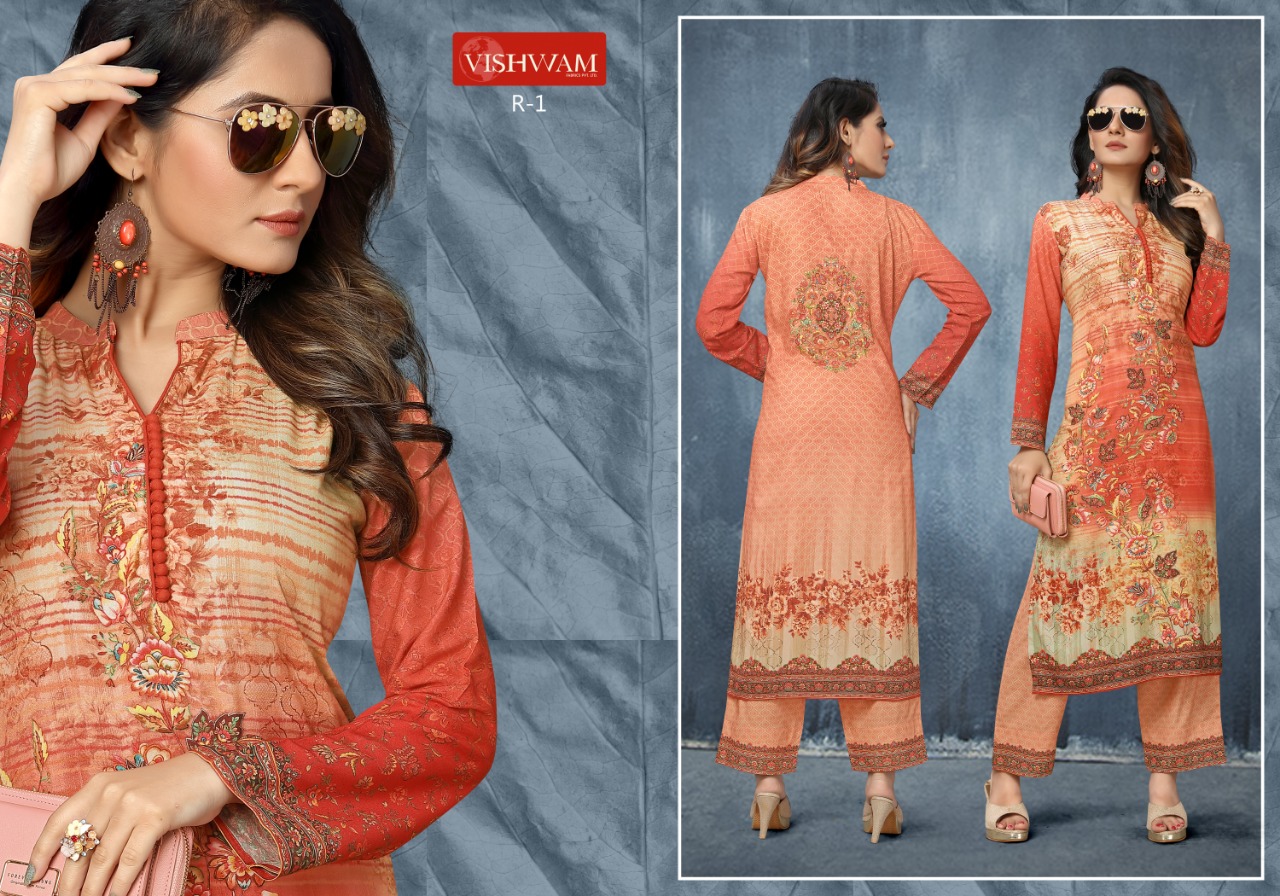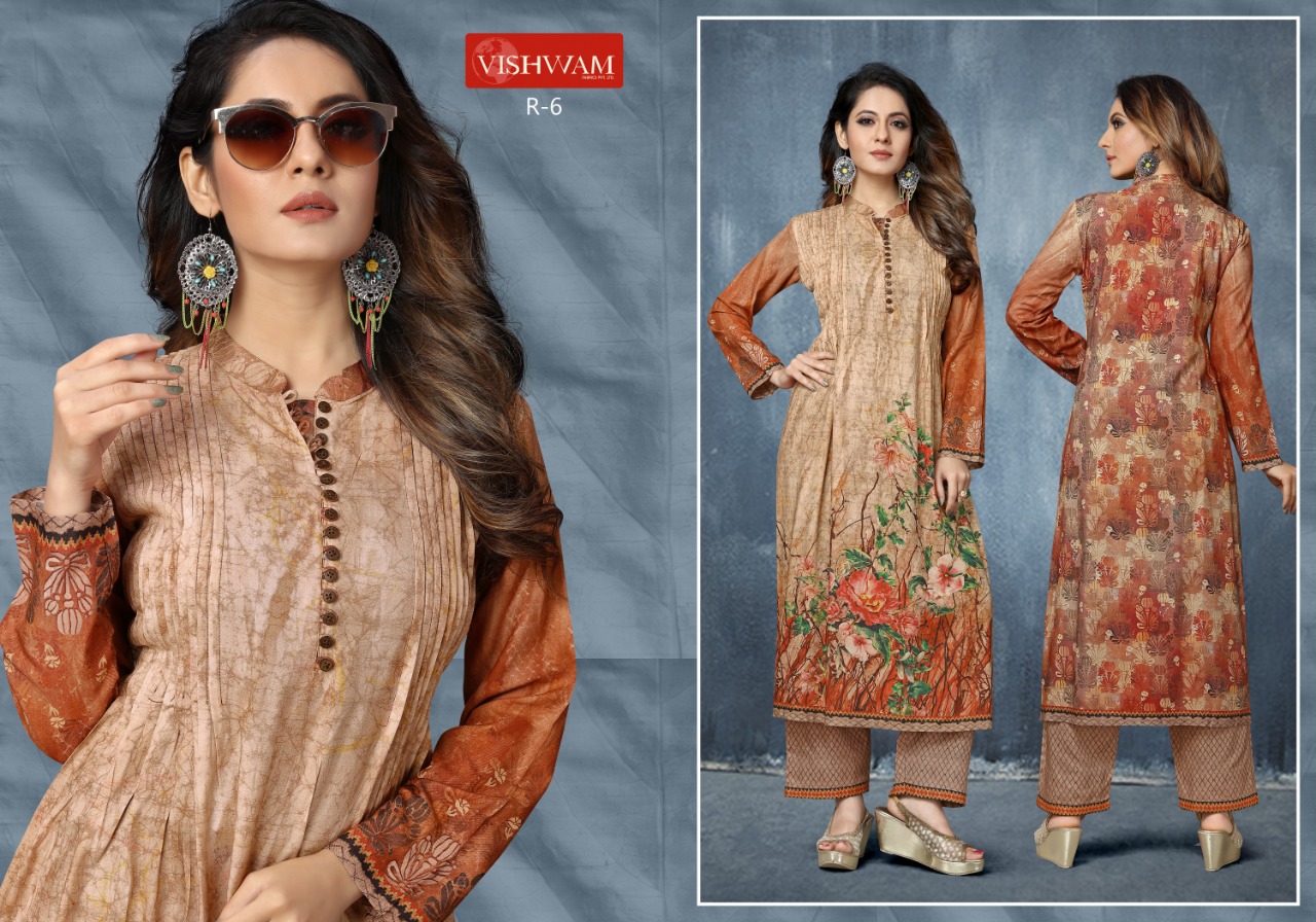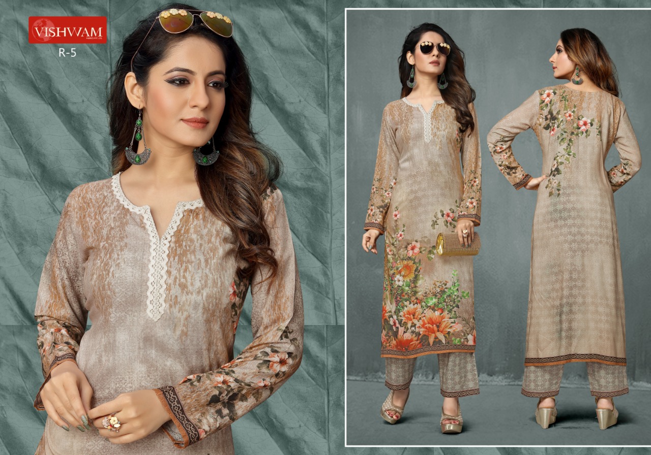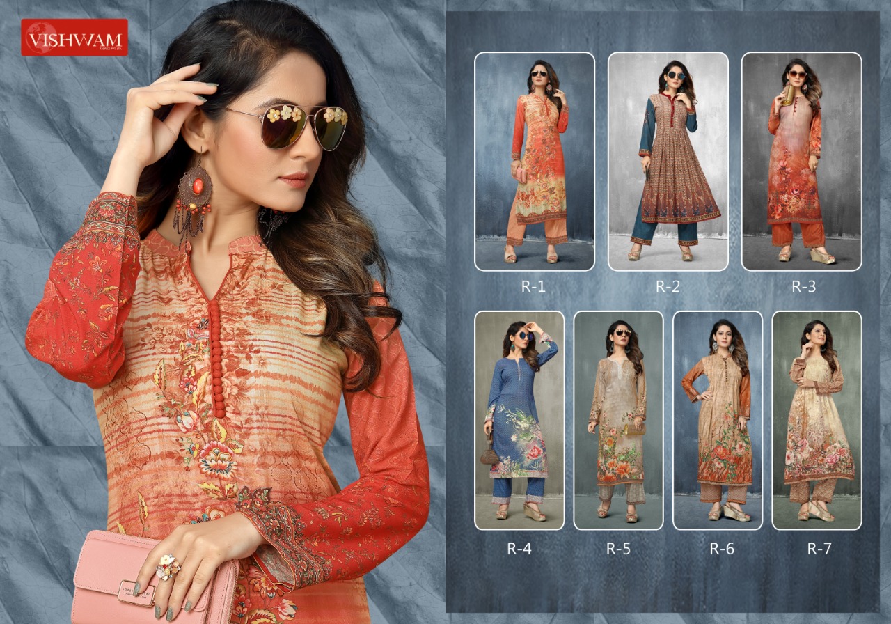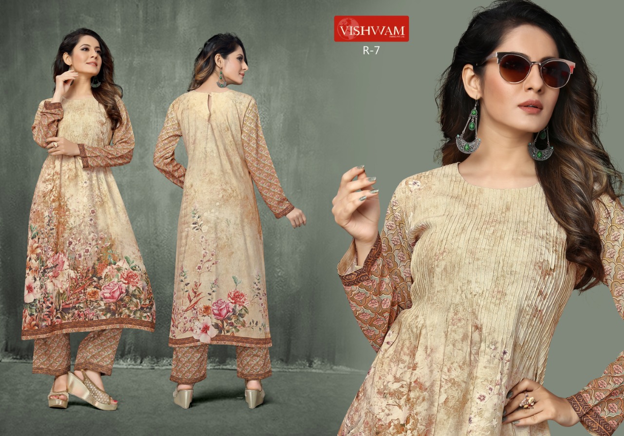 Vishwam fabrics pvt ltd RAYONS Top : 3 m viscose Rayon digital Bkttom:2.5 m vicose rayon digital Unstich material Rate 900/- Set of 7 pcs . Set To Set . GST 5 Percent Extra. Delivery 4-5 days |