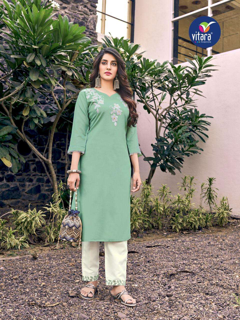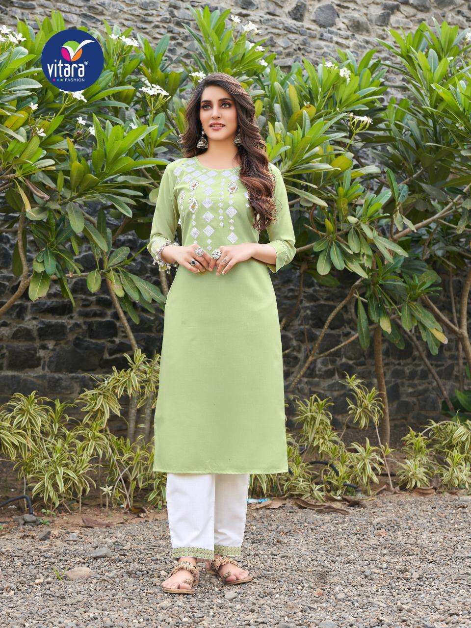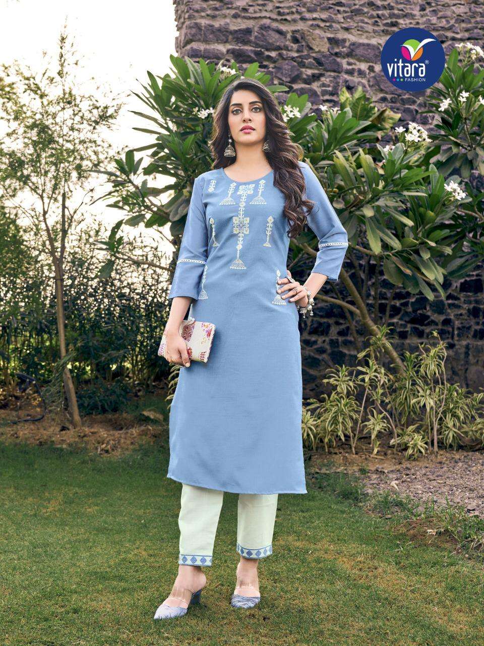 vitara fashion  launches exclusive designer  kurti with pent       Catalogue name-  ARDAS        Fabric- heavy magic slub with embroidery size-m(38),L(40),xl(42),xxl(44)   Length TOP - *46 * Designs- 4 Rate:- 699/- GST +5% ADD ON BILL AMT Set to set |
