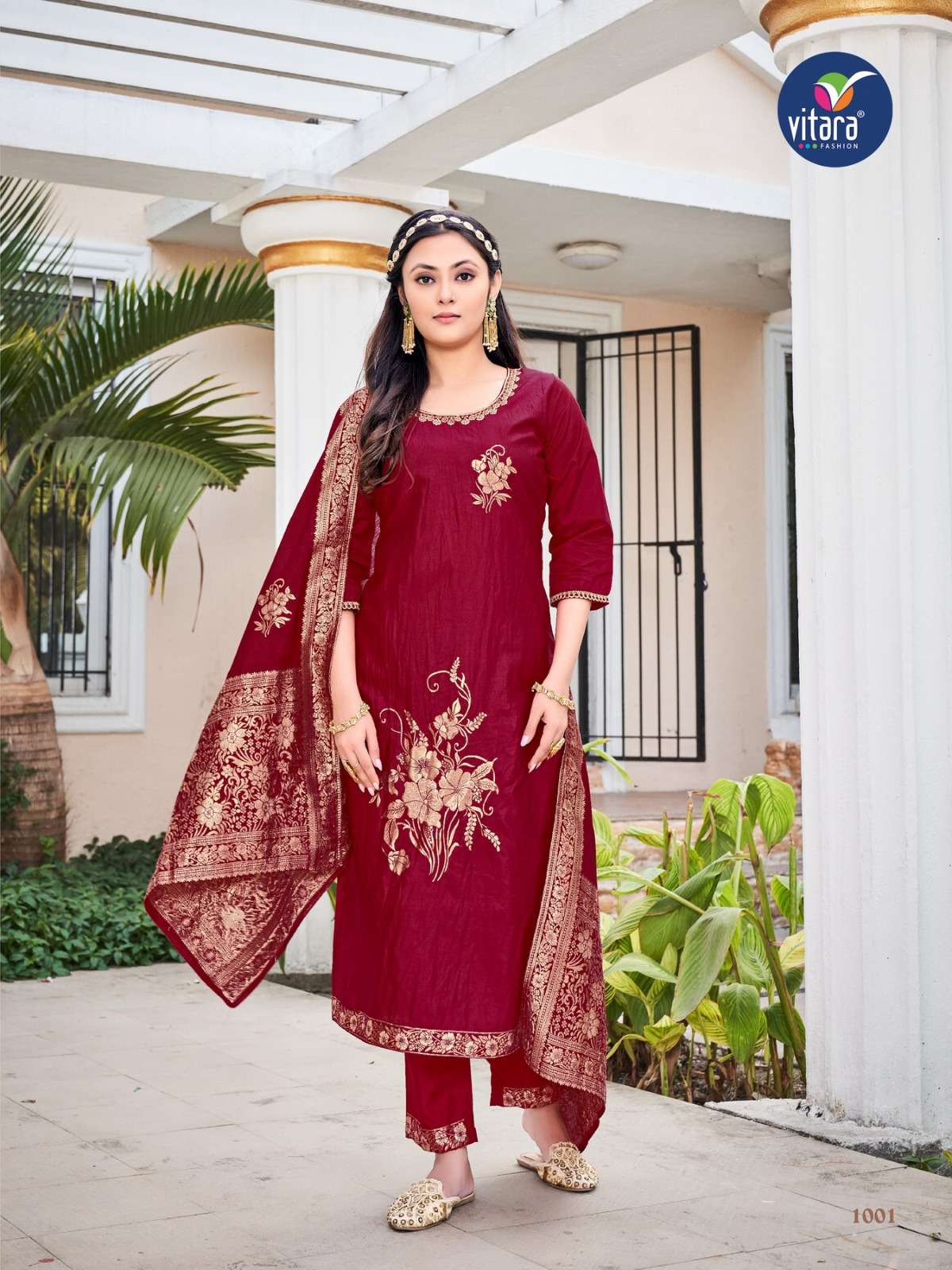 vitara fashion launches exclusive designer kurti pent with dupatta🎀 pent - *heavy nylone dolla * dupta -* nylon dola with weaving jcrd * size-m (38)L(40),xl(42),xxl(44)xxxl(46) ☣Designs- 4 🔴Rate:- 1299/- |