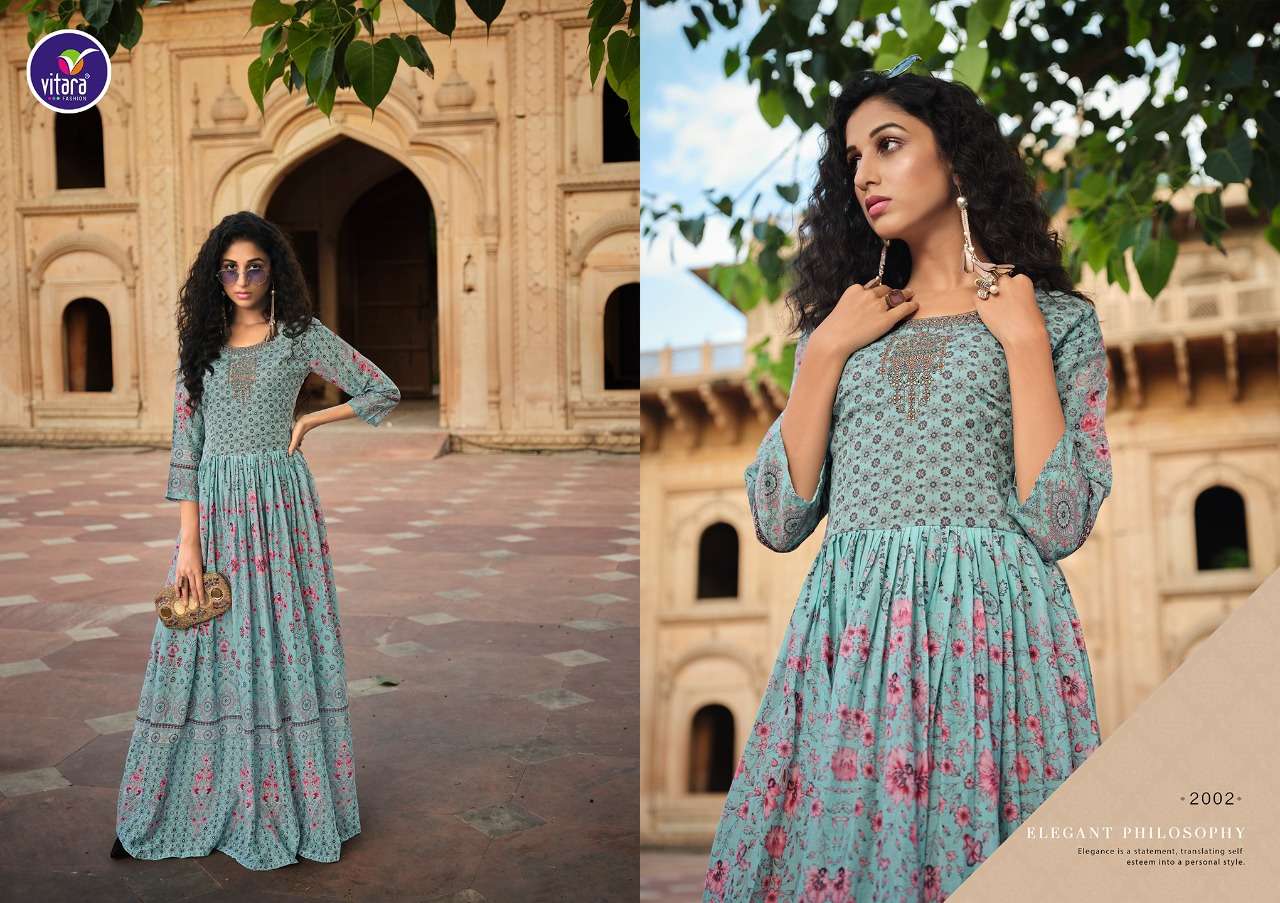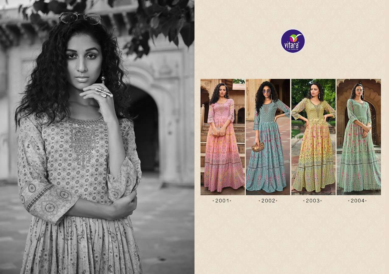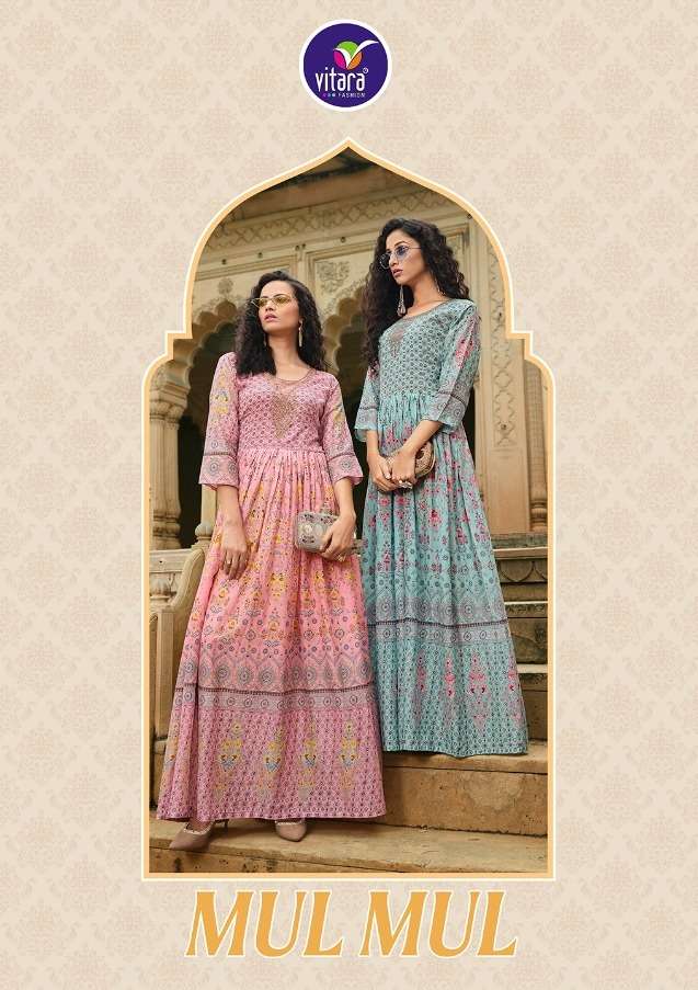 vitara fashion  launches exclusive designer long gown       Catalogue name- MULMUL        fabric -pure heavy lown mul prints with embroidery size-m(38),L(40),xl(42),xxl(44)   Length TOP - 56 Designs- 4 Rate:- 999/- GST +5% ADD ON BILL AMT |