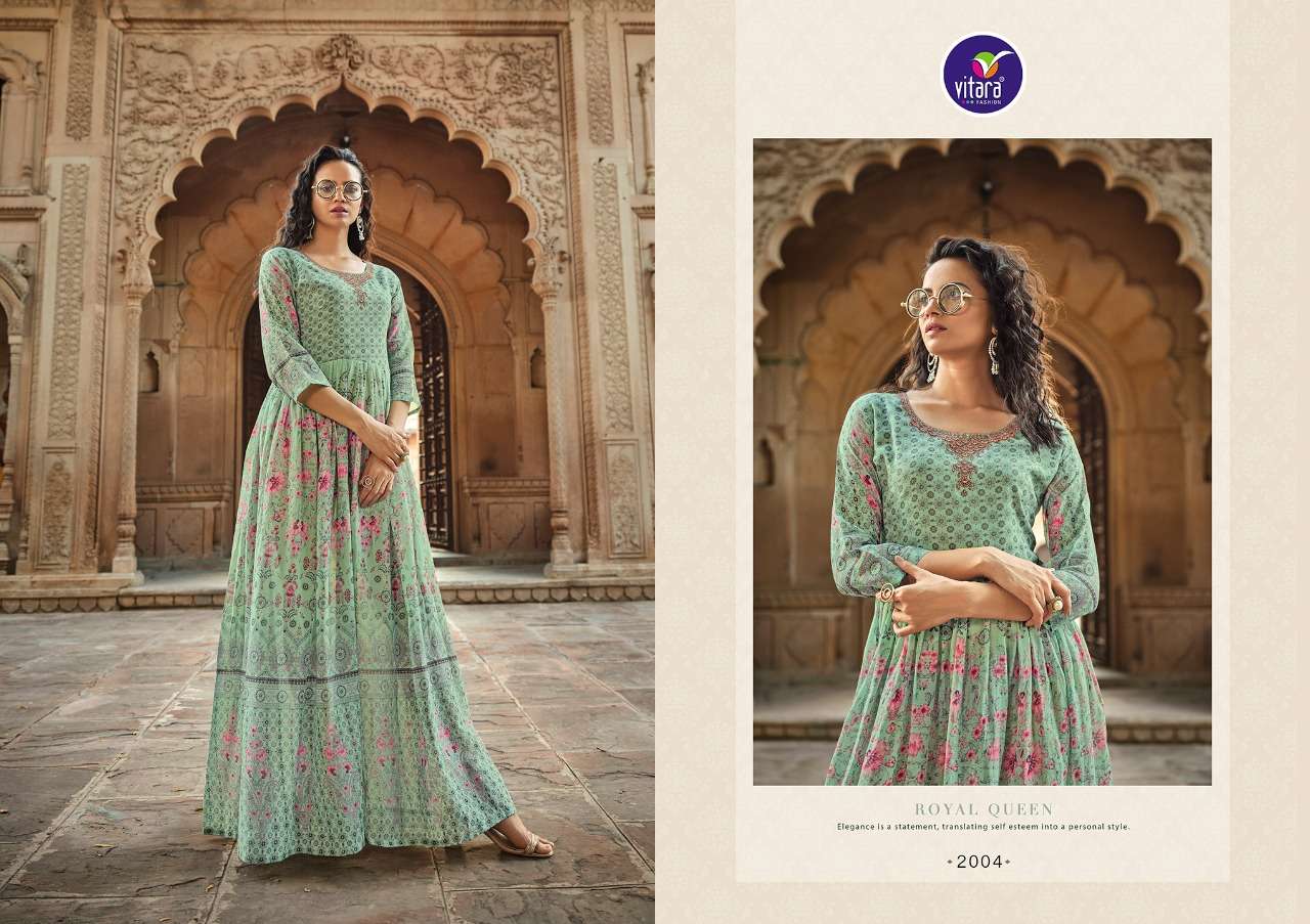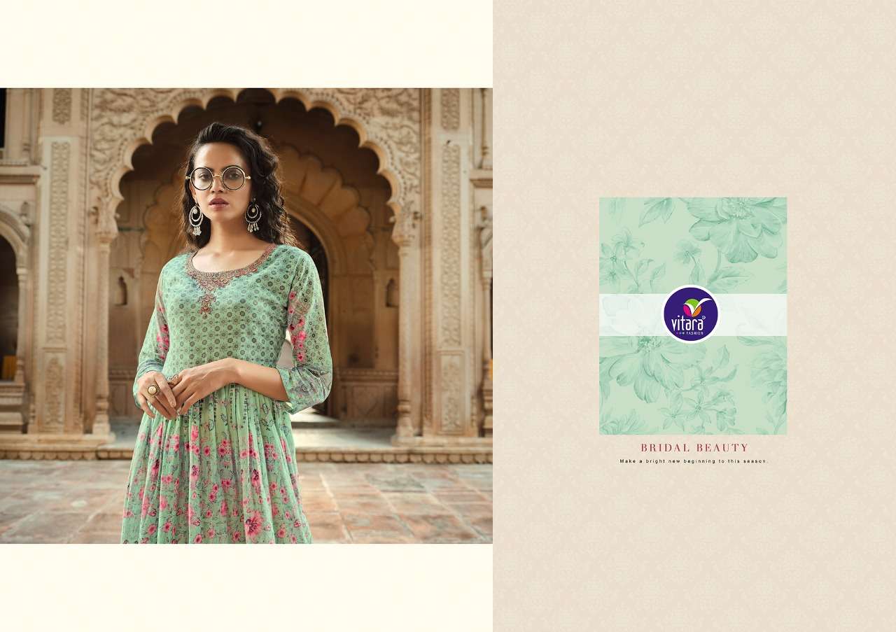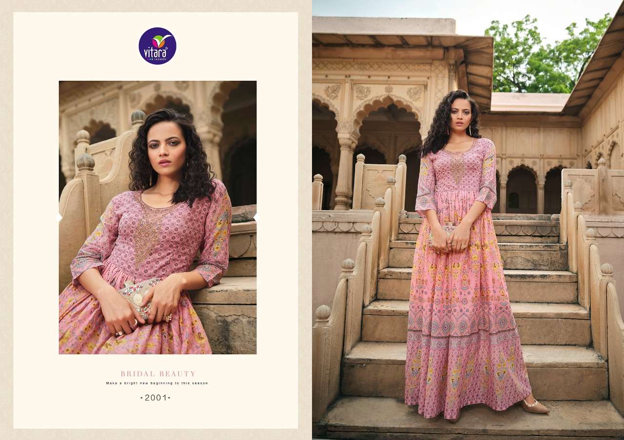 vitara fashion  launches exclusive designer long gown       Catalogue name- MULMUL        fabric -pure heavy lown mul prints with embroidery size-m(38),L(40),xl(42),xxl(44)   Length TOP - 56 Designs- 4 Rate:- 999/- GST +5% ADD ON BILL AMT |