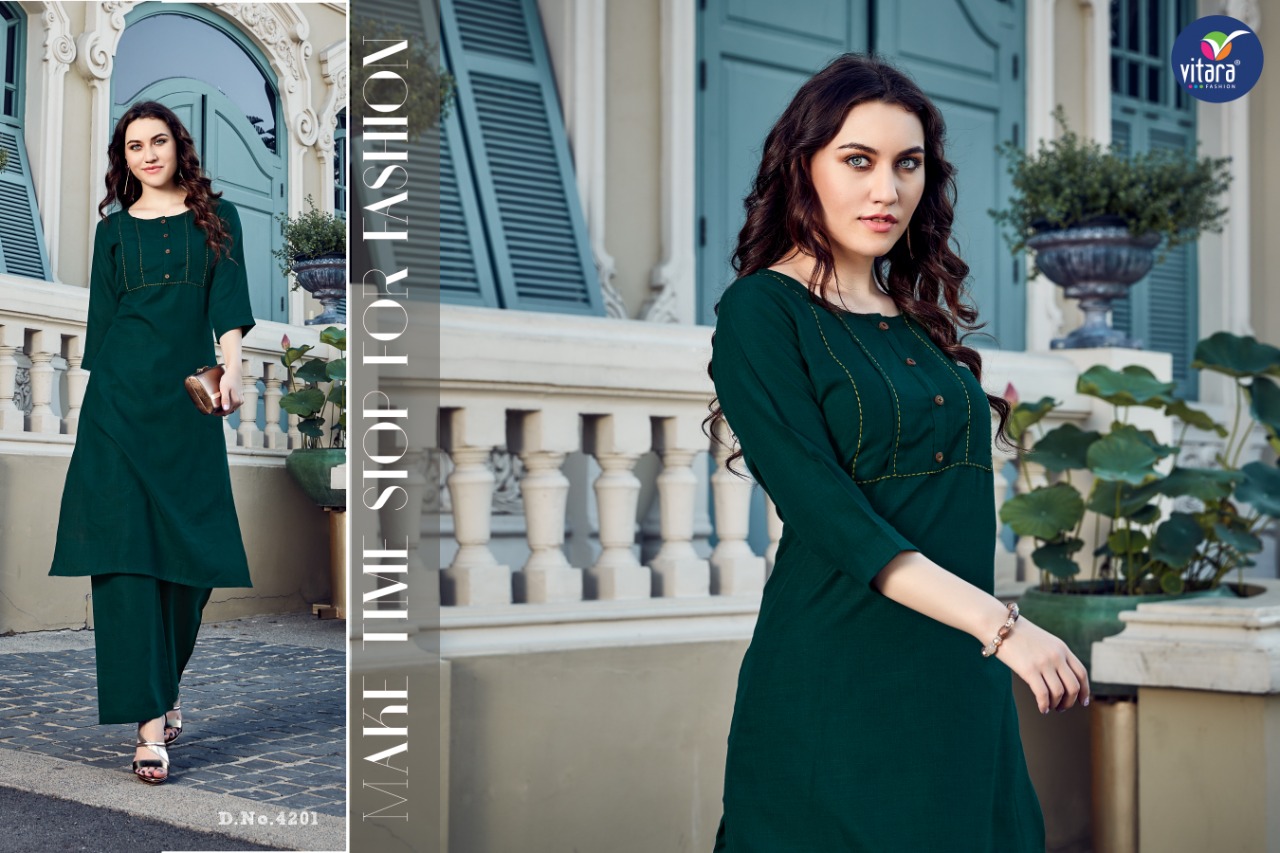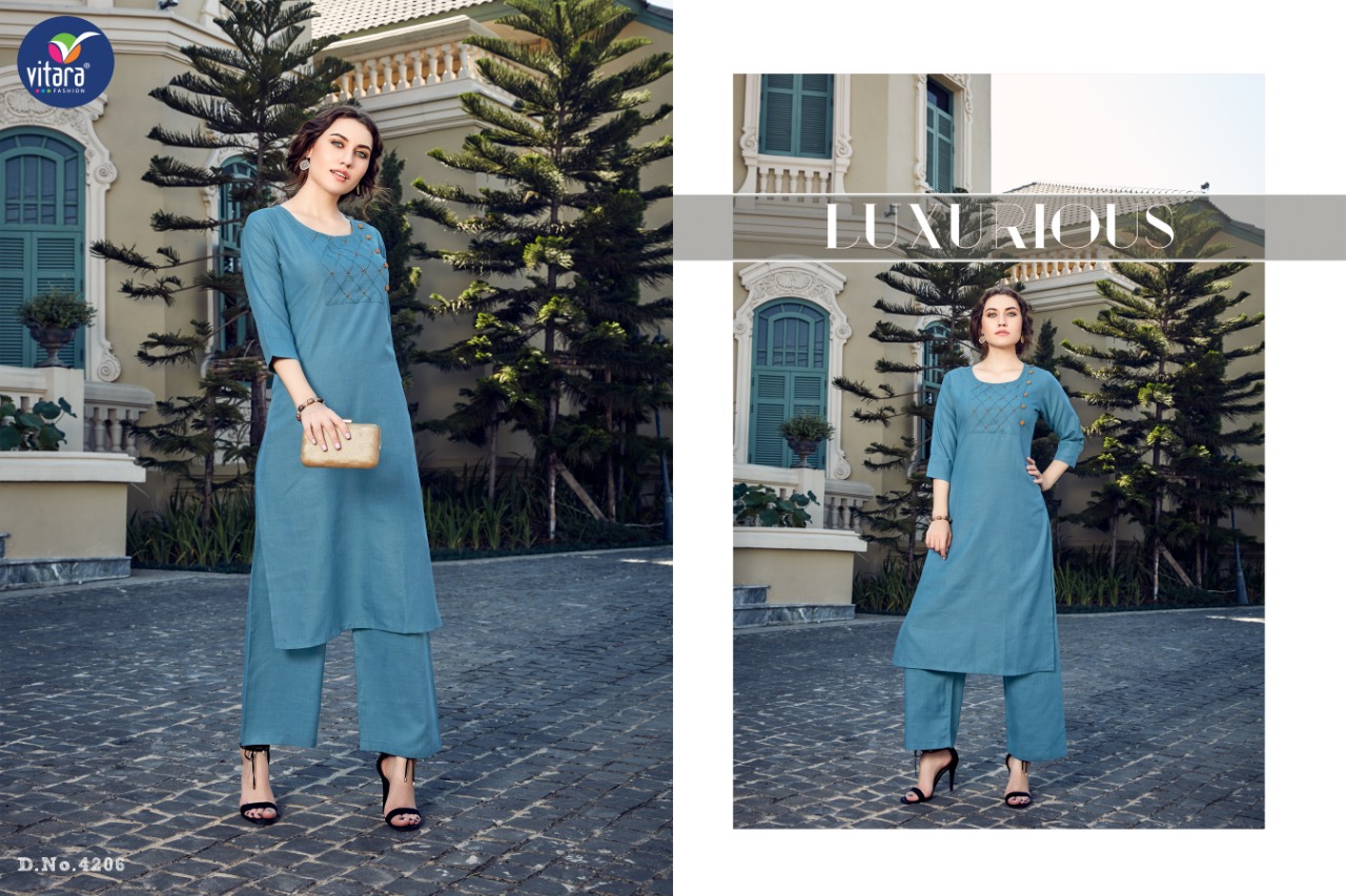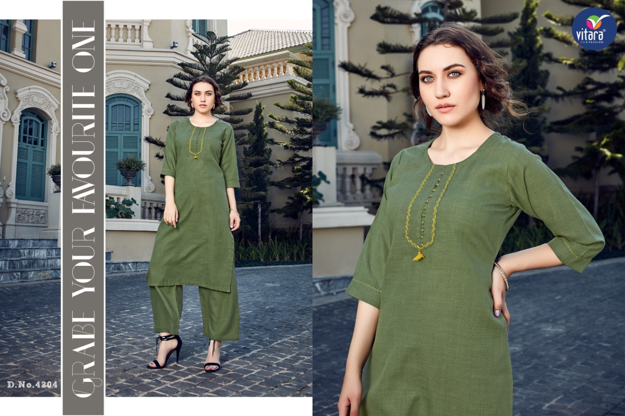 vitara fashion launches exclusive designer kurti with plazo Catalogue name- OLIVE Fabric- swis slub fabric Size - M -38 ,L-40,XL-42,xxl-44 ☣Designs- 7 Rate:- 595/- Set to set : Delivery from today GST +5% ADD ON BILL AMT |
