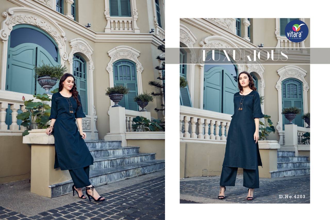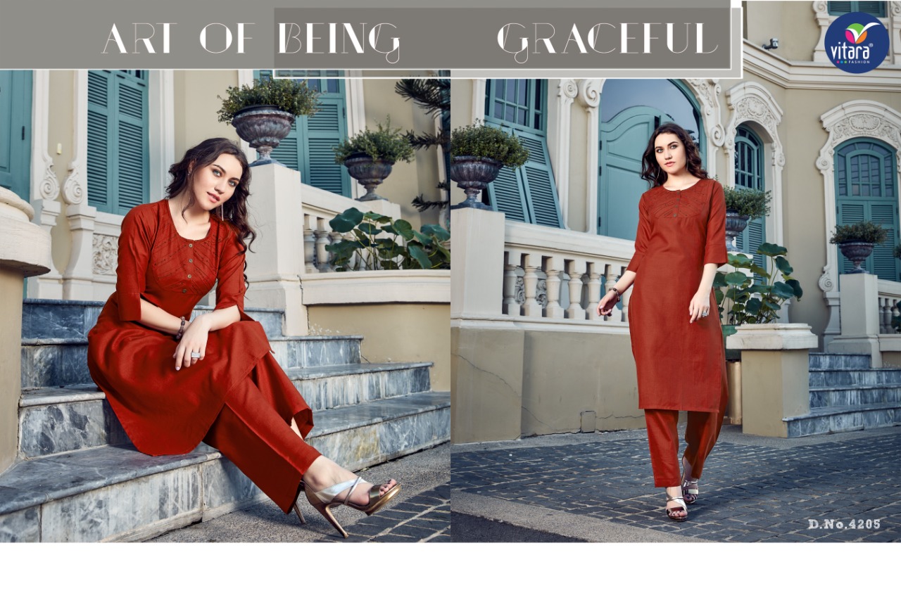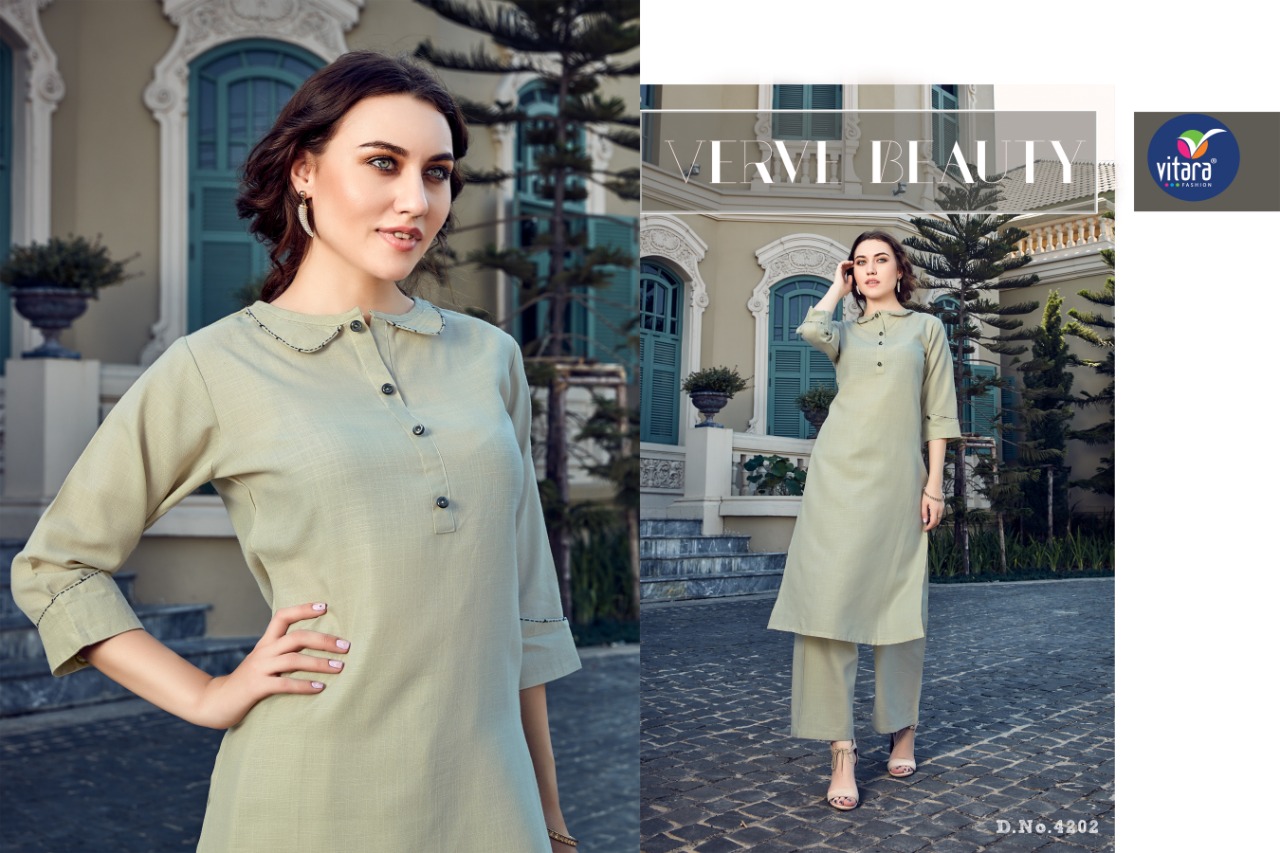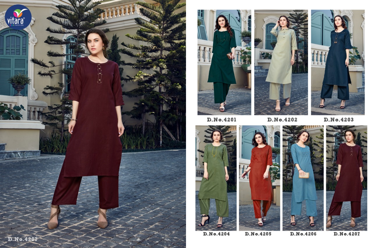 vitara fashion launches exclusive designer kurti with plazo Catalogue name- OLIVE Fabric- swis slub fabric Size - M -38 ,L-40,XL-42,xxl-44 ☣Designs- 7 Rate:- 595/- Set to set : Delivery from today GST +5% ADD ON BILL AMT |