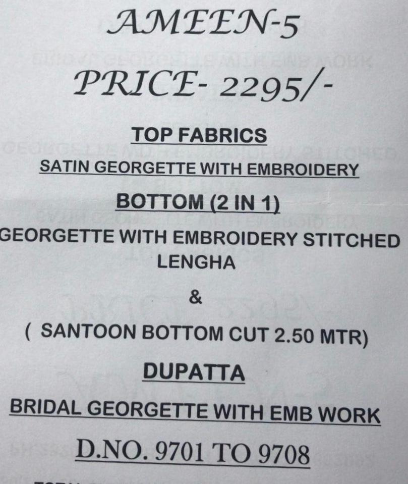 Brand - Vivek Fashion . Catlog name - Ameen -5. Set To Set . GST 5 Percent Extra. Delivery from tomorrow |