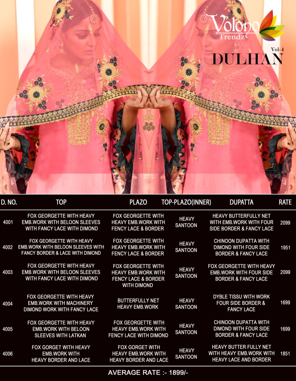 karvachoth spical Volono trendz Presents our new Catlog Dullhan vol.4 Full stich new Concept Hit collection hit designe *fox georgette with heavy emb.work with heavy border&lace with dimond Name - Dullhan vol.4 Bridal collection Fabric details - Top - fox Georgette with Heavy emb. work with balloon sleeves with Dimond with heavy border&lace ◾Top/sarara ( With Inner)heavt santoon Sarara : fox gorget with heavy emb.work with heavy border&lace Duppta:- chinon and butterfully net with heavy emb.work heavy border and lace Size:-L,xl,xxl,xxxl Pcs:6 Pieces Rate - *1899 Per Pcs * Set To Set . GST 5 Percent Extra Looking for positive response Regrads:- Volono trendz |