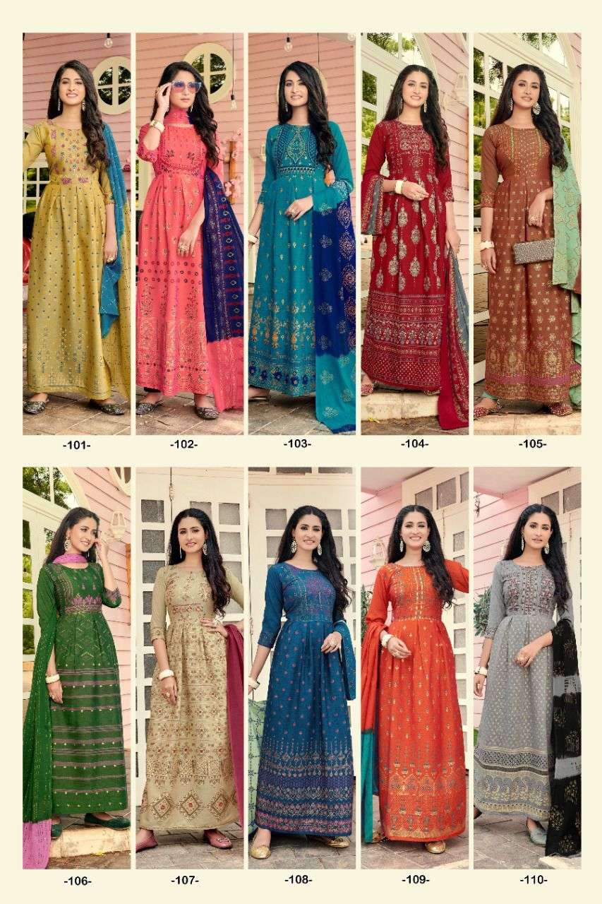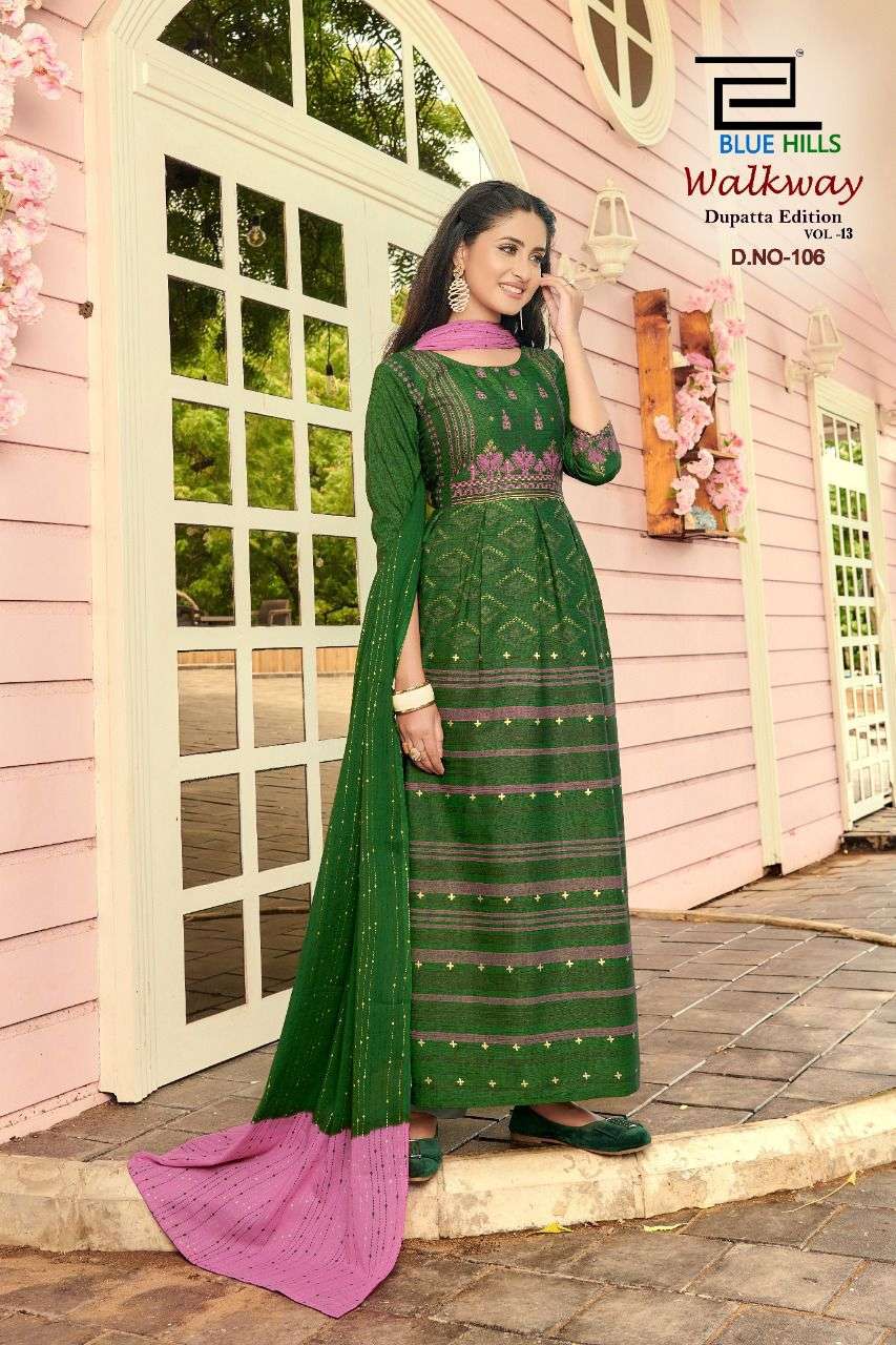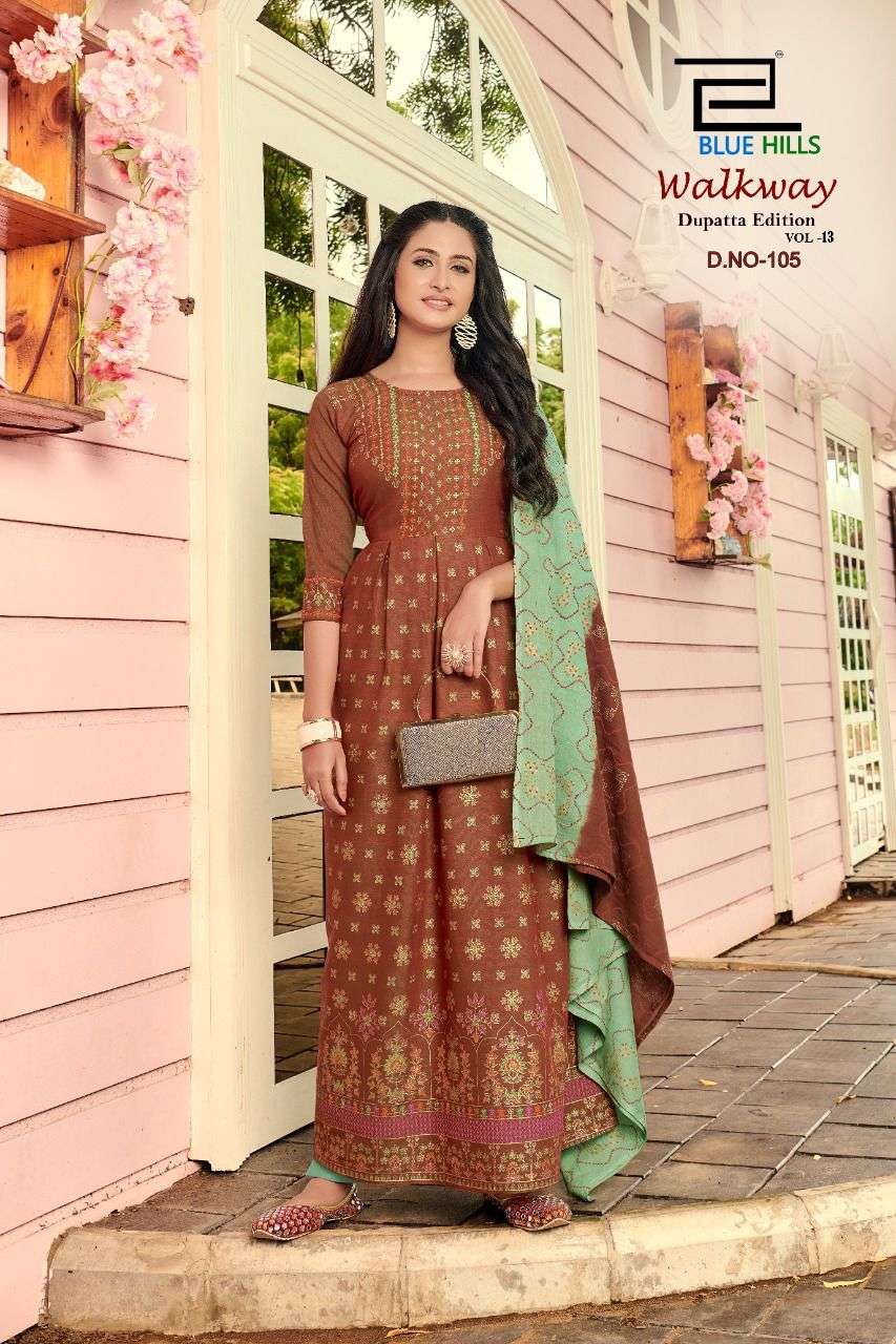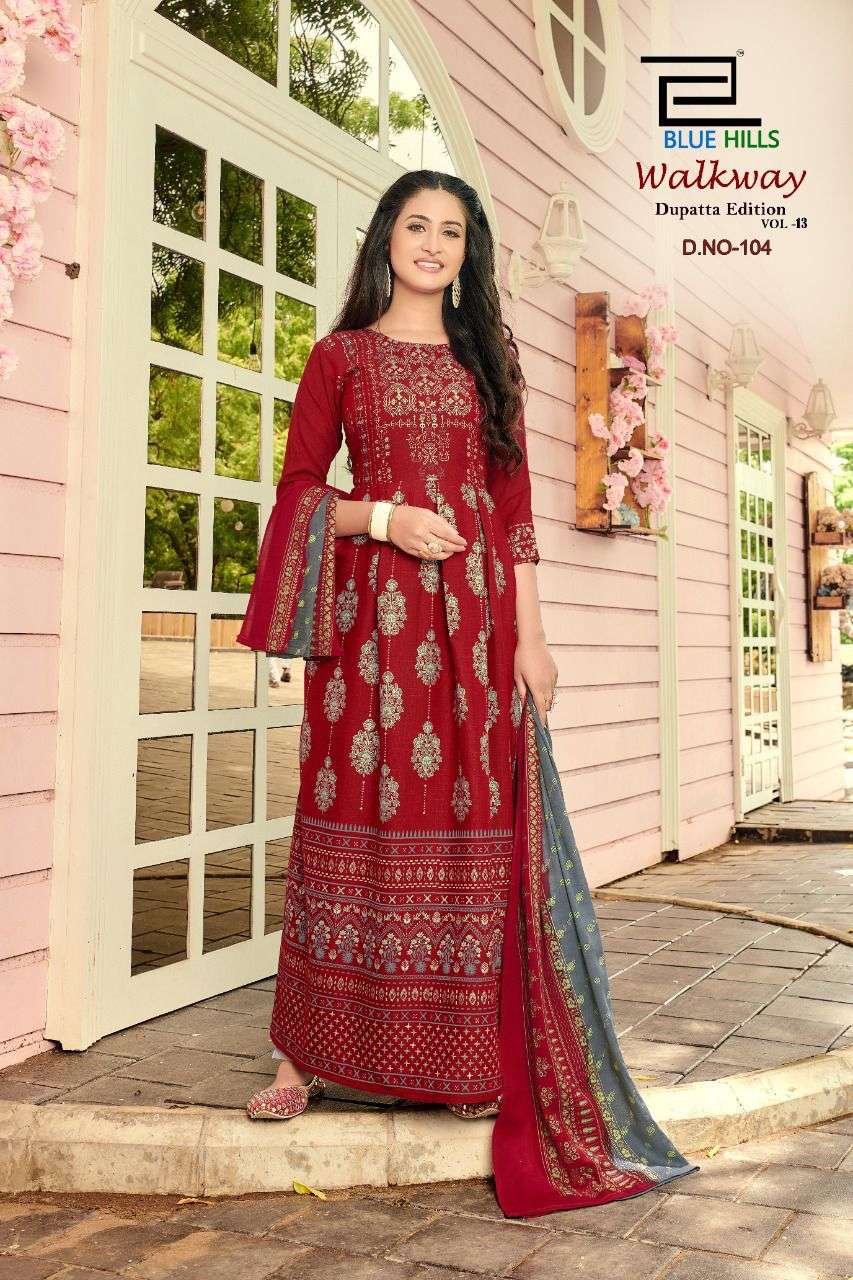 #BLUE HILLS Presents WALKWAY  VOL 13              (Dupatta edition) Top Fabric : RAYON two tone Classic print with foil Dupatta : Cotton mal print        (Full size) Size:- *M (38 )L(40) XL( 42" ) XXL( 44" ) 3XL( 46" ) 4XL(48") 5XL(50") Rate - 665+GST Set to set Lenght 52+ 10 piece catalogue Dispatch-: 2 to 3 days |