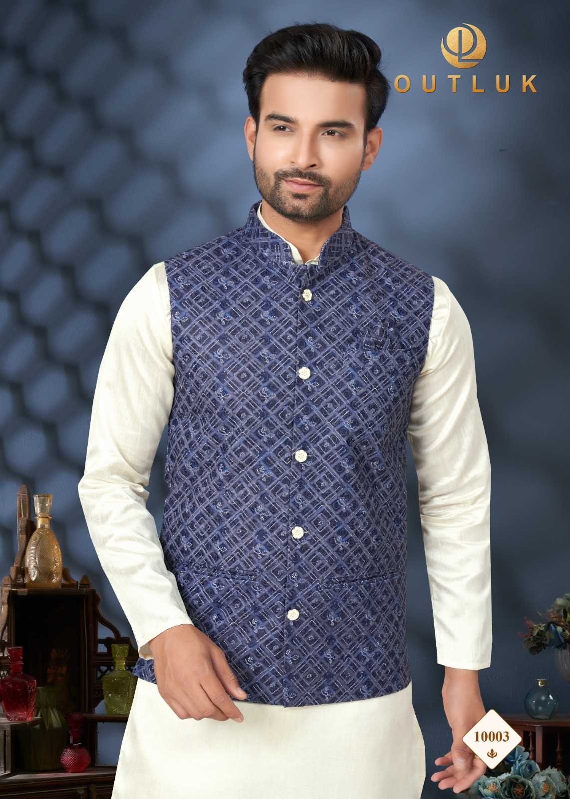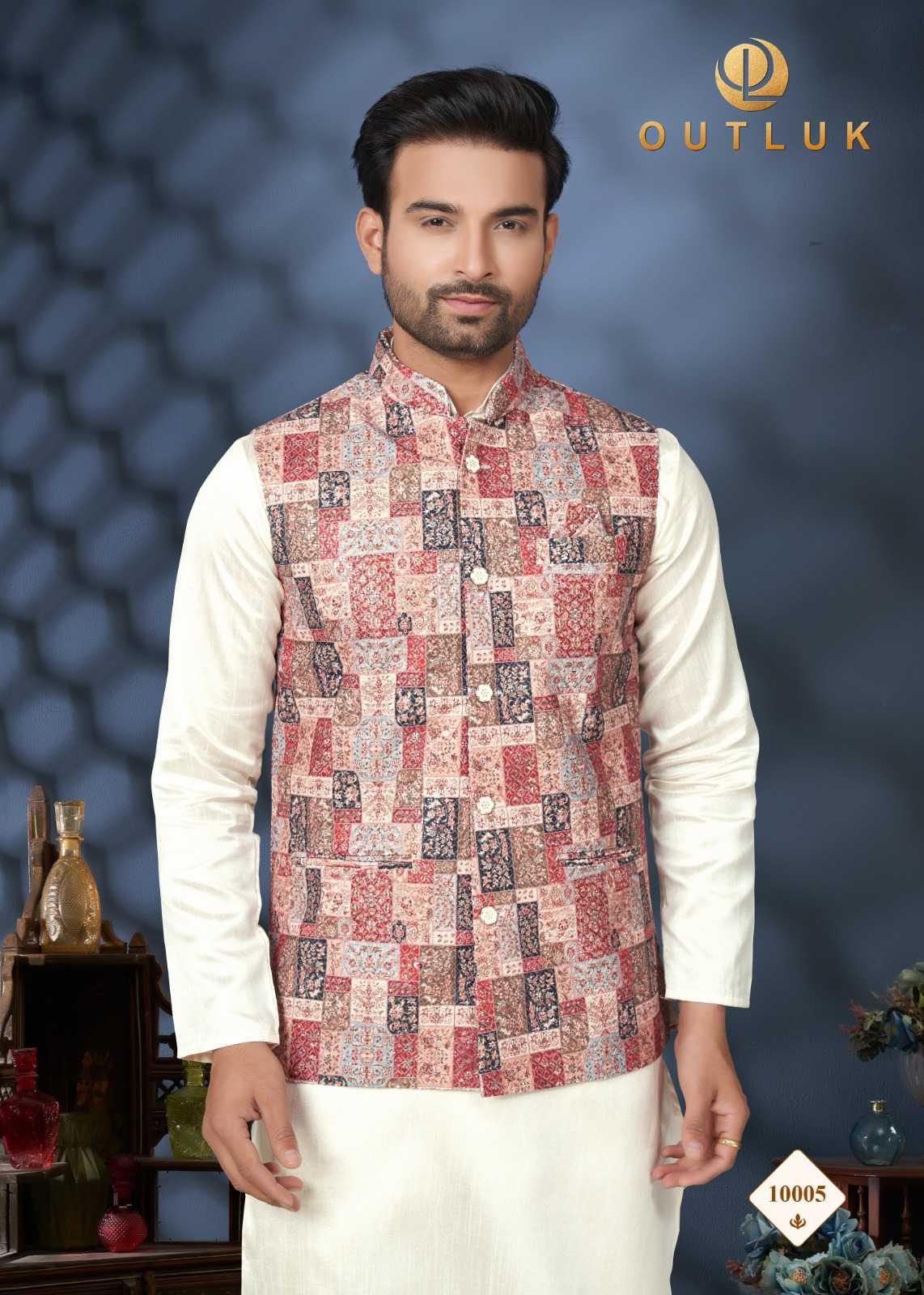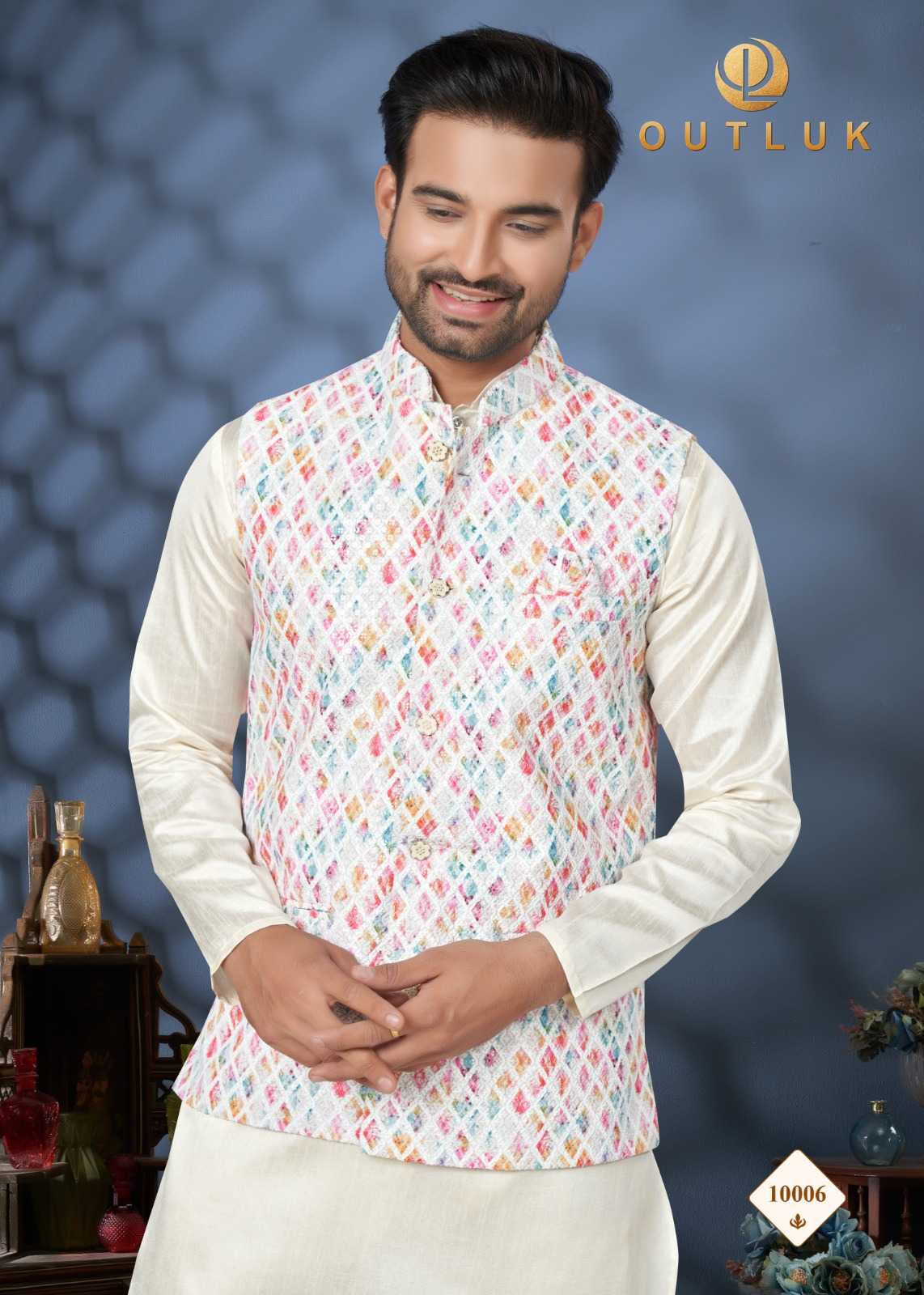 Outluk Added Wedding Collection Series New Designs in Modi Jacket Kurta Pajama Catalog Name: Outluk Wedding Collection Vol 10 🔸 Fabric Details 🔸 ▪Koti Fabric : Heavy Cotton digital Print with Heavy Lakhnowi and Sequnce Work ▪Kurta Fabric :- Silk Mastani ▪Pajama Fabric :- Silk Mastani ▪Total Design:- 6 pcs ▪Size:- 38,40,42,44 GST EXTRA Set Available Delivery : 2-3 Days |