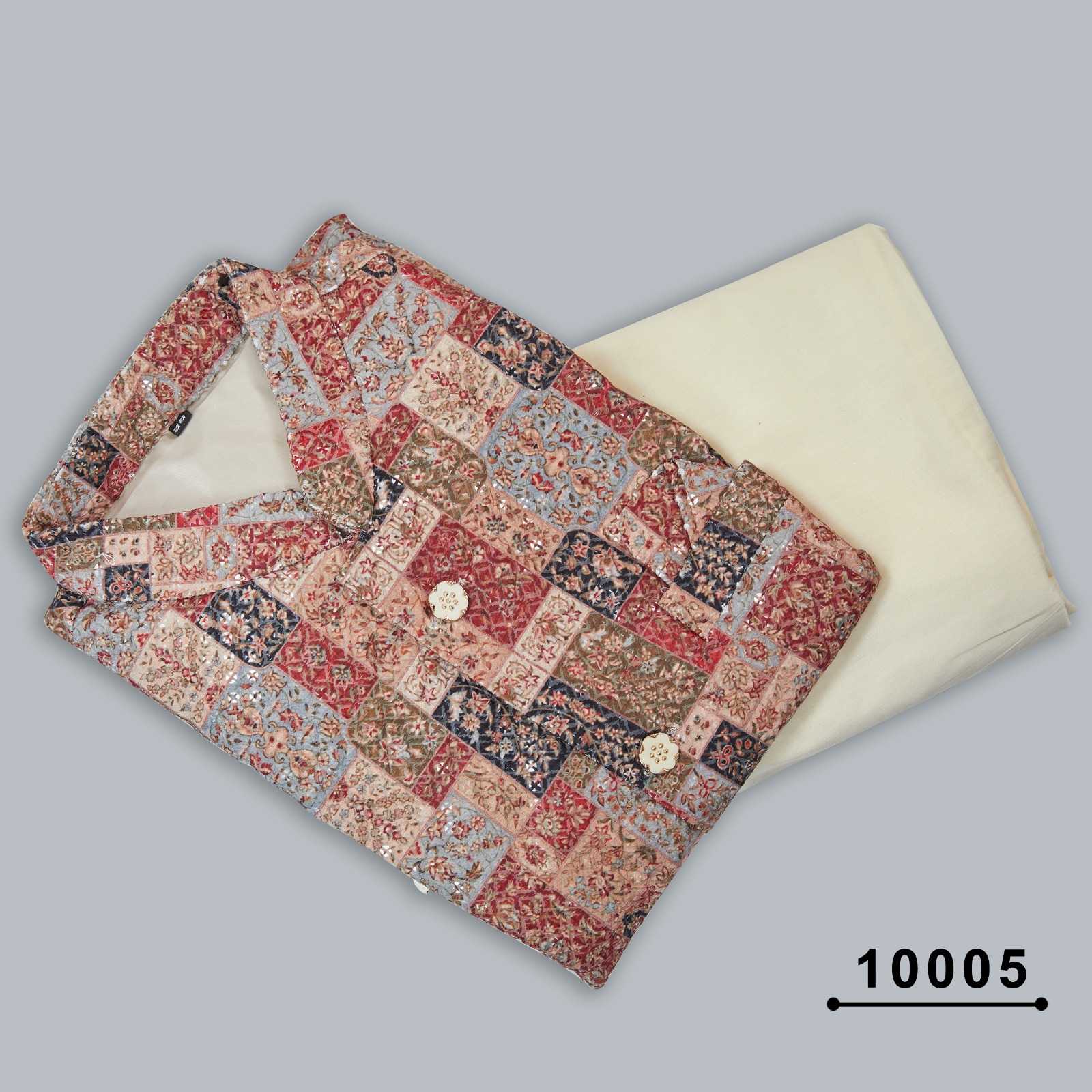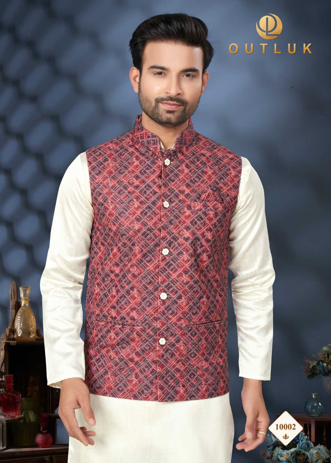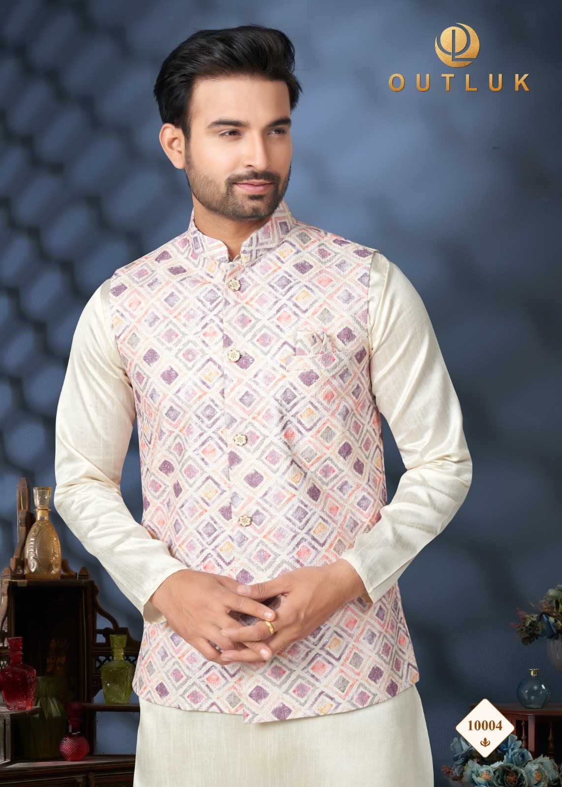 Outluk Added Wedding Collection Series New Designs in Modi Jacket Kurta Pajama Catalog Name: Outluk Wedding Collection Vol 10 🔸 Fabric Details 🔸 ▪Koti Fabric : Heavy Cotton digital Print with Heavy Lakhnowi and Sequnce Work ▪Kurta Fabric :- Silk Mastani ▪Pajama Fabric :- Silk Mastani ▪Total Design:- 6 pcs ▪Size:- 38,40,42,44 GST EXTRA Set Available Delivery : 2-3 Days |