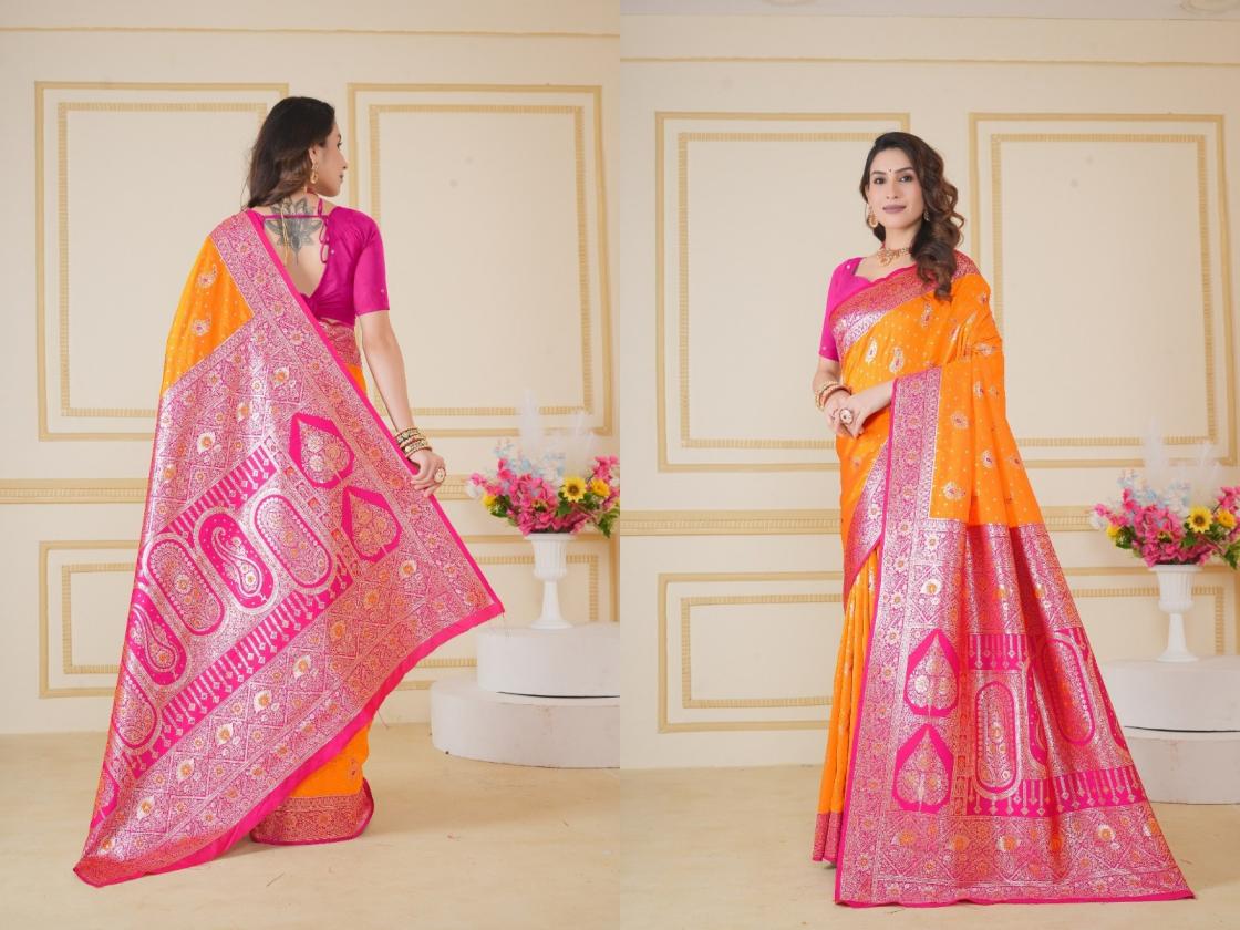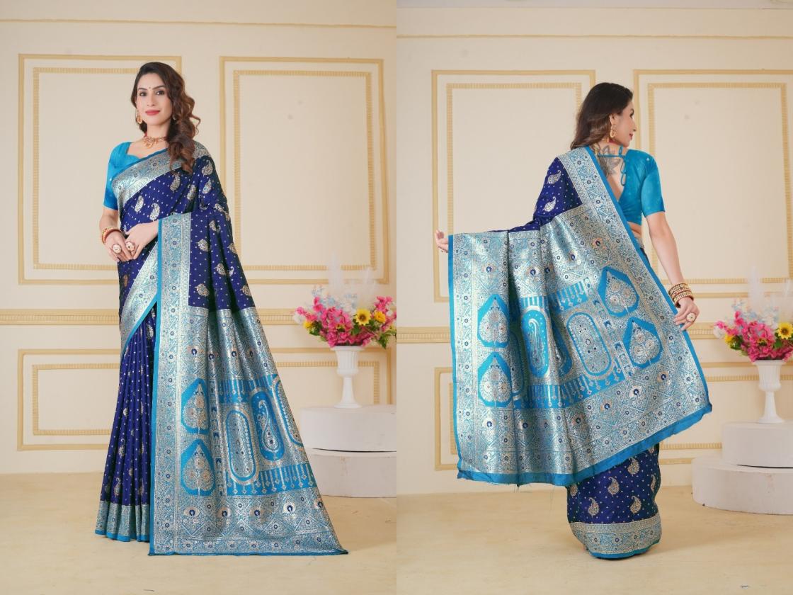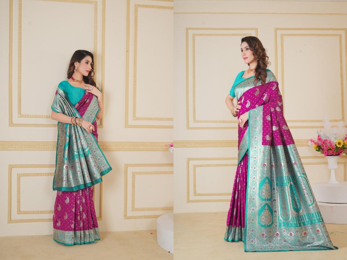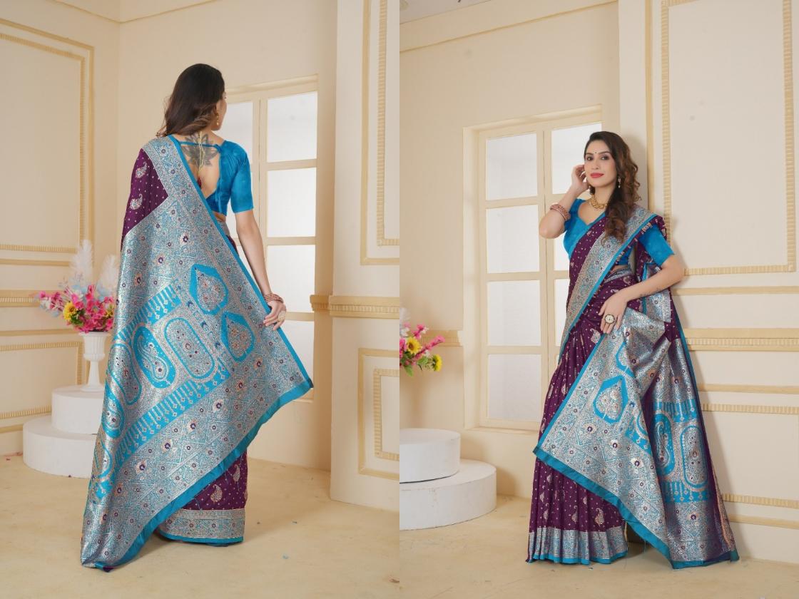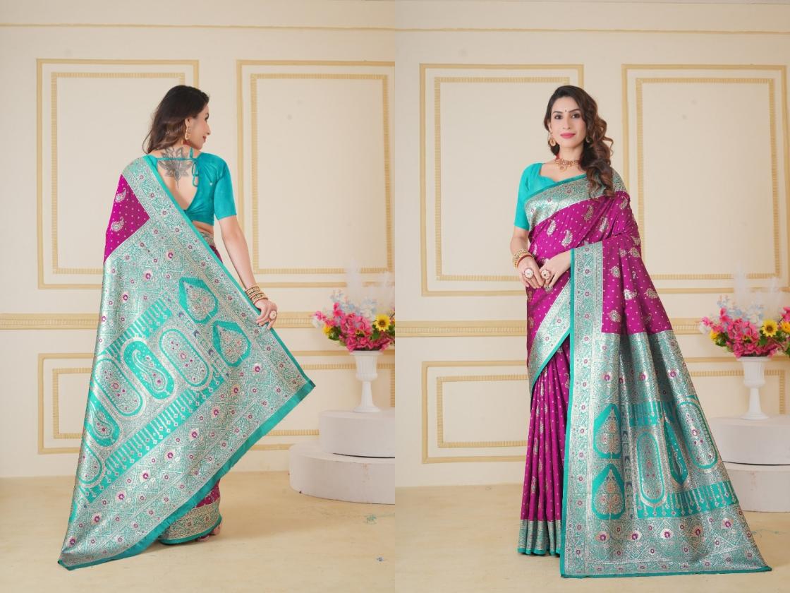 Catalog: Yeola Paithani-9770(Colours) Saree Fabric Detail : Soft Silk Weaving Saree With Banarasi Zari With Contarast Border Blouse : Contrast Jacquard Rate : 995/- +5 %Gst Style : Festive Wear, Wedding Wear |