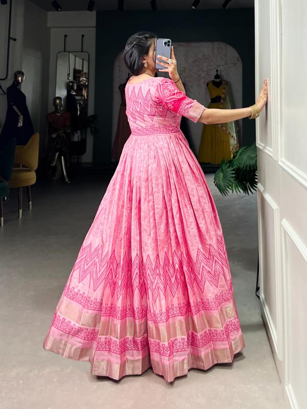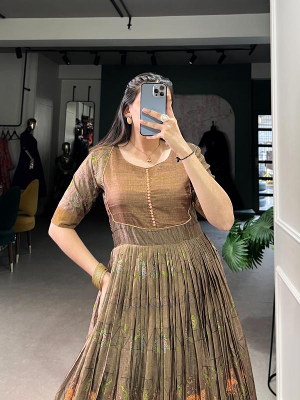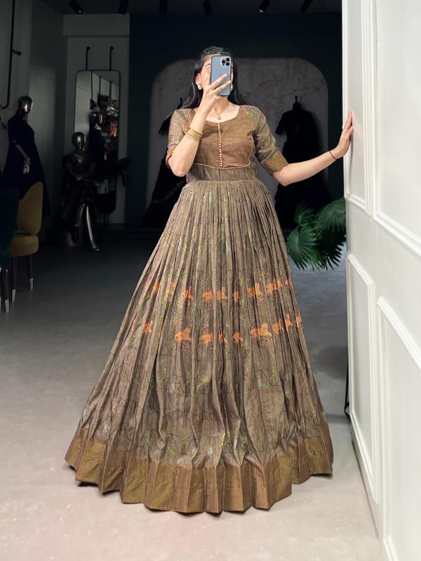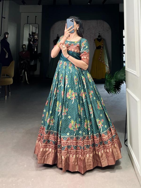 ynf5036 dola silk printed full stitch zari weaving work long kurtis