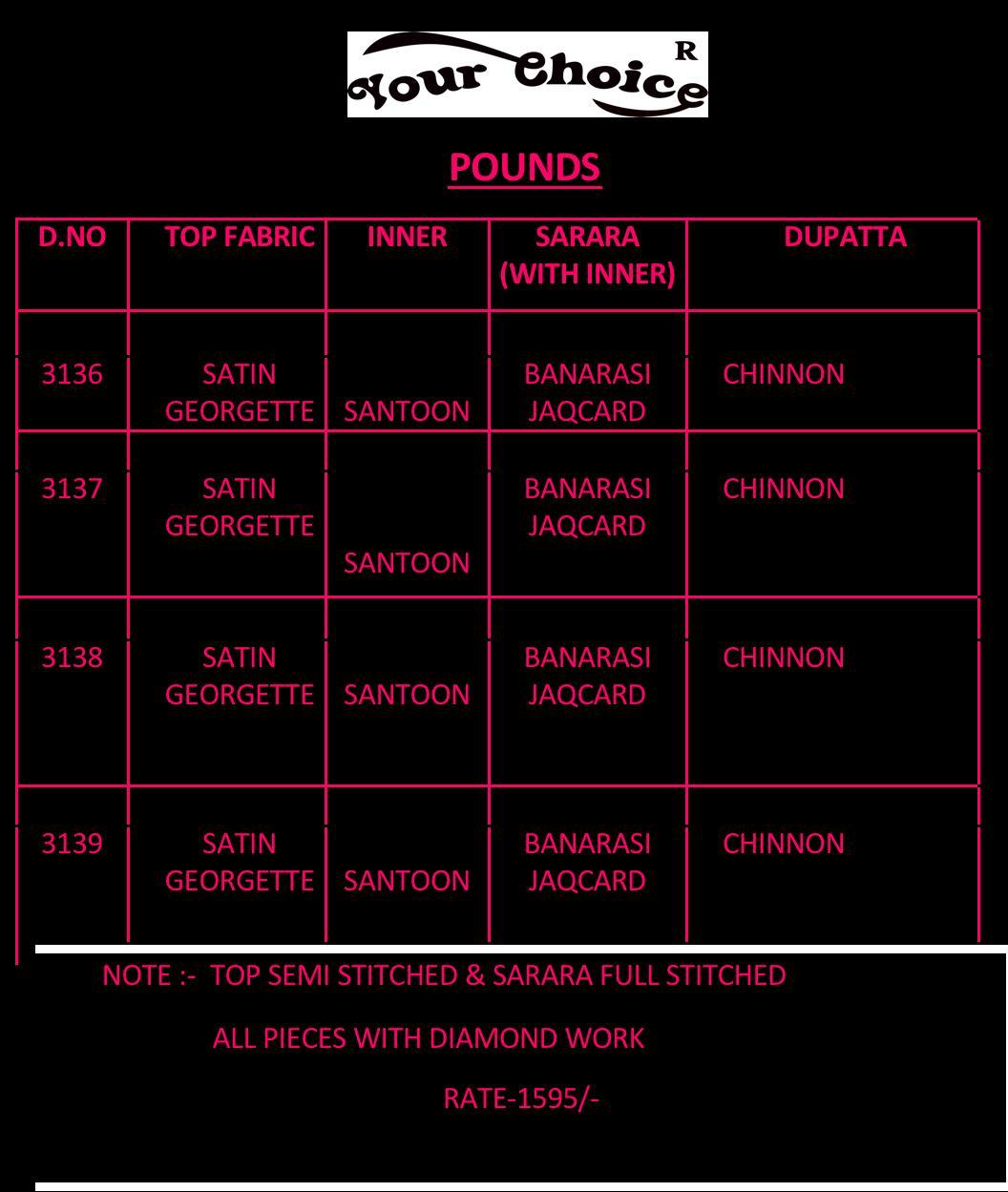 -------Your choice®------------ Presenting Ramzan special collection uniq Colours and pettern Catlog--------Pounds Fabrics-----Satin georgette Banarsi jkd sarara Stich soft cott |