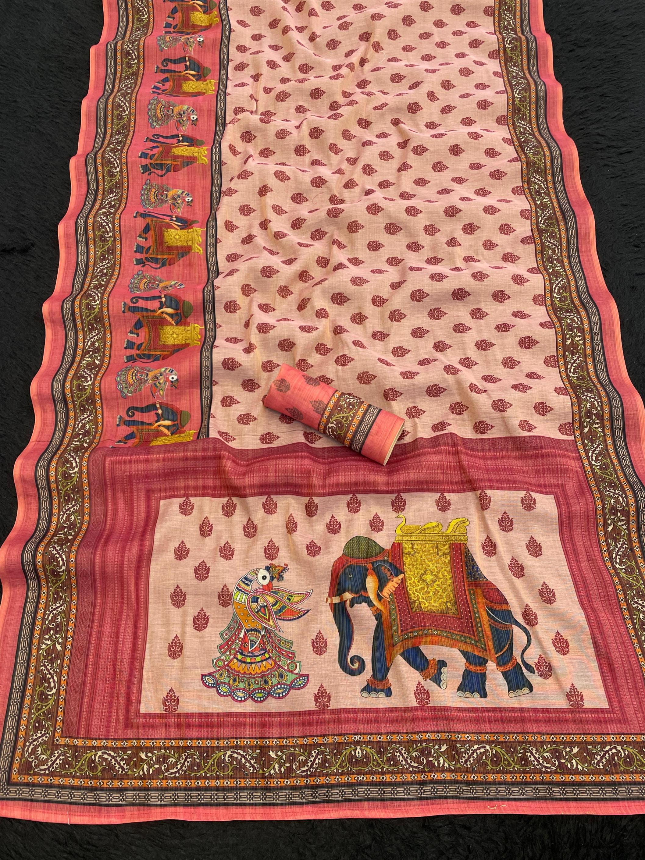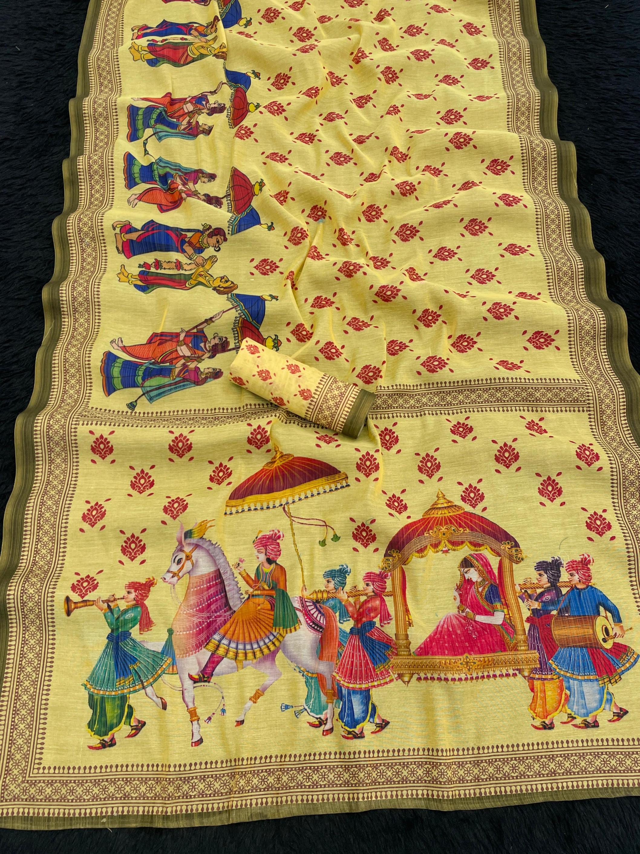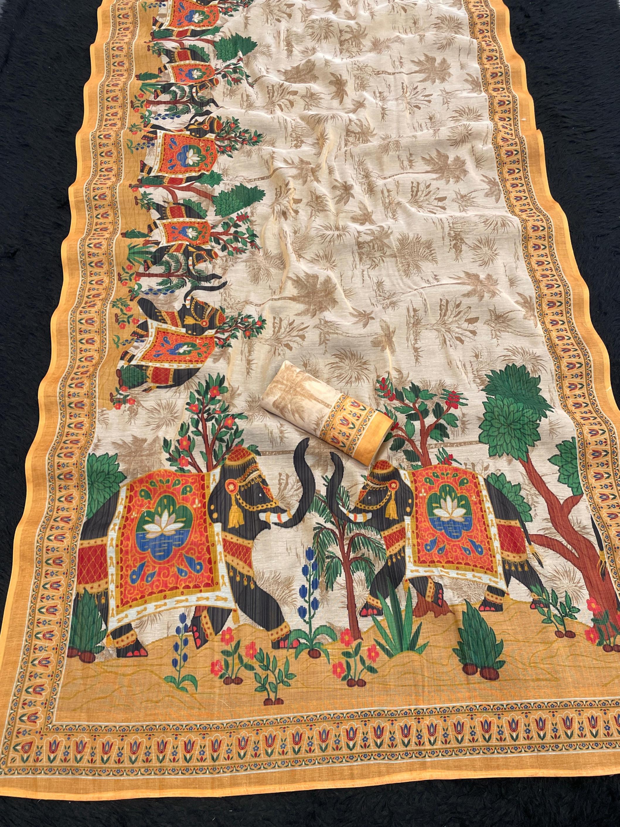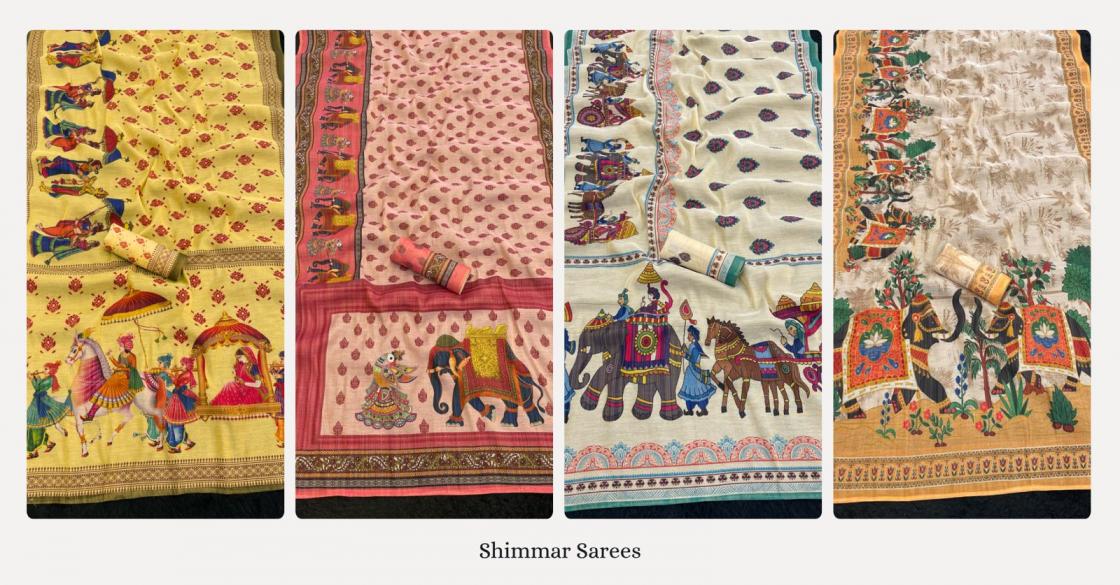 Shimmar Printed Sarees👜 Shimmar is a Shiny, Golden Zari fabric. Crafted in premium Yarn, this saree exudes richness with its smooth texture and vibrant hue.Ideal for cultural events, celebrations, and special evenings.The glossy finish of Dola Silk enhances the beauty of this saree, making it a statement piece.✨👜